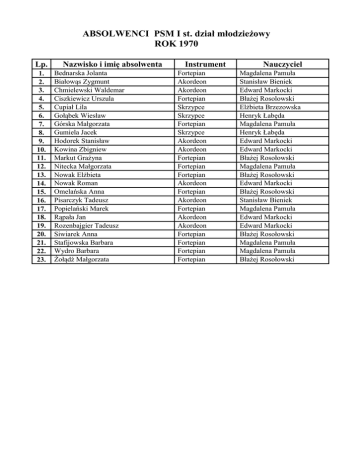ABSOLWENCI PSM I st. dział młodzieżowy ROK 1970 Lp. 1. 2. 3. 4. 5. 6. 7. 8. 9. 10. 11. 12. 13. 14. 15. 16. 17. 18. 19. 20. 21. 22. 23. Nazwisko i imię absolwenta Bednarska Jolanta Białowąs Zygmunt Chmielewski Waldemar Ciszkiewicz Urszula Cupiał Lila Gołąbek Wiesław Górska Małgorzata Gumiela Jacek Hodorek Stanisław Kowina Zbigniew Markut Grażyna Nitecka Małgorzata Nowak Elżbieta Nowak Roman Omelańska Anna Pisarczyk Tadeusz Popielański Marek Rąpała Jan Rozenbajgier Tadeusz Siwiarek Anna Stafijowska Barbara Wydro Barbara Żołądź Małgorzata Instrument Fortepian Akordeon Akordeon Fortepian Skrzypce Skrzypce Fortepian Skrzypce Akordeon Akordeon Fortepian Fortepian Fortepian Akordeon Fortepian Akordeon Fortepian Akordeon Akordeon Fortepian Fortepian Fortepian Fortepian Nauczyciel Magdalena Pamuła Stanisław Bieniek Edward Markocki Błażej Rosolowski Elżbieta Brzezowska Henryk Łabęda Magdalena Pamuła Henryk Łabęda Edward Markocki Edward Markocki Błażej Rosołowski Magdalena Pamuła Błażej Rosołowski Edward Markocki Błażej Rosołowski Stanisław Bieniek Magdalena Pamuła Edward Markocki Edward Markocki Błażej Rosołowski Magdalena Pamuła Magdalena Pamuła Błażej Rosołowski ABSOLWENCI PSM I st. dział młodzieżowy ROK 1971 Lp. 1. 2. 3. 4. 5. 6. 7. 8. 9. 10. Nazwisko i imię absolwenta Busch Adam Busz Aleksandra Klukowski Henryk Noworyta Jarosław Olejnik Zenon Pisarczyk Janusz Rojkowska Urszula Sobotka Lucyna Sobek Włodzimierz Warych Teresa Instrument Skrzypce Fortepian Akordeon Fortepian Akordeon Skrzypce Akordeon Fortepian Akordeon Akordeon Nauczyciel Elżbieta Brzezowska Krystyna Wielesik Edward Markocki Barbara Hetper Rosołowska Stanisław Bieniek Maria Cebula Stanisław Bieniek Błażej Rosołowski Edward Markocki Stanisław Bieniek ABSOLWENCI PSM I st. dział młodzieżowy ROK 1972 Lp. 1. 2. 3. 4. 5. 6. 7. 8. 9. 10. Nazwisko i imię absolwenta Baron Danuta Drąg Andrzej Guzek Wiktor Drąg Andrzej Jaworski Andrzej Krysa Andrzej Mierzwa Janusz Pelc Wiesław Pisarczyk Bożena Puskarczyk Krzysztof Instrument Fortepian Akordeon Akordeon Akordeon Akordeon Akordeon Akordeon Akordeon Fortepian Akordeon Nauczyciel Danuta Inglot-Kucybała Stanisław Bieniek Władysław Czub Stanisław Bieniek Władysław Czub Stanisław Bieniek Stanisław Bieniek Władysław Czub Danuta Inglot-Kucybała Stanisław Bieniek ABSOLWENCI PSM I st. dział młodzieżowy ROK 1973 Lp. 1. 2. 3. 4. 5. 6. 7. 8. 9. 10. 11. 12. Nazwisko i imię absolwenta Czuba Jerzy Jackowski Grzegorz Kochan Małgorzata Iwaszek Ryszard Matoga Danuta Nyrka Jacek Rodziewicz Anna Sabat Andrzej Soda Krystyna Stępień Urszula Surmacz Anna Szubartowski Bogusław Instrument Akordeon Skrzypce Fortepian Akordeon Fortepian Akordeon Skrzypce Fortepian Fortepian Fortepian Fortepian Akordeon Nauczyciel Władysław Czub Elżbieta Brzezowska Magdalena Pamuła Władysław Czub Danuta Inglot-Kucybała Władysław Czub Elżbieta Brzezowska Barbara Hetper-Rosołowska Błażej Rosołowski Danuta Inglot-Kucybała Błażej Rosołowski Władysław Czub ABSOLWENCI PSM I st. dział młodzieżowy ROK 1974 Lp. 1. 2. 3. 4. 5. 6. 7. 8. 9. 10. Nazwisko i imię absolwenta Dziura Stanisław Jakóbczak Elżbieta Kostrzewa Danuta Kruczek Wiesław Nędzyński Zbigniew Przychodzeń Alicja Tofil Kazimierz Tracz Magdalena Wańczyk Renata Wojecka Lucyna Instrument Akordeon Skrzypce Fortepian Akordeon Akordeon Fortepian Skrzypce Fortepian Fortepian Fortepian Nauczyciel Helena Wawrzusiak Elżbieta Brzezowska Barbara Hetper-Rosołowska Stanisław Bieniek Helena Wawrzusiak Błażej Rosołowski Łabęda Henryk Barbara Hetper-Rosołowska Danuta Inglot- Kucybała Barbara Grela ABSOLWENCI PSM I st. dział młodzieżowy ROK 1975 Lp. 1. 2. 3. 4. 5. 6. 7. 8. 9. Nazwisko i imię absolwenta Bródka Jarosław Gąsior Wojciech Górska Beata Kapusta Marzena Kiełczyński Krzysztof Moskal Aleksandra Niemiec Marek Omelańska Barbara Smoter Elżbieta Instrument Akordeon Fortepian Fortepian Fortepian Fortepian Fortepian Akordeon Akordeon Fortepian Nauczyciel Stanisław Bieniek Magdalena Pamuła Krystyna Wielesik Krystyna Wielesik Błażej Rosołowski Barbara Grela Stanisław Bieniek Helena Wawrzusiak Magdalena Pamuła ABSOLWENCI PSM I st. dział młodzieżowy ROK 1976 Lp. 1. 2. 3. 4. 5. 6. 7. 8. 9. 10. 11. 12. 13. 14. 15. 16. 17. 18. 19. 20. 21. Nazwisko i imię absolwenta Bidas Marek Błądek Irena Czub Wiesław Drzazga Jolanta Dziuba Ewa Jarosz Danuta Kara Roman Karlik Bożena Koczwara Stanisław Kuśmierska Maria Mastyło Konrad Orkusz Grażyna Smolińska Ewa Strumiłło Lidia Szast Mirosław Świercz Wiktor Topolewicz Anna Walczyszyn Andrzej Wańczyk Tadeusz Wątrobska Iwona Włodarczyk Beata Instrument Akordeon Fortepian Akordeon Fortepian Fortepian Fortepian Akordeon Fortepian Akordeon Skrzypce Fortepian Fortepian Fortepian Fortepian Fortepian Klarnet Fortepian Akordeon Akordeon Fortepian Fortepian Nauczyciel Stanisław Bieniek Irena Mospan Helena Wawrzusiak Barbara Grela Irena Mospan Barbara Grela Władysław Czub Barbara Hetper-Rosołowska Władysław Czub Elżbieta Brzezowska Barbara Grela Barbara Grela Teresa Skrzat Barbara Grela Krystyna Wielesik Janusz Hadała Barbara Grela Stanisław Bieniek Helena Wawrzusiak Magdalena Pamuła Teresa Skrzat ABSOLWENCI PSM I st. dział młodzieżowy ROK 1977 Lp. 1. 2. Nazwisko i imię absolwenta Sapińska Ewa Rogala Adam Instrument Klarnet Klarnet Nauczyciel Janusz Hadała Janusz Hadała ABSOLWENCI PSM I st. dział młodzieżowy ROK 1987 Lp. 1. 2. 3. Nazwisko i imię absolwenta Bieniecka Małgorzata Koza Katarzyna Montusiewicz Katarzyna Instrument Fortepian Wiolonczela Fortepian Nauczyciel Irena Mospan Grzegorz Rubacha Barbara Hetper-Rosołowska ABSOLWENCI PSM I st. dział młodzieżowy ROK 1988 Lp. 1. 2. 3. 4. 5. 6. 7. Nazwisko i imię absolwenta Duda Paweł Dziurska Luiza Jurkowska Dionizja Kita Barbara Marzec Dorota Pasierb Antoni Robak Grzegorz Instrument Akordeon Fortepian Wiolonczela Fortepian Wiolonczela 