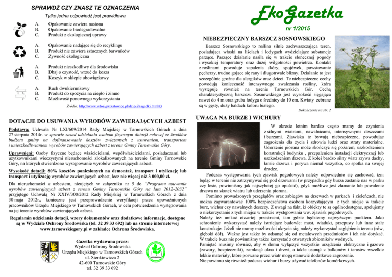 SPRAWDŹ CZY ZNASZ TE OZNACZENIA Tylko jedna odpowiedź jest prawidłowa A. B. C. Opakowanie zawiera nasiona Opakowanie biodegradowalne Produkt z ekologicznej uprawy A. B. C. Opakowanie nadające się do recyklingu Produkt nie zawiera sztucznych barwników śywność ekologiczna A. B. C. Produkt nieszkodliwy dla środowiska Dbaj o czystość, wrzuć do kosza Koszyk w sklepie obowiązkowy A. B. C. Ruch dwukierunkowy Produkt do spoŜycia na ciepło i zimno MoŜliwość ponownego wykorzystania Źródło: http://www.wfosigw.katowice.pl/dzieci/zagadki.html#3 EkoGazetka nr 1/2015 NIEBEZPIECZNY BARSZCZ SOSNOWSKIEGO Barszcz Sosnowskiego to roślina silnie zachwaszczająca teren, posiadająca włoski na liściach i łodygach wydzielające substancje parzące. Parzące działanie nasila się w trakcie słonecznej pogody i wysokiej temperatury oraz duŜej wilgotności powietrza. Kontakt z roślinami powoduje zapalenia skóry, spojówek, powstawanie pęcherzy, trudno gojące się rany i długotrwałe blizny. Działanie to jest szczególnie groźne dla alergików oraz dzieci. Te niebezpieczne cechy powodują konieczność intensywnego zwalczania rośliny, która występuje równieŜ na terenie Tarnowskich Gór. Cechą charakterystyczną barszczu Sosnowskiego jest wysokość sięgająca nawet do 4 m oraz gruba łodyga o średnicy do 10 cm. Kwiaty zebrane są w gęsty, duŜy baldach koloru białego. Dokończenie na str. 2 DOTACJE DO USUWANIA WYROBÓW ZAWIERAJĄCYCH AZBEST Podstawa: Uchwała Nr LXI/609/2014 Rady Miejskiej w Tarnowskich Górach z dnia 27 sierpnia 2014r. w sprawie zasad udzielania osobom fizycznym dotacji celowej ze środków budŜetu gminy na dofinansowanie kosztów związanych z usuwaniem, transportem i unieszkodliwianiem wyrobów zawierających azbest z terenu Gminy Tarnowskie Góry. Uprawnieni: Osoby fizyczne będące właścicielami, współwłaścicielami, posiadaczami lub uŜytkownikami wieczystymi nieruchomości zlokalizowanych na terenie Gminy Tarnowskie Góry, na których stwierdzono występowanie wyrobów zawierających azbest. Wysokość dotacji: 80% kosztów poniesionych na demontaŜ, transport i utylizację lub transport i utylizację wyrobów zawierających azbest, lecz nie więcej niŜ 3 000,00 zł. Dla nieruchomości z azbestem, nieujętych w załączniku nr 5 do “Programu usuwania wyrobów zawierających azbest z terenu Gminy Tarnowskie Góry na lata 2012-2032” przyjętego Uchwałą Nr XXIV/300/2012 Rady Miejskiej w Tarnowskich Górach z dnia 30 maja 2012r., konieczne jest przeprowadzenie weryfikacji przez upowaŜnionych pracowników Urzędu Miejskiego w Tarnowskich Górach, w celu potwierdzenia występowania na jej terenie wyrobów zawierających azbest. Regulamin udzielania dotacji, wzory dokumentów oraz dodatkowe informacje, dostępne są w Wydziale Ochrony Środowiska (tel. 32 39 33 692) lub na stronie internetowej www.tarnowskiegory.pl w zakładce Ochrona Środowiska. Gazetka wydawana przez: Wydział Ochrony Środowiska Urzędu Miejskiego w Tarnowskich Górach ul. Sienkiewicza 2 42-600 Tarnowskie Góry tel. 32 39 33 692 UWAGA NA BURZE I WICHURY Dokończenie na stronie 2 W okresie letnim bardzo często mamy do czynienia z silnymi wiatrami, nawałnicami, intensywnymi deszczami i burzami. Zjawiska te bywają niebezpieczne, powodując zagroŜenia dla Ŝycia i zdrowia ludzi oraz straty materialne. Uderzenie pioruna moŜe skończyć się poŜarem, uszkodzeniem konstrukcji budynku , przepaleniem instalacji elektrycznej lub uszkodzeniem drzewa. Z kolei bardzo silny wiatr zrywa dachy, łamie drzewa i porywa niemal wszystko, co spotka na swojej drodze. Podczas występowania tych zjawisk pogodowych naleŜy odpowiednio się zachować, tzn: będąc w terenie nie zatrzymywać się pod drzewami (w przypadku gdy burza zastanie nas w parku czy lesie, powinniśmy jak najszybciej go opuścić), gdyŜ moŜliwe jest złamanie lub powalenie drzewa na skutek wiatru lub uderzenia pioruna. Pomimo prowadzonych przeglądów oraz zabiegów na drzewach w parkach i zieleńcach, nie moŜna zagwarantować 100% bezpieczeństwa osobom korzystającym z tych miejsc w trakcie burz, wichur czy nawalnych deszczy. Z uwagi na fakt, iŜ obiekty te są ogólnodostępne, apelujemy o niekorzystanie z tych miejsc w trakcie występowania ww. zjawisk pogodowych. NaleŜy teŜ unikać otwartej przestrzeni, tam gdzie będziemy najwyŜszym punktem. Jako schronienie wykorzystać naleŜy istniejące budowle: most, wiadukt, przepusty lub inne stałe konstrukcje. JeŜeli nie mamy moŜliwości ukrycia się, naleŜy wykorzystać zagłębienia terenu (rów, głęboki dół). WaŜne jest takŜe by odsunąć się od metalowych przedmiotów i ich nie dotykać. W trakcie burz nie powinniśmy takŜe korzystać z otwartych zbiorników wodnych. Pamiętać musimy równieŜ, aby w domu wyłączyć wszystkie urządzenia elektryczne i gazowe (zawory, bezpieczniki), zamknąć okna i drzwi, a takŜe usunąć z balkonów i tarasów wszelkie lekkie materiały, które porwane przez wiatr mogą stanowić dodatkowe zagroŜenie. Nie powinno się równieŜ podczas wichur i burzy uŜywać telefonów komórkowych. NIEBEZPIECZNY BARSZCZ SOSNOWSKIEGO Dokończenie ze strony 1 ZWALCZANIE: Najprostszym sposobem zwalczania barszczu Sosnowskiego jest metoda mechaniczna. Najskuteczniejsze jest niszczenie jesienią roślin jednorocznych. Najbardziej powszechną metodą jest jej wykaszanie. Na ogół w ciągu jednego sezonu potrzebnych jest od 2 do 4 zabiegów koszenia. Zabieg wykaszania naleŜy wykonywać jak najbliŜej ziemi. Zalecane jest połączenie dwóch metod zwalczania tj. wykaszanie wraz z zabiegiem chemicznym. Zabieg chemiczny naleŜy wykonywać herbicydami zawierającymi glifosat. Oprysk wykonuje się po skoszeniu na nowo odrastające części zielone rośliny. Zabiegi te koniecznie naleŜy wykonywać przed owocowaniem, a najkorzystniej tuŜ przed lub w trakcie kwitnienia. UWAGA: NaleŜy unikać bezpośredniego kontaktu z tą rośliną. P