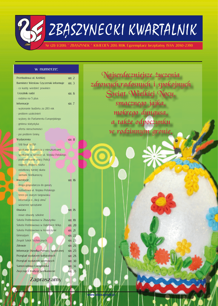 ZBASZYNECKI KWARTALNIK , Nr (21) 1/2014 * ZBĄSZYNEK * KWIECIEŃ 2014 ROK Egzemplarz bezpłatny ISSN 2080-2390 w numerze: Przebudowa ul. Krótkiej str. 2 Burmistrz Wiesław Czyczerski informuje str. 3 - co każdy wiedzieć powinien Urzędnik radzi str. 6 - rodzina na 5 plus str. 7 Informacje - wykonanie budżetu za 2013 rok - problem uzależnień - wybory do Parlamentu Europejskiego - gminna statystyka - oferta nieruchomości - psi problem Gminy Wydarzenia Najserdeczniejsze życzenia zdrowych,radosnych i spokojnych Świąt Wielkiej Nocy, smacznego jajka, mokrego dyngusa, a także odpoczynku w rodzinnym gronie. str. 11 - XXII finał WOŚP - spotkanie Burmistrza z mieszkańcami - spotkanie w sprawie ul. Wojska Polskiego - podsumowanie pracy Policji - nagrody Regionu Kozła - ostatkowy turniej skata - Jarmark Wielkanocny str. 16 Inwestycje - droga gospodarcza do garaży - rozbudowa ul. Wojska Polskiego - teren po starym targowisku - informacja o „Akcji zima” - wiosenne sprzątanie str. 18 Oświata - nowe obwody szkolne Szkoła Podstawowa w Zbąszynku str. 19 Szkoła Podstawowa w Dąbrówce Wlkp. str. 20 Szkoła Podstawowa w Kosieczynie str. 21 Gimnazjum str. 22 Zespół Szkół Technicznych str. 23 Zdrowie str. 24 Informacje Ośrodka Pomocy Społecznej str. 25 Przegląd wydarzeń kulturalnych str. 28 Przegląd wydarzeń sportowych str. 30 Samorządowa Łamigłówka str. 34 Zwyczaje i tradycje wielkanocne str. 35 Zapraszamy www.zbaszynek.pl ZBASZYNECKI KWARTALNIK , INWESTYCJE Uwaga !!! W związku z planowaną przebudową, na pewien czas wyłączona z ruchu zostanie ul. Krótka i odcinek ul. Długiej. Powstaną czasowe problemy z parkowaniem i dojazdem samochodów do parkingu osiedlowego (wjazd od ul. Krótkiej) i wjazdem na posesje mieszkańców ulicy Krótkiej. Szczegółowy harmonogram czasowego zamknięcia ulic zostanie określony po podpisaniu umowy z wykonawcą robót. O wprowadzonych zmianach poinformujemy mieszkańców ul. Krótkiej na około 10 dni przed terminem zamknięcia ulicy. 2 platanych rzędami kostki kamiennej. Zostaną przebudowane skrzyżowania ulicy Krótkiej z ulicą Wojska Polskiego i Długą. Na odcinku 100 m ulicy Długiej powstanie 12 miejsc postojowych dla samochodów osobowych. Nawierzchnia z trylinki zostanie wymieniona na brukową kostkę kamienną. Nawierzchnie ulic będą również z rozbiórkowej kostki kamiennej. Wzdłuż ulicy Krótkiej w miejscu ciągu pieszego zostanie zlokalizowana kanalizacja deszczowa i oświetlenie uliczne. Planowany termin realizacji inwestycji to okres od kwietnia do końca września br. Plan zagospodarowania ulicy dostępny na stronie internetowej www.zbaszynek.pl w zakładce bieżące inwestycje www.zbaszynek.pl ZBASZYNECKI KWARTALNIK , Jeszcze w tym roku zostanie wykonana przebudowa ulicy Krótkiej i odcinka ulicy Długiej w Zbąszynku. Planowana inwestycja oprócz rozbiórki istniejących nawierzchni z kamiennej kostki brukowej i drogowych płyt sześciokątnych „trylinki” wymaga również rozbiórki pozostałych elementów takich jak chodniki, krawężniki, obrzeża. Rozebrany zostanie blaszany hangar, słupy oświetlenia ulicznego itp. Projekt zakłada rozbudowę jezdni ulicy Krótkiej do układu dwóch jezdni jednokierunkowych, jednopasmowych o szer. 3,50 m każda ze środkowym pasem rozdziału w postaci ciągu pieszego o szerokości 4 m i obustronnymi chodnikami. Ciąg pieszy zostanie wykonany z płyt granitowych prze- Wydawca: Urząd Miejski w Zbąszynku ul. Rynek 1 66-210 Zbąszynek Tel. 68 384 91 40; fax: 66 384 94 84 Nakład: 1 500 egzemplarzy. Autorzy tekstów i zdjęć: pracownicy Urzędu Miejskiego w Zbąszynku i jednostek organizacyjnych pod redakcją Sekretarza Gminy. e-mail: [email protected] www.zbaszynek.pl ZBASZYNECKI KWARTALNIK , BURMISTRZ WIESŁAW CZYCZERSKI INFORMUJE Wiesław Czyczerski CO KAŻDY WIEDZIEĆ POWINIEN Szanowni Państwo! Pierwszy kwartał 2014 roku mamy już za sobą. Tym samym jesteśmy już w pełni prac inwestycyjnych i organizacyjnych przewidzianych na ten rok. Pragnę przedstawić Państwu trzy tematy, które moim zdaniem są istotne dla rozwoju naszej Gminy. Inwestycje: Zadania zaplanowane i już realizowane w 2014 r. - Kontynuacja budowy ścieżki rowerowej Dąbrówka Wlkp. - Zbąszynek. Termin realizacji - maj 2014r. - Budowa kolejnego zbiornika retencyjnego przy oczyszczalni ścieków, którego celem jest przejmowanie wody zalewającej wiadukty przy cmentarzu. Zadanie zrealizowane w m-cu marcu 2014r. - Dokończenie utwardzenia drogi za blokiem między ul. Poznańską a „Domem Norwega”. Zadanie zrealizowane. - Wykończenie, obsianie trawą i zawałowanie terenu pod zbiornik rokadowy na Placu Wolności. Zadanie zakończone w I kw. 2014 r. - Rozstrzygnięcie przetargu na przebudowę ul. Krótkiej. Termin realizacji, wrzesień 2014 r. - Rozstrzygnięcie procedury przetargowej na budowę II etapu „Obwodnicy Północnej Zbąszynka” - Wykonanie dokumentacji przebudowy ul. Wojska Polskiego i uzyskanie pozwolenia na budowę. Dokumentacja uwzględnia uwagi zebrane podczas konsultacji koncepcji. - Zlecenie dokumentacji na przebudowę byłego targowiska przy ul. Długiej i ul. Sportowej - Zlecenie dokumentacji na przebudowę ul. Poznańskiej i budowę łącznika między ul. Piastowską a ul. Zbąszyńską w Dąbrówce Wlkp. - Ogłoszenie przetargu ofertowego na budowę parkingów w Kosieczynie przy Sali Wiejskiej i Szkole Podstawowej. - Ogłoszenie przetargu ofertowego na budowę drogi między ogrodami od ul. Klubowej do Wąskiej. - Zlecenie przygotowania terenu pod place zabaw przy ul. Małej w Zbąszynku i za Szkołą Podstawową w Dąbrówce Wlkp. - Złożenie wniosku na dofinansowanie wykonania nawierzchni na boisku w Rogozińcu. Są to tylko niektóre tematy realizowane w tym kwartale, ich efekt już oceniamy, a niektórych ocenimy w przyszłości. Oświata: Jak ważnym tematem naszej działalności jest szeroko rozumiana oświata niech świadczą środki finansowe przeznaczane n