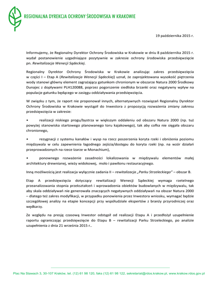 19 października 2015 r. Informujemy, że Regionalny Dyrektor Ochrony Środowiska w Krakowie w dniu 8 października 2015 r. wydał postanowienie uzgadniające pozytywnie w zakresie ochrony środowiska przedsięwzięcie pn. Rewitalizacja Wenecji Sądeckiej. Regionalny Dyrektor Ochrony Środowiska w Krakowie analizując zakres przedsięwzięcia w części I – Etap A (Rewitalizacja Wenecji Sądeckiej) uznał, że zaprojektowana wysokość piętrzenia wody stanowi główny element zagrażający gatunkom chronionym w obszarze Natura 2000 Środkowy Dunajec z dopływami PLH120088, poprzez pogorszenie siedliska brzanki oraz negatywny wpływ na populacje gatunku będącego w zasięgu oddziaływania przedsięwzięcia. W związku z tym, że raport nie proponował innych, alternatywnych rozwiązań Regionalny Dyrektor Ochrony Środowiska w Krakowie wystąpił do Inwestora z propozycją rozważenia zmiany zakresu przedsięwzięcia w zakresie: • realizacji niskiego progu/bystrza w większym oddaleniu od obszaru Natura 2000 (np. tuż powyżej stanowiska startowego planowanego toru kajakowego), tak aby cofka nie sięgała obszaru chronionego, • rezygnacji z systemu kanałów i wysp na rzecz poszerzenia koryta rzeki i obniżenia poziomu międzywala w celu zapewnienia łagodnego zejścia/dostępu do koryta rzeki (np. na wzór działań przeprowadzonych na rzece Izarze w Monachium), • ponownego rozważenie zasadności lokalizowania w międzywalu elementów małej architektury drewnianej, wieży widokowej, molo i pawilonu restauracyjnego. Inną możliwością jest realizacja wyłącznie zadania II – rewitalizacja „Parku Strzeleckiego” – obszar B. Etap A przedsięwzięcia dotyczący rewitalizacji Wenecji Sądeckiej wymaga rzetelnego przeanalizowania stopnia przekształceń i wprowadzenia obiektów budowlanych w międzywalu, tak aby skala oddziaływań nie generowała znaczących negatywnych oddziaływań na obszar Natura 2000 – dlatego też zakres modyfikacji, w przypadku ponowienia przez Inwestora wniosku, wymagać będzie szczegółowej analizy na etapie koncepcji przy współudziale ekspertów z branży przyrodniczej oraz wędkarzy. Ze względu na presję czasową Inwestor odstąpił od realizacji Etapu A i przedłożył uzupełnienie raportu ograniczając przedsięwzięcie do Etapu B – rewitalizacji Parku Strzeleckiego, po analizie uzupełnienia z dnia 21 września 2015 r.. Plac Na Stawach 3, 30-107 Kraków, tel. (12) 61 98 120, faks (12) 61 98 122, [email protected], www.krakow.rdos.gov.pl