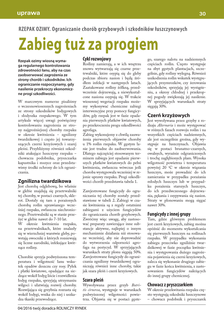 uprawa aktualności 30 RZEPAK OZIMY. Ograniczanie chorób grzybowych i szkodników łuszczynowych Zabieg tuż za progiem Rzepak ozimy wiosną wymaga regularnego kontrolowania zdrowotności łanu, aby na czas zaobserwować zagrożenia ze strony chorób i szkodników. Ich ograniczanie rozpoczynamy, gdy nasilenie przekroczy ekonomiczne progi szkodliwości. W marcowym numerze pisaliśmy o wczesnowiosennych zagrożeniach ze strony szkodników łodygowych i słodyszka rzepakowego. W tym artykule więcej uwagi poświęcimy kontrolowaniu zagrożenia ze strony najgroźniejszej choroby rzepaku w okresie kwitnienia ‒ zgnilizny twardzikowej i często jej towarzyszących czerni krzyżowych i szarej pleśni. Przybliżymy również szkodniki atakujące łuszczyny rzepaku ‒ chowacza podobnika, pryszczarka kapustnika i mszyce oraz przedstawimy środki ochrony do ich ograniczania. Zgnilizna twardzikowa Jest chorobą odglebową, bo właśnie w glebie znajdują się przetrwalniki tej choroby, w postaci czarnych, sklerot. Dostały się tam z porażonych chorobą roślin uprawianego wcześniej rzepaku, zwłaszcza niechronionego. Przetrwalniki są w stanie przeżyć w glebie nawet do 7-10 lat. W okresie kwitnienia rzepaku, na przetrwalnikach, które znalazły się w wierzchniej warstwie gleby, powstają owocniki z których rozsiewają się liczne zarodniki, infekujące kwitnące rośliny. Chorobie sprzyja podwyższona temperatura i wilgotność łanu wskutek opadów deszczu czy rosy. Pyłek i płatki kwiatowe, opadające na siedzące wokół łodyg liście i rozwidlenia łodyg rzepaku, sprzyjają utrzymaniu wilgoci i ułatwiają rozwój choroby. Rozwijająca się grzybnia rozrasta się wokół łodygi, wnika do niej i uszkadza tkanki przewodzące. Cykl rozwojowy Rośliny zamierają, a w ich wnętrzu znowu wytwarzają się czarne przetrwalniki, które osypią się do gleby podczas zbioru nasion i będą źródłem infekcji w następnych latach. Zaatakowane rośliny żółkną, przedwcześnie dojrzewają, a niewykształcone nasiona osypują się. W trakcie wiosennej wegetacji rzepaku możemy wykonywać chemiczne zabiegi interwencyjne przy pomocy fungicydów, gdy rzepak jest w fazie opadania pierwszych płatków kwiatowych, po przekroczeniu progu szkodliwości agrofaga. Zabieg wykonujemy z chwilą zauważenia pierwszych objawów choroby u 1% roślin rzepaku. W gęstym łanie jest trudne do zaobserwowania. Dlatego najczęściej stosowanym terminem zabiegu jest opadanie pierwszych płatków kwiatowych do pełni kwitnienia, zwłaszcza wówczas jeśli choroba występowała wcześniej w rejonie uprawy rzepaku. Progi szkodliwości chorób przedstawia tabela 1. Zarejestrowane fungicydy do ograniczania tej choroby zostały przedstawione w tabeli 2. Zabiegi w czasie kwitnienia są z reguły ostatnimi zabiegami z użyciem fungicydów do ograniczania chorób grzybowych. Zwróćmy więc uwagę, aby zastosować preparaty zawierające inne substancje aktywne, najlepiej o innym mechanizmie działania niż stosowane wcześniej, aby nie doprowadzić do wytworzenia odporności agrofaga na pestycyd. W sprzyjających warunkach straty plonu sięgają 50%. Zarejestrowane fungicydy do ograniczania zgnilizny twardzikowej ograniczają również inne choroby, takie jak szara pleśń i czerń krzyżowych. Szara pleśń Wywoływana przez grzyb Botritis cirnerea, występuje w warunkach podwyższonej wilgotności powietrza. Objawia się w postaci gęste- 04/2016 twój doradca ROLNICZY RYNEK go, szarego nalotu na nadziemnych częściach roślin. Często występuje na zbyt gęstych plantacjach, szczególnie, gdy rośliny wylegną. Również uszkodzenia roślin wskutek występujących przymrozków, czy żerowania szkodników, sprzyjają jej wystąpieniu, a okresy chłodnej i przekropnej pogody zwiększają jej nasilenie. W sprzyjających warunkach straty sięgają 30%. Czerń krzyżowych Jest wywoływana przez grzyby z rodzaju Alternaria i może występować w różnych fazach rozwoju roślin i na wszystkich częściach nadziemnych, ale jest szczególnie groźna, gdy występuje na łuszczynach. Objawia się w postaci brunatno-czarnych, owalnych, wyraźnie odgraniczonych i trochę zagłębionych plam. Wysoka wilgotność powietrza i temperatura powyżej 20 oC w okresie wiązania łuszczyn, może prowadzić do ich zamierania w przypadku porażania młodych łuszczyn lub w przypadku porażenia starszych łuszczyn, do ich przedwczesnego dojrzewania, pękania i osypywania się nasion. Straty w plonowaniu mogą sięgać nawet 30%. Fungicydy z innej grupy Tam, gdzie głównym problemem jest czerń krzyżowych, zabieg można opóźnić do momentu wykształcania się pierwszych łuszczyn na roślinach rzepaku. W przypadku wykonania zabiegu przeciwko zgniliźnie twardzikowej w fazie początku kwitnienia i występowania dużego zagrożenia pojawienia się czerni krzyżowych, zaleca się wykonanie drugiego zabiegu w fazie końca kwitnienia, z zastosowaniem fungicydów należących do innej grupy chemicznej. Chowacz z pryszczarkiem W okresie przekwitania rzepaku często występują szkodniki łuszczynowe – chowacz podobnik i pryszczarek uprawa 31 Tabela 1. Progi szkodliwości chorób rzepaku wiosną Choroba Faza rozwojowa i termin zwalczania Zgnilizna twardzikowa Od zwartego pąka do pełni kwitnienia środki stosować podczas pierwszych oznak choroby Regeneracja rozety i początek formowania łodygi do wyrastania w pęd kwiatowy Od początku do pełni kwitnienia Czerń krzyżowych Szara pleśń Progi* % Warunki sprzyjające Temperatura gleby i powietrza pow. 12 0C, gleba wilgotna 1 20-30 10-15 Ciepła, wilgotna pogoda 10-15 Temperatura 21-27 0C, duża wilgotność Wilgotna pogoda, temperatura 14-16 0C, uszkodzenia i osłabienie roślin Duża wilgotność, uszkodzenia roślin, umiarkowana temperatura Koniec kwitnienia i początek zawiązywania łuszczyn Regeneracja rozety i początek formowania łodygi do wyrastania w pęd kwiatowy Od początku do peł
