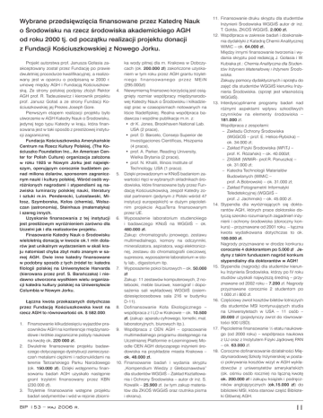 Wybrane przedsięwzięcia finansowane przez Katedrę Nauk o Środowisku na rzecz środowiska akademickiego AGH od roku 2000 tj. od początku realizacji projektu donacji z Fundacji Kościuszkowskiej z Nowego Jorku. Projekt autorstwa prof. Janusza Gołasia zaakceptowany został przez Fundację po prawie dwuletniej procedurze kwalifikacyjnej, a realizowany jest w oparciu o podpisaną w 2000 r. umowę między AGH i Fundacją Kościuszkowską. Ze strony polskiej podpisy złożyli Rektor AGH prof. R. Tadeusiewicz i kierownik projektu prof. Janusz Gołaś a ze strony Fundacji Kościuszkowskiej jej Prezes Joseph Gore. Pierwszym etapem realizacji projektu było utworzenie w AGH Katedry Nauk o Środowisku, jedynej tego typu Katedry w kraju, która finansowana jest w taki sposób z prestiżowej instytucji zagranicznej. Fundacja Kościuszkowska Amerykańskie Centrum na Rzecz Kultury Polskiej, (The Kościuszko Foundation Inc., An American Center for Polish Culture) organizacja założona w roku 1925 w Nowym Jorku jest największym, operującym corocznie budżetem ponad miliona dolarów, sponsorem zagranicznym nauki i kultury polskiej. Wśród osób wyróżnionych nagrodami i stypendiami są nazwiska luminarzy polskiej nauki, literatury i sztuki m.in. Penderecki, Lutosławski, Miłosz, Szymborska, Kołos (chemia), Wolszczan (astronomia), Steinhaus (matematyka) i szereg innych. Uzyskanie finansowania z tej instytucji jest prestiżowym wyróżnieniem zarówno dla Uczelni jak i dla realizatorów projektu. Finasowanie Katedry Nauk o Środowisku wieloletnią donacją w kwocie ok.1 mln dolarów jest unikalnym wydarzeniem w skali kraju natomiast chyba zbyt mało znanym w samej AGH. Dwie inne katedry finansowane w podobny sposób z tych źródeł to: katedra filologii polskiej na Uniwersytecie Harvarda (kierowana przez prof. S. Barańczaka) i niedawno utworzona wysiłkiem wielu organizacji katedra kultury polskiej na Uniwersytecie Columbia w Nowym Jorku. Łączna kwota przekazanych dotychczas przez Fundację Kościuszkowska kwot na rzecz AGH to równowartość ok. $ 582.000. 1. Finansowanie kilkudziesięciu wyjazdów pracowników AGH na konferencje międzynarodowe i krótkie zagraniczne pobyty naukowe na kwotę ok. 220 000 zł. 2. Dwuletnie finansowanie projektu badawczego dotyczącego dystrybucji zanieczyszczeń metalami ciężkimi i radionuklidami na terenie Tatrzańskiego Parku Narodowego (ok. 150.000 zł). Dzięki wstępnemu finansowaniu badań AGH uzyskało następnie grant trzyletni finansowany przez KBN (230.000 zł). 3. Trzyletnie finansowanie wstępne projektu badań sedymentów i wód w rejonie zbiorni- BIP 153 – maj 2006 r. 4. 5. 6. 7. 8. 9. 10. ka wody pitnej dla m. Krakowa w Dobczycach (ok. 200.000 zł) zakończone uzyskaniem w tym roku przez AGH grantu trzyletniego finansowanego przez MEiN (295.000zł) Niewymierną finansowo korzyścią jest osiągnięty rozmiar współpracy międzynarodowej Katedry Nauk o Środowisku i kilkadziesiąt prac w czasopismach notowanych na liście filadelfijskiej. Realna współpraca badawcza i wspólne publikacje m.in. z: • dr K. Jones, Brookhaven National Lab. USA (2 prace), • prof. D. Barcelo, Consejo Superior de Investigaciones Cientificas, Hiszpania (4 prace), • prof. A. Parker, Reading University, Wielka Brytania (2 prace), • prof. N. Khalili, Illinois Institute of Technology, USA (1 praca). Dzięki prowadzonym w KNoŚ badaniom zawartości rtęci w wybranych składnikach środowiska, które finansowane były przez Fundację Kościuszkowską, zespół Katedry został partnerem (jedynym z Polski wśród 47 instytucji europejskich) w dużym pięcioletnim projekcie AquaTerra finansowanym przez UE. Wyposażenie laboratorium studenckiego i badawczego KNoŚ na WGGiIŚ – ok. 480.000 zł. Zakup: chromatografu jonowego, zestawu multimedialnego, komory na odczynniki, mineralizatora, aspiratora, wagi elektronicznej, zestawu do chromatografii cieczowej, supresora, wyposażenie laboratorium w stoły lab., digestorium itp. Wyposażenie pokoi biurowych – ok. 50.000 zł Zakup: 11 zestawów komputerowych, 2 notebooki, meble biurowe, kserograf i doposażenia sali wykładowej WGGiIŚ (osiemdziesięcioosobowa sala 216 w budynku D-11). Dofinansowanie Koła Ekologicznego – współpraca z I LO w Krakowie – ok. 10.500 zł. (zakup: aparatu cyfrowego, lornetki, mat. laboratoryjnych, biurowych itp.). Współpraca z OEN AGH – opracowanie multimedialnego programu dostępnego na Uczelnianej Platformie e-Learningowej Moodle OEN AGH dotyczącego inżynierii środowiska na przykładzie miasta Krakowa – ok. 48.000 zł. Finansowanie badań i wydania skryptu „Kompendium Wiedzy z Gleboznawstwa” dla studentów WGGiIŚ – Zakład Kształtowania i Ochrony Środowiska – autor dr inż. S. Kowalik – 25.900 zł. (w tym zakup materiałów dla ZKiOŚ WGGiIŚ oraz rzutnika pisma i ekranu). 11. Finansowanie druku skryptu dla studentów Inżynierii Środowiska WGGiIŚ autor dr inż. T. Gołda, ZKiOŚ WGGiIŚ, 2.000 zł. 12. Współpraca w zakresie badań i doskonalenia dydaktyki z Katedrą Chemii Analitycznej WIMiC – ok. 64.000 zł. Między innymi finansowanie tworzenia i wydania skryptu pod redakcją J. Gołasia i W. Kubiaka pt.: Chemia Analityczna dla Studentów Inżynierii żżynierii Materiałłowej i Inżynierii ż żynierii Środowiska. Zakupy pomocy dydaktycznych i sprzętu do zajęć dla studentów WGGiIŚ kierunku Inżynieria Środowiska. (sprzęt jest własnością WGGiIŚ). 13. Interdyscyplinarne programy badań nad różnymi aspektami wpływu szkodliwych czynników na elementy środowiska – 181.000 zł. Współpraca z zespołami: – Zakładu Ochrony Środowiska (WGGiOŚ – prof. E. Helios-Rybicka) – ok. 34.000 zł; – Zakład Fizyki Środowiska (WFiTJ – prof. K. Różański) – ok. 40.000zł; – ZASiMI (WIMiR– prof.R. Panuszka) – ok. 31.000 zł; – Katedra Technologii Materiałów Budowlanych (WIMiC – prof. A.Bobrowski) – ok. 31.000 zł; – Zak