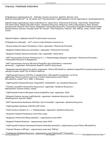 Wirtualna Bydgoszcz Imprezy i festiwale kulturalne W Bydgoszczy organizowane są festiwale i imprezy muzyczne, teatralne, filmowe i inne. Można doliczyć się ok. 20 imprez międzynarodowych i ogólnopolskich oraz 60 regionalnych i ponadregionalnych. Najważniejsi organizatorzy imprez kulturalnych to: Opera Nova, Filharmonia Pomorska, Teatr Polski, Wojewódzki Ośrodek Kultury, Miejski Ośrodek Kultury, Akademia Muzyczna, Medyczna, Pałac Młodzieży, Biuro Wystaw Artystycznych, Muzeum Okręgowe, Bydgoskie Towarzystwo Muzyczne, Towarzystwo Przyjaźni Polsko-Francuskiej, Stowarzyszenie Jazzowe, fundacja sztuki "Art.-House", Teatr Plastyczny "Witryna", klub "Mózg", Adria, LKPiW i wiele innych. Najważniejsza i najlepiej rozwinięta jest kultura muzyczna. W Bydgoszczy odbywają się znane w kraju festiwale muzyczne np.: * Musica Antiqua Europae Orientalis(co 3 lata) organizator: Filharmonia Pomorska * Bydgoski Festiwal Muzyczny (wrzesień) organizator: Filharmonia Pomorska * Bydgoski Festiwal Operowy (kwiecień-maj) organizator: Opera Nova * Międzynarodowy Konkurs Pianistyczny im. I.J. Paderewskiego (listopad) organizator: Filharmonia Pomorska i Towarzystwo Muzyczne w Bydgoszczy * Międzynarodowy Konkurs Młodych Pianistów Artur Rubinstein in memoriam (kwiecień) - organizator: Państwowy Zespół Szkół Muzycznych * Bydgoskie Impresje Muzyczne (lipiec)- organizator: Pałac Młodzieży, spotkania zespołów muzyczno-tanecznych z całego świata, występy na Starym Mieście * Ogólnopolski Konkurs Chórów a Capella Dzieci i Młodzieży (kwiecień)- od 23 lat najbardziej masowa impreza muzyczna w Polsce organizowana przez Pałac Młodzieży, przejęta w 1988r. z Warszawy * Ogólnopolski Festiwal Młodych Organistów i Wokalistów org. Akademia Muzyczna * Festiwal Laureatów Konkursów Muzycznych organizator: Akademia Muzyczna z Mazowieckim Centrum Kultury i Sztuki * Ogólnopolski Konkurs Młodych Instrumentalistów (maj) organizator: WOK * Bydgoski Festiwal Jazzowy (październik) organizator: Akademia Muzyczna, MOK, Stowarzyszenie Jazzowe "Eljazz" * Międzynarodowe Spotkania Chóralne "Arti et Amicitate" organizator: Akademia Muzyczna * Ogólnopolskie Spotkania Chórów Męskich * Polski Konkurs Wokalny im. I. J. Paderewskiego organizator: Akademia Muzyczna * Studencki Festiwal Pianistyczny Forte Piano (maj) * Bydgoszcz Harmonica Miting (sierpień) - organizowany przez MOK * Bydgoski Festiwal Bluesowy - organizowany przez WOK * Ogólnopolski Festiwal Interpretacji Piosenki Aktorskiej (kwiecień)- organizowany przez Pałac Młodzieży * Festiwal "Muzyka z Mózgu" - organizowany przez klub "Mózg" * Festiwalowe Spotkania Muzyczne - organizowany przez Filharmonię Pomorską http://wirtualnabydgoszcz.pl _PDF_POWERED _PDF_GENERATED 4 March, 2017, 06:09 Wirtualna Bydgoszcz * Międzynarodowy Dzień Muzyki - organizowany przez Filharmonię Pomorską * Przegląd Amatorskich Zespołów Muzycznych "Muzyczny Ogród" (czerwiec-wrzesień) organizator: WOK * Bydgoskie Wtorki Muzyczne organizowane co tydzień przez Akademię Muzyczną * Czwartkowe Koncerty Organowe - organizowane co tydzień przez Akademię Muzyczną * Poranki Muzyczne dla dzieci niepełnosprawnych - organizowane przez Akademię Muzyczną we współpracy z Polskim Towarzystwem Walki z Kalectwem Oddział w Bydgoszczy * Konkurs Orkiestr Dętych o puchar Marszałka Województwa K-P * Konkurs na Fugę - organizowany przez Akademię Muzyczną dla studentów * Bydgoskie Artystyczne Lato (kwiecień-wrzesień) cotygodniowe występy regionalnych zespołów kulturalnych w amfiteatrze parku im. Witosa organizowane przez MOK * Ogólnopolski Festiwal Interpretacji Piosenki Aktorskiej (kwiecień)- organizowany przez Pałac Młodzieży * Studenckie Warsztaty Operowe - organizowane przez Akademię Muzyczną * Coroczny Koncert Józefa Szurka in memoriam * Ogólnopolskie Konkursy Pieśni Pasyjnej i inne. Kultura teatralna również się rozwija, czego wyrazem jest organizowany od 2002r. jedyny w Polsce Festiwal Teatralny Prapremier (wrzesień), czy też Międzynarodowy Miting Teatralny (maj) Oprócz teatru państwowego utrzymywanego przez władze miejskie, w Bydgoszczy znajduje się również kilka teatrów amatorskich. Imprezy i festiwale filmowe również są w Bydgoszczy obecne np.: * Ogólnopolski Festiwal Reportażu i Dokumentu Telewizyjnego "Camera Obscura" (listopad) organizowany przez fundację sztuki ART-House * Jesienne Spotkania Filmowe Dyskusyjnego Klubu Filmowego "Mozaika * Ogólnopolskie Seminarium Filmowe * Wojewódzki Przegląd Amatorskich filmów krótkometrażowych * Wczesne wieczory filmowe - przegląd filmów niezależnych organizator: klub "Mózg" * Młode Kino Europejskie festiwal toruński odbywany czasem równolegle w Bydgoszczy Z uwagi na Multikino obecne w Bydgoszczy od 2001r., oferta filmów jest największa w regionie. Kilka kin studyjnych oferuje bardziej ambitne dzieła np. "Adria", kino klubu "Mózg", czy kino Pałacu Młodzieży. W lecie organizowane jest samochodowe kino letnie w Parku w Myślęcinku. Bydgoska kultura klubowa stoi na niezłym poziomie. Szczególnie wyróżnia się klub "Mózg", którego renoma jest ogólnopolska. http://wirtualnabydgoszcz.pl _PDF_POWERED _PDF_GENERATED 4 March, 2017, 06:09 Wirtualna Bydgoszcz Malarstwo, fotografia, plastyka, sztuka użytkowa, performance wyrażają się w wielu wystawach prezentowanych przez około 30 galerii bydgoskich. Szczególne znaczenie ma Biuro Wystaw Artystycznych oraz Muzeum Okręgowe im. L.Wyczółkowskiego. Do niektórych corocznych festiwali, konkursów należą: * Ogólnopolski Konkurs Malarski im. Teofila Ociepki - organizowany przez WOK (Czerwony Spichrz) * Ogólnopolski Konkurs Poezji i Prozy Francuskiej - organizowany przez Towarzystwo Przyjaźni Polsko-Francuskiej w Pałacu Młodzieży * Biennale Fotografii Bydgoskiej (wrzesień) - organizowany przez BWA * Noc Kulturalna - Performance Act * Biennale Plastyki Bydgoskiej - organizowane przez BWA * Dni Kul