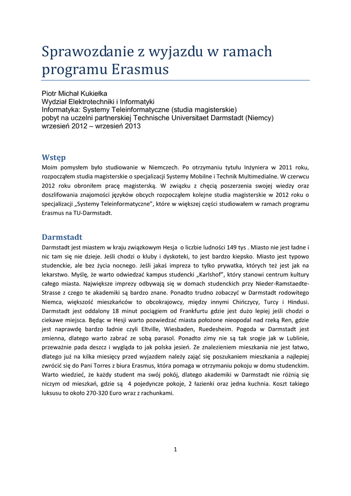 Sprawozdanie z wyjazdu w ramach programu Erasmus Piotr Michał Kukiełka Wydział Elektrotechniki i Informatyki Informatyka: Systemy Teleinformatyczne (studia magisterskie) pobyt na uczelni partnerskiej Technische Universitaet Darmstadt (Niemcy) wrzesień 2012 – wrzesień 2013 Wstęp Moim pomysłem było studiowanie w Niemczech. Po otrzymaniu tytułu Inżyniera w 2011 roku, rozpocząłem studia magisterskie o specjalizacji Systemy Mobilne i Technik Multimedialne. W czerwcu 2012 roku obroniłem pracę magisterską. W związku z chęcią poszerzenia swojej wiedzy oraz doszlifowania znajomości języków obcych rozpocząłem kolejne studia magisterskie w 2012 roku o specjalizacji „Systemy Teleinformatyczne”, które w większej części studiowałem w ramach programu Erasmus na TU-Darmstadt. Darmstadt Darmstadt jest miastem w kraju związkowym Hesja o liczbie ludności 149 tys . Miasto nie jest ładne i nic tam się nie dzieje. Jeśli chodzi o kluby i dyskoteki, to jest bardzo kiepsko. Miasto jest typowo studenckie, ale bez życia nocnego. Jeśli jakaś impreza to tylko prywatka, których też jest jak na lekarstwo. Myślę, że warto odwiedzać kampus studencki „Karlshof”, który stanowi centrum kultury całego miasta. Największe imprezy odbywają się w domach studenckich przy Nieder-RamstaedteStrasse z czego te akademiki są bardzo znane. Ponadto trudno zobaczyć w Darmstadt rodowitego Niemca, większość mieszkańców to obcokrajowcy, między innymi Chińczycy, Turcy i Hindusi. Darmstadt jest oddalony 18 minut pociągiem od Frankfurtu gdzie jest dużo lepiej jeśli chodzi o ciekawe miejsca. Będąc w Hesji warto pozwiedzać miasta położone nieopodal nad rzeką Ren, gdzie jest naprawdę bardzo ładnie czyli Eltville, Wiesbaden, Ruedesheim. Pogoda w Darmstadt jest zmienna, dlatego warto zabrać ze sobą parasol. Ponadto zimy nie są tak srogie jak w Lublinie, przeważnie pada deszcz i wygląda to jak polska jesień. Ze znalezieniem mieszkania nie jest łatwo, dlatego już na kilka miesięcy przed wyjazdem należy zająć się poszukaniem mieszkania a najlepiej zwrócić się do Pani Torres z biura Erasmus, która pomaga w otrzymaniu pokoju w domu studenckim. Warto wiedzieć, że każdy student ma swój pokój, dlatego akademiki w Darmstadt nie różnią się niczym od mieszkań, gdzie są 4 pojedyncze pokoje, 2 łazienki oraz jedna kuchnia. Koszt takiego luksusu to około 270-320 Euro wraz z rachunkami. 1 Technische Universitaet Darmstadt Jest to jedna z najlepszych uczelni Niemiec. Jeśli chodzi o studentów, to większość jest spoza Niemiec, a przeważają Hindusi i Chińczycy. Zajęcia odbywają się po niemiecku oraz angielsku, dlatego osoby nie znające niemieckiego poradzą sobie bez najmniejszych problemów mówiąc po angielsku. Uczelnia organizuje różne bezpłatne kursy językowe, warto zapisać się na kilka. Po ukończeniu kursów można ubiegać się o otrzymanie certyfikatu. Uważam, że ważną sprawą jest znalezienia „Tandem Partnera” w celu szybkiej nauki języka niemieckiego. Zajęcia na uczelni odbywają się przeważnie od godziny 8 do 20. System jest trochę inny od systemu w Polsce. Wykład składa się z części teoretycznej- 2 godziny oraz praktycznych ćwiczeń. Wykład jest nieobowiązkowy a ćwiczenia praktycznie nie zawsze są obowiązkowe, jednak pomimo to warto chodzić w celu otrzymania bonusa w postaci dodatkowych punktów na egzaminie. Oprócz wykładów są także projekty i seminaria. Projekt jest kompletnie inną formą zajęć od wykładu, składa się z zajęć praktycznych, które odbywają się cyklicznie co 1-2 tygodnie. Na pierwszych zajęciach projektu przedstawione są zagadnienia oraz tematy projektów. Na drugich zajęciach następuje wybranie grup. Od tej pory zajęcia nie są kontrolowane i studenci pracują samodzielnie nad realizacją wybranego tematu projektu. Projekt kończy się prezentacją za którą studenci otrzymują ocenę zaliczenia przedmiotu. W większości przypadków końcowa prezentacja to wielkie show na które schodzi się grupa profesorów którzy zadają mniej lub bardziej inteligentne pytania. Inną formą zajęć, uważam że najciekawszą, są seminaria. Seminarium jest w pewnym sensie projektem jednakże nie wymaga uczestnictwa na zajęciach. Zajęcia seminarium są tylko na początku semestru(w celu ogłoszenia i wyboru tematów) i na końcu (w celu prezentacji zrealizowanego tematu). Zaliczenie seminarium polega na napisaniu pracy na 15-50 stron na wybrany temat oraz prezentacji pracy przed gronem profesorów oraz studentów. Tematy nie są łatwe, jednakże jest na to dużo czasu i uważam, że można dogłębnie poszerzyć swoją wiedzę w określonym kierunku i nie tracić czasu na nudne klepanie na pamięć teorii z wykładów czy chodzenie na mało ciekawe zajęcia, lecz pracowanie w domu nad czymś ciekawym. W celu znalezienia przedmiotów jak również zapisania się na zajęcia należy skorzystać z systemu TUCAN. Warto uważać, ponieważ system często posiada błędne i mylące informacje. Czas na zapisanie nie jest krótki, lecz warto już przed rozpoczęciem semestru jak najszybciej zapisać się na zajęcia (ograniczona liczba miejsc) a potem na egzamin. Na egzaminy można zapisać się do grudnia (semestr zimowy) i czerwca (semestr letni). Zapisanie na zajęcia nie jest równoznaczne z zapisaniem na egzamin. W przypadku projektów oraz seminariów również należy zapisać się na egzamin, który jest prezentacją projektu czy pracy seminarium za którą dostajemy ocenę i jest ona oceną za zaliczenie przedmiotu. Zajęcia semestru zimowego rozpoczynają się tu od 1 października i kończą się w kwietniu, egzaminy są w marcu i kwietniu. Semestr letni rozpoczyna się w połowie kwietnia i trwa do połowy lipca. Egzaminy odbywają się przeważnie we wrześniu, dlatego studenci TU-Darmstadt nie mają wakacji, albo mają wakacje, ale trzeba je pogodzić z przygotowywaniem się