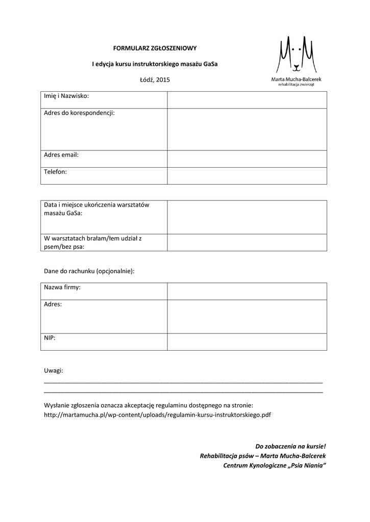 FORMULARZ ZGŁOSZENIOWY I edycja kursu instruktorskiego masażu GaSa Łódź, 2015 Imię i Nazwisko: Adres do korespondencji: Adres email: Telefon: Data i miejsce ukończenia warsztatów masażu GaSa: W warsztatach brałam/łem udział z psem/bez psa: Dane do rachunku (opcjonalnie): Nazwa firmy: Adres: NIP: Uwagi: __________________________________________________________________________________ __________________________________________________________________________________ Wysłanie zgłoszenia oznacza akceptację regulaminu dostępnego na stronie: http://martamucha.pl/wp-content/uploads/regulamin-kursu-instruktorskiego.pdf Do zobaczenia na kursie! Rehabilitacja psów – Marta Mucha-Balcerek Centrum Kynologiczne „Psia Niania”