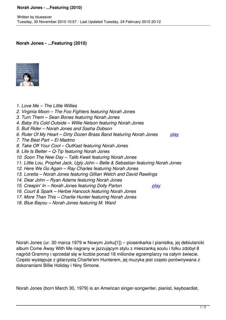 Norah Jones - ...Featuring (2010) Written by bluesever Tuesday, 30 November 2010 10:57 - Last Updated Tuesday, 24 February 2015 20:12 Norah Jones - ...Featuring (2010) 1. Love Me – The Little Willies 2. Virginia Moon – The Foo Fighters featuring Norah Jones 3. Turn Them – Sean Bones featuring Norah Jones 4. Baby It's Cold Outside – Willie Nelson featuring Norah Jones 5. Bull Rider – Norah Jones and Sasha Dobson 6. Ruler Of My Heart – Dirty Dozen Brass Band featuring Norah Jones play 7. The Best Part – El Madmo 8. Take Off Your Cool – OutKast featuring Norah Jones 9. Life Is Better – Q-Tip featuring Norah Jones 10. Soon The New Day – Talib Kweli featuring Norah Jones 11. Little Lou, Prophet Jack, Ugly John – Belle & Sebastian featuring Norah Jones 12. Here We Go Again – Ray Charles featuring Norah Jones 13. Loretta – Norah Jones featuring Gillian Welch and David Rawlings 14. Dear John – Ryan Adams featuring Norah Jones 15. Creepin' In – Norah Jones featuring Dolly Parton play 16. Court & Spark – Herbie Hancock featuring Norah Jones 17. More Than This – Charlie Hunter featuring Norah Jones 18. Blue Bayou – Norah Jones featuring M. Ward Norah Jones (ur. 30 marca 1979 w Nowym Jorku[1]) – piosenkarka i pianistka, jej debiutancki album Come Away With Me nagrany w jazzującym stylu z mieszanką soulu i folku zdobył 8 nagród Grammy i sprzedał się w liczbie ponad 18 milionów egzemplarzy na całym świecie. Często występuje z gitarzystą Charlie'em Hunterem, jej muzyka jest często porównywana z dokonaniami Billie Holiday i Niny Simone. Norah Jones (born March 30, 1979) is an American singer-songwriter, pianist, keyboardist, 1/2 Norah Jones - ...Featuring (2010) Written by bluesever Tuesday, 30 November 2010 10:57 - Last Updated Tuesday, 24 February 2015 20:12 guitarist, and actress. Jones has won nine Grammy Awards and was Billboard magazine's 60th best-selling music artist of the 2000–2009 decade. …Featuring, a compilation album of collaborations she has done with well-known musicians, including the Foo Fighters, Willie Nelson, Dirty Dozen Brass Band, Outkast, Q-Tip, Talib Kweli, Belle and Sebastian, Ray Charles, Ryan Adams, Dolly Parton, Herbie Hancock, M. Ward, and others. Jones said, “It's so exciting and flattering and fun when I get asked to sing with somebody that I admire...It takes you a little bit out of your comfort zone when you're doing something with another artist. You don't know what to expect—it's kind of like being a little kid and having a playdate.” download (mp3 @ kbs): uploaded yandex 4shared mega mediafire solidfiles zalivalka cloudmailru oboom back 2/2