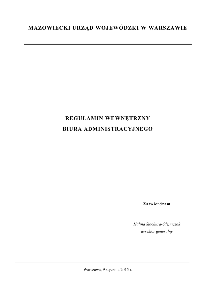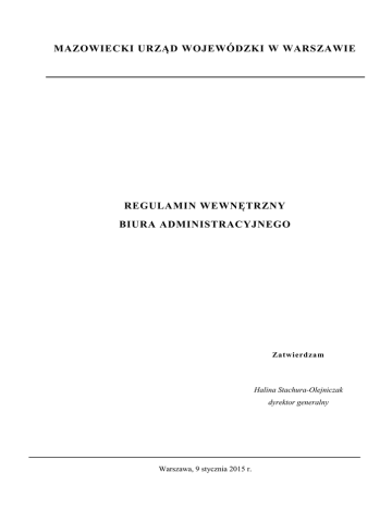 MAZOWIECKI URZĄD WOJEWÓDZKI W WARSZAWIE REGULAMIN WEWNĘTRZNY BIURA ADMINISTRACYJNEGO Zatwierdzam Halina Stachura-Olejniczak dyrektor generalny Warszawa, 9 stycznia 2015 r. REGULAMIN WEWNĘTRZNY BIURA ADMINISTRACYJNEGO Na podstawie § 10 ust. 1 Regulaminu Organizacyjnego Mazowieckiego Urzędu Wojewódzkiego w Warszawie stanowiącego załącznik do zarządzenia Nr 377 Wojewody Mazowieckiego z dnia 31 lipca 2014 roku w sprawie ustalenia Regulaminu Organizacyjnego Mazowieckiego Urzędu Wojewódzkiego w Warszawie ustala się Regulamin Wewnętrzny Biura Administracyjnego. Rozdział I Postanowienia ogólne § 1. Regulamin Wewnętrzny Biura Administracyjnego Mazowieckiego Urzędu Wojewódzkiego w Warszawie określa w szczególności zadania i strukturę organizacyjną, zadania kierownictwa oraz zakres działania wewnętrznych komórek organizacyjnych Biura Administracyjnego. Rozdział II Słownik terminów § 2. Ilekroć w Regulaminie Wewnętrznym Biura Administracyjnego jest mowa o: 1) Wojewodzie – należy przez to rozumieć Wojewodę Mazowieckiego; 2) Urzędzie – należy przez to rozumieć Mazowiecki Urząd Wojewódzki w Warszawie; 3) Dyrektorze Generalnym – należy przez to rozumieć Dyrektora Generalnego Mazowieckiego Urzędu Wojewódzkiego w Warszawie; 4) biurze – należy przez to rozumieć Biuro Administracyjne w Mazowieckim Urzędzie Wojewódzkim w Warszawie; 5) Dyrektorze – należy przez to rozumieć Dyrektora Biura Administracyjnego; 6) oddziale – należy przez to rozumieć komórkę organizacyjną Biura Administracyjnego; 7) kierowniku oddziału – należy przez to rozumieć kierownika komórki organizacyjnej Biura Administracyjnego lub inną osobę wyznaczoną przez dyrektora do koordynowania pracami oddziału; 2 8) delegaturach– należy przez to rozumieć Delegatury – Placówki Zamiejscowe Mazowieckiego Urzędu Wojewódzkiego w Warszawie; 9) wykazie akt – należy przez to rozumieć Jednolity Rzeczowy Wykaz Akt organów zespolonej administracji rządowej w województwie i urzędów obsługujących te organy. Rozdział III Struktura biura § 3. 1. W skład biura wchodzą następujące oddziały i samodzielne stanowiska pracy posługujące się przy znakowaniu prowadzonych spraw i akt symbolami: 1) Oddział Inwestycyjno-Gospodarczy ………………………………………...BA-I; 2) Oddział Zarządzania Nieruchomościami …………………………..………..BA-II; 3) Oddział Transportu ………………………………………………………......BA-III; 4) Samodzielne Stanowisko Pracy do spraw Obsługi Sekretariatu…..…………BA-IV; 5) Samodzielne Stanowiska Pracy w delegaturach z siedzibą w: a) Ciechanowie …………………………………………………………….....BA-C, b) Ostrołęce …………………………………………………………………..BA-O, c) Płocku ……………………………………………………………………...BA-P, d) Radomiu …………………………………………………………………...BA-R, e) Siedlcach …………………………………………………………………..BA-S. 2. Strukturę organizacyjną biura określa schemat, stanowiący załącznik do regulaminu wewnętrznego. Rozdział IV Kierowanie biurem i podporządkowanie § 4. 1. Biurem kieruje Dyrektor. 2. Dyrektor sprawuje bezpośredni nadzór nad pracą biura. 3 3. Podczas nieobecności Dyrektora zastępuje go Kierownik Oddziału Zarządzania Nieruchomościami, a w przypadku nieobecności Kierownika Oddziału Zarządzania Nieruchomościami wyznaczony pracownik Oddziału Zarządzania Nieruchomościami. 4. Podległość poszczególnych oddziałów i samodzielnych stanowisk pracy przedstawia schemat, stanowiący załącznik do regulaminu wewnętrznego. § 5. 1. Oddziałami kierują kierownicy oddziałów. 2. Kierowników oddziałów w czasie nieobecności zastępują osoby przez nich wyznaczone. 3. Kierownicy oddziałów odpowiedzialni są przed Dyrektorem za należytą organizację pracy oraz prawidłowe i terminowe wykonywanie zadań przez oddziały, a w szczególności za: 1) właściwy podział pracy; 2) porządek i dyscyplinę pracy; 3) merytoryczną i formalno-prawną poprawność załatwianych spraw; 4) nadzór nad przestrzeganiem przez pracowników przepisów o ochronie informacji niejawnych oraz ochronie danych osobowych; 5) prawidłową i terminową realizację zadań z zakresu zarządzania zasobami ludzkimi, a w szczególności: a) sporządzanie opisów stanowisk pracy oraz zakresów czynności, b) sporządzanie indywidualnych programów rozwoju zawodowego, c) planowanie rozwoju zawodowego podległych pracowników, d) dokonywanie ocen okresowych, e) motywowanie pracowników; 6) systematyczne archiwizowanie dokumentów przez pracowników. 4. Skargi na kierowników oddziałów rozpatruje Dyrektor. § 6. 1. W celu zapewnienia spójności działań biura w miarę potrzeb, nie rzadziej niż raz w miesiącu, odbywają się spotkania Dyrektora z kierownikami oddziałów. 2. Termin spotkania ustala Dyrektor. 3. W spotkaniach, o których mowa w ust. 1, mogą uczestniczyć w miarę potrzeb pracownicy biura, dyrektorzy innych wydziałów, inni zainteresowani pracownicy Urzędu oraz zaproszeni goście. 4 Rozdział V Zadania wspólne oddziałów i samodzielnych stanowisk pracy § 7. Do zadań wspólnych biura należy: 1) realizacja zadań, określonych w § 14 Regulaminu Organizacyjnego Urzędu, zgodnie z zakresem działania; 2) planowanie podstawowych zadań biura; 3) współdziałanie w zakresie przepływu informacji niezbędnych do zapewnienia prawidłowej i terminowej realizacji zadań przez biuro; 4) opracowywanie na potrzeby Wojewody, Dyrektora Generalnego oraz komórek organizacyjnych Urzędu i zespołów zadaniowych analiz, sprawozdań lub innych materiałów z zakresu działania biura; 5) prawidłowe przygotowanie i terminowe przekazywanie dokumentów do archiwum zakładowego; 6) wł