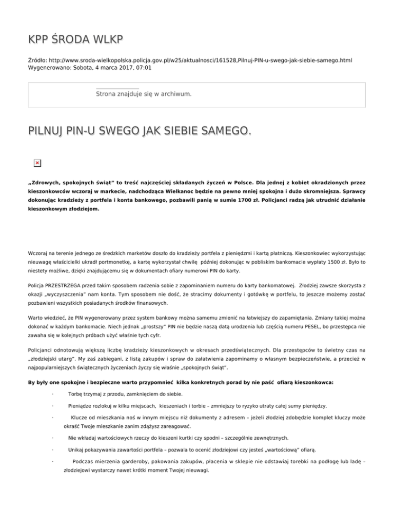 KPP ŚRODA WLKP Źródło: http://www.sroda-wielkopolska.policja.gov.pl/w25/aktualnosci/161528,Pilnuj-PIN-u-swego-jak-siebie-samego.html Wygenerowano: Sobota, 4 marca 2017, 07:01 Strona znajduje się w archiwum. PILNUJ PIN-U SWEGO JAK SIEBIE SAMEGO. „Zdrowych, spokojnych świąt” to treść najczęściej składanych życzeń w Polsce. Dla jednej z kobiet okradzionych przez kieszonkowców wczoraj w markecie, nadchodząca Wielkanoc będzie na pewno mniej spokojna i dużo skromniejsza. Sprawcy dokonując kradzieży z portfela i konta bankowego, pozbawili panią w sumie 1700 zł. Policjanci radzą jak utrudnić działanie kieszonkowym złodziejom. Wczoraj na terenie jednego ze średzkich marketów doszło do kradzieży portfela z pieniędzmi i kartą płatniczą. Kieszonkowiec wykorzystując nieuwagę właścicielki ukradł portmonetkę, a kartę wykorzystał chwilę później dokonując w pobliskim bankomacie wypłaty 1500 zł. Było to niestety możliwe, dzięki znajdującemu się w dokumentach ofiary numerowi PIN do karty. Policja PRZESTRZEGA przed takim sposobem radzenia sobie z zapominaniem numeru do karty bankomatowej. Złodziej zawsze skorzysta z okazji „wyczyszczenia” nam konta. Tym sposobem nie dość, że stracimy dokumenty i gotówkę w portfelu, to jeszcze możemy zostać pozbawieni wszystkich posiadanych środków finansowych. Warto wiedzieć, że PIN wygenerowany przez system bankowy można samemu zmienić na łatwiejszy do zapamiętania. Zmiany takiej można dokonać w każdym bankomacie. Niech jednak „prostszy” PIN nie będzie naszą datą urodzenia lub częścią numeru PESEL, bo przestępca nie zawaha się w kolejnych próbach użyć właśnie tych cyfr. Policjanci odnotowują większą liczbę kradzieży kieszonkowych w okresach przedświątecznych. Dla przestępców to świetny czas na „złodziejski utarg”. My zaś zabiegani, z listą zakupów i spraw do załatwienia zapominamy o własnym bezpieczeństwie, a przecież w najpopularniejszych świątecznych życzeniach życzy się właśnie „spokojnych świąt”. By były one spokojne i bezpieczne warto przypomnieć kilka konkretnych porad by nie paść ofiarą kieszonkowca: · Torbę trzymaj z przodu, zamknięciem do siebie. · Pieniądze rozlokuj w kilku miejscach, kieszeniach i torbie – zmniejszy to ryzyko utraty całej sumy pieniędzy. · Klucze od mieszkania noś w innym miejscu niż dokumenty z adresem – jeżeli złodziej zdobędzie komplet kluczy może okraść Twoje mieszkanie zanim zdążysz zareagować. · Nie wkładaj wartościowych rzeczy do kieszeni kurtki czy spodni – szczególnie zewnętrznych. · Unikaj pokazywania zawartości portfela – pozwala to ocenić złodziejowi czy jesteś „wartościową” ofiarą. · Podczas mierzenia garderoby, pakowania zakupów, płacenia w sklepie nie odstawiaj torebki na podłogę lub ladę – złodziejowi wystarczy nawet krótki moment Twojej nieuwagi. · Zwracaj uwagę na osoby obce znajdujące się w pobliżu. Niech Cię nie zmyli niewinny wygląd. Kieszonkowcami są też kobiety i dzieci! · W sytuacji zagrożenia – usiłowania kradzieży kieszonkowej – wszczynaj alarm! Głośny okrzyk zwracający uwagę innych osób potrafi skutecznie zniechęcić złodzieja. Ocena: 0/5 (0) Tweetnij