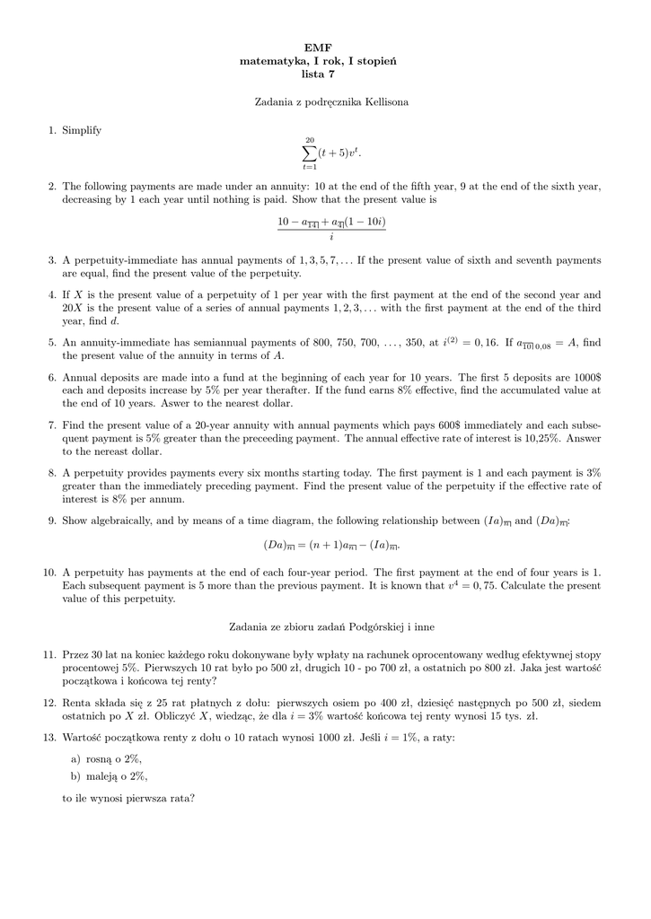 EMF matematyka, I rok, I stopień lista 7 Zadania z podręcznika Kellisona 1. Simplify 20 X (t + 5)v t . t=1 2. The following payments are made under an annuity: 10 at the end of the fifth year, 9 at the end of the sixth year, decreasing by 1 each year until nothing is paid. Show that the present value is 10 − a14 + a4 (1 − 10i) i 3. A perpetuity-immediate has annual payments of 1, 3, 5, 7, . . . If the present value of sixth and seventh payments are equal, find the present value of the perpetuity. 4. If X is the present value of a perpetuity of 1 per year with the first payment at the end of the second year and 20X is the present value of a series of annual payments 1, 2, 3, . . . with the first payment at the end of the third year, find d. 5. An annuity-immediate has semiannual payments of 800, 750, 700, . . . , 350, at i(2) = 0, 16. If a10 the present value of the annuity in terms of A. 0,08 = A, find 6. Annual deposits are made into a fund at the beginning of each year for 10 years. The first 5 deposits are 1000$ each and deposits increase by 5% per year therafter. If the fund earns 8% effective, find the accumulated value at the end of 10 years. Aswer to the nearest dollar. 7. Find the present value of a 20-year annuity with annual payments which pays 600$ immediately and each subsequent payment is 5% greater than the preceeding payment. The annual effective rate of interest is 10,25%. Answer to the nereast dollar. 8. A perpetuity provides payments every six months starting today. The first payment is 1 and each payment is 3% greater than the immediately preceding payment. Find the present value of the perpetuity if the effective rate of interest is 8% per annum. 9. Show algebraically, and by means of a time diagram, the following relationship between (Ia)n and (Da)n : (Da)n = (n + 1)an − (Ia)n . 10. A perpetuity has payments at the end of each four-year period. The first payment at the end of four years is 1. Each subsequent payment is 5 more than the previous payment. It is known that v 4 = 0, 75. Calculate the present value of this perpetuity. Zadania ze zbioru zadań Podgórskiej i inne 11. Przez 30 lat na koniec każdego roku dokonywane były wpłaty na rachunek oprocentowany według efektywnej stopy procentowej 5%. Pierwszych 10 rat było po 500 zł, drugich 10 - po 700 zł, a ostatnich po 800 zł. Jaka jest wartość początkowa i końcowa tej renty? 12. Renta składa się z 25 rat płatnych z dołu: pierwszych osiem po 400 zł, dziesięć następnych po 500 zł, siedem ostatnich po X zł. Obliczyć X, wiedząc, że dla i = 3% wartość końcowa tej renty wynosi 15 tys. zł. 13. Wartość początkowa renty z dołu o 10 ratach wynosi 1000 zł. Jeśli i = 1%, a raty: a) rosną o 2%, b) maleją o 2%, to ile wynosi pierwsza rata? 14. Chcemy oszczędzać przez trzy lata wpłacając na konto co dwa miesiące pewną kwotę. Pierwsza wpłatę w wysokości 500 zł planujemy dnia 1 czerwca 2014 roku, i zakładamy, że każda wpłata będzie o 20 zł większa od poprzedniej. Obliczyć stan konta dnia 31 maja 2017 roku, przy założeniu rocznej nominalnej stopy procentowej z kapitalizacją miesięczną w wysokości 6%. 15. Wartość początkowa renty o 20 ratach tworzących ciąg arytmetyczny o różnicy 50 wynosi 8300. Jeśli i = 4%, ile wynosi pierwsza rata?