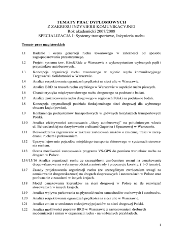 TEMATY PRAC DYPLOMOWYCH Z ZAKRESU INśYNIERII KOMUNIKACYJNEJ Rok akademicki 2007/2008 SPECJALIZACJA I: Systemy transportowe, InŜynieria ruchu Tematy prac magisterskich I.1 Badanie i ocena generacji ruchu towarowego w zaleŜności od sposobu zagospodarowania przestrzennego. I.2 Projekt systemu tzw. Kiss&Ride w Warszawie z wykorzystaniem wybranych pętli i przystanków autobusowych.. I.3 Koncepcja organizacji ruchu towarowego w rejonie węzła komunikacyjnego Targowa/Al. Solidarności w Warszawie. I.4 Analiza respektowania ograniczeń prędkości na sieci ulic w Warszawie. I.5 Analiza BRD na trasach ruchu szybkiego w Warszawie w aspekcie ruchu pieszych. I.6 Charakterystyka międzynarodowego ruchu drogowego na podstawie badań. I.7 Analiza zróŜnicowania ruchu drogowego w regionach Polski na podstawie badań. I.8 Koncepcja optymalizacji podziału funkcjonalnego sieci drogowej dla wybranego obszaru kraju (powiat). I.9 Konkurencja podsystemów transportowych w głównych korytarzach transportowych Polski. I.10 Analiza efektywności zastosowania „śluzy autobusowej” na południowym wlocie ul. Belwederskiej na skrzyŜowanie z ulicami Gagarina i Spacerowej w Warszawie. I.11 Doświadczenia zagraniczne w zakresie zastosowań znaków o zmiennej treści w zarządzaniu ruchem i parkowaniem. I.12 Uprzywilejowanie pojazdów miejskiego transportu zbiorowego w systemach sterowania ruchem. I.13 Ocena moŜliwości zastosowania programu VS-GPS do pomiaru warunków ruchu na drogach w Polsce. I.14/15/16 Analiza organizacji ruchu ze szczególnym zwróceniem uwagi na oznakowanie drogowskazowe na wybranym odcinku autostrady i propozycje korekty. ( 1–3 tematy). I.17 Zasady projektowania organizacji ruchu (ze szczególnym zwróceniem uwagi na oznakowanie drogowskazowe) na drogach ekspresowych i autostradach w Polsce oraz porównanie z zasadami w innych krajach. I.18 Model oznakowania kierunków na sieci drogowej w Polsce na tle rozwiązań stosowanych w innych krajach. I.19 Analiza wpływu parkowania na płynność ruchu samochodów osobowych i autobusów. I.20 Analiza respektowania ograniczeń prędkości na sieci ulic w Warszawie. I.21 Analiza zmian w strukturze rodzajowej pojazdów na sieci drogowej Polski. I.22 Analiza moŜliwości poprawy BRD w Warszawie z zastosowaniem drobnych modernizacji i zmian w organizacji ruchu - na wybranych przykładach. 1 I.23 Projekt pasa rowerowego wzdłuŜ ciągu ulic Koszykowa-Piękna od ul. Raszyńskiej do Agrykoli. I.24 Projekt usprawnienia ruchu rowerowego w ciągu ul. Konwiktorska – Bonifraterska w Warszawie. I.25 Wielkość generacji ruchu samochodowego (osobowego i towarowego) w funkcji gęstości zabudowy mieszkaniowej. I.26 Studium systemu „bike & ride” dla dzielnicy Białołęka w Warszawie. I.27 Ocena funkcjonowania zmodernizowanej trasy tramwajowej w Al. Jerozolimskich. I.28 Studium moŜliwości wprowadzenia systemu „parkuj i jedź” na linii kolejowej Warszawa Gdańska – Legionowo- Nowy Dwór Maz. I.29 Wpływ relacji skrętnych na trasach tramwajowych na straty czasu na skrzyŜowaniach. I.30 Analiza i ocena funkcjonowania węzła przesiadkowego Warszawa-Zachodnia, z projektem rozwiązań usprawniających. I.31 Zaawansowane systemy zarządzania ruchem w miastach. I.32 Ocena warunków ruchu i parkowania w wybranych rejonach handlu bazarowego w Warszawie, z projektem rozwiązań usprawniających. I.33 Ocena warunków podróŜowania autobusami linii ekspresowych w Warszawie, z propozycjami zmian w organizacji przewozów. I.34 Dostępność obiektów uŜyteczności publicznej i transportu dla osób niepełnosprawnych – wymagania i analiza stanu istniejącego w Warszawie. I.35 Systemy pobierania opłat za korzystanie z dróg. I.36 Emisja gazów cieplarnianych z transportu –techniczne i organizacyjne środki ograniczenia. I.37 Wpływ zmian w przepisach dotyczących sygnalizacji świetlnej na przepustowość i straty czasu. Tematy prac inŜynierskich I.34 Ocena warunków parkowania w zaleŜności od strefy miasta na przykładzie Warszawy. I.35 Analiza wpływu parkowania na płynność ruchu samochodów osobowych i autobusów. I.36 Ocena skuteczności funkcjonowania strefy ograniczania prędkości do 50 km/h w Warszawie. I.37 Analiza odległości podróŜy na sieci dróg krajowych w Polsce. I.38 Analiza i ocena podziału funkcjonalnego dróg publicznych w Polsce. I.39 Analiza zmian w strukturze rodzajowej pojazdów na sieci drogowej Polski. I.40 Analiza moŜliwości poprawy BRD w Warszawie z zastosowaniem drobnych modernizacji i zmian w organizacji ruchu - na wybranych przykładach. I.41 Ocena warunków ruchu na zamiejskich dwupasowych drogach dwukierunkowych bez utwardzonych poboczy. 2 I.42 Ocena warunków ruchu na zamiejskich dwupasowych drogach dwukierunkowych z utwardzonymi poboczami. I.43 Ocena warunków ruchu na drodze z pasami wyprzedzania. I.44 Projekt rozwiązania usprawniającego funkcjonowanie skrzyŜowania w miejscowości Konstancin – Jeziorna. I.45 Projekt organizacji parkowania w ustalonym rejonie miasta. I.46 Analiza celowości i moŜliwości zastosowania systemu „parkuj i jedź” przy linii kolejowej Warszawa – Czachówek. SPECJALIZACJA II: Projektowanie dróg i lotnisk Tematy prac magisterskich II.1 Analiza wielokryterialna i jej zastosowanie w drogownictwie. II.2 Metody oceny wariantów węzłów, ew. zbudowanie arkusza wspomagającego wybór wariantu. II.3 Odcinki dróg o zmiennych kierunkach ruchu – zasady projektowania, przykłady zastosowania, zalety i wady. II.4 Zastosowanie fotogrametrii lotniczej i satelitarnej w drogownictwie. II.5 Zastosowanie systemów nawigacji satelitarnej w drogownictwie. II.6 Zastosowanie map cyfrowych do projektowania dróg. II.7 Oprogramowanie do obróbki map rastrowych. II.8 Analiza moŜliwości programu SoundPlan (analiza emisji hałasu). II.9 Wybór korytarza wstępnego przebiegu drogi; zastosowanie MapInfo lub Geographics. II.10 MoŜliwości zastosowania programu Geographics w inŜynierii 