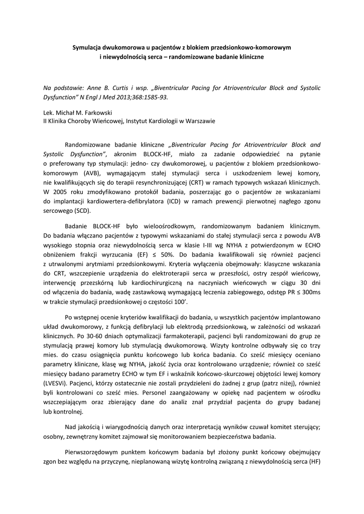 Symulacja dwukomorowa u pacjentów z blokiem przedsionkowo-komorowym i niewydolnością serca – randomizowane badanie kliniczne Na podstawie: Anne B. Curtis i wsp. „Biventricular Pacing for Atrioventricular Block and Systolic Dysfunction” N Engl J Med 2013;368:1585-93. Lek. Michał M. Farkowski II Klinika Choroby Wieńcowej, Instytut Kardiologii w Warszawie Randomizowane badanie kliniczne „Biventricular Pacing for Atrioventricular Block and Systolic Dysfunction”, akronim BLOCK-HF, miało za zadanie odpowiedzieć na pytanie o preferowany typ stymulacji: jedno- czy dwukomorowej, u pacjentów z blokiem przedsionkowokomorowym (AVB), wymagającym stałej stymulacji serca i uszkodzeniem lewej komory, nie kwalifikujących się do terapii resynchronizującej (CRT) w ramach typowych wskazań klinicznych. W 2005 roku zmodyfikowano protokół badania, poszerzając go o pacjentów ze wskazaniami do implantacji kardiowertera-defibrylatora (ICD) w ramach prewencji pierwotnej nagłego zgonu sercowego (SCD). Badanie BLOCK-HF było wieloośrodkowym, randomizowanym badaniem klinicznym. Do badania włączano pacjentów z typowymi wskazaniami do stałej stymulacji serca z powodu AVB wysokiego stopnia oraz niewydolnością serca w klasie I-III wg NYHA z potwierdzonym w ECHO obniżeniem frakcji wyrzucania (EF) ≤ 50%. Do badania kwalifikowali się również pacjenci z utrwalonymi arytmiami przedsionkowymi. Kryteria wyłączenia obejmowały: klasyczne wskazania do CRT, wszczepienie urządzenia do elektroterapii serca w przeszłości, ostry zespół wieńcowy, interwencję przezskórną lub kardiochirurgiczną na naczyniach wieńcowych w ciągu 30 dni od włączenia do badania, wadę zastawkową wymagającą leczenia zabiegowego, odstęp PR ≤ 300ms w trakcie stymulacji przedsionkowej o częstości 100’. Po wstępnej ocenie kryteriów kwalifikacji do badania, u wszystkich pacjentów implantowano układ dwukomorowy, z funkcją defibrylacji lub elektrodą przedsionkową, w zależności od wskazań klinicznych. Po 30-60 dniach optymalizacji farmakoterapii, pacjenci byli randomizowani do grup ze stymulacją prawej komory lub stymulacją dwukomorową. Wizyty kontrolne odbywały się co trzy mies. do czasu osiągnięcia punktu końcowego lub końca badania. Co sześć miesięcy oceniano parametry kliniczne, klasę wg NYHA, jakość życia oraz kontrolowano urządzenie; również co sześć miesięcy badano parametry ECHO w tym EF i wskaźnik końcowo-skurczowej objętości lewej komory (LVESVi). Pacjenci, którzy ostatecznie nie zostali przydzieleni do żadnej z grup (patrz niżej), również byli kontrolowani co sześć mies. Personel zaangażowany w opiekę nad pacjentem w ośrodku wszczepiającym oraz zbierający dane do analiz znał przydział pacjenta do grupy badanej lub kontrolnej. Nad jakością i wiarygodnością danych oraz interpretacją wyników czuwał komitet sterujący; osobny, zewnętrzny komitet zajmował się monitorowaniem bezpieczeństwa badania. Pierwszorzędowym punktem końcowym badania był złożony punkt końcowy obejmujący zgon bez względu na przyczynę, nieplanowaną wizytę kontrolną związaną z niewydolnością serca (HF) wymagającą stosowania leków dożylnych lub osiągnięcie poprawy LVESVi o 15%. Drugorzędowe punkty końcowe obejmowały: zgon lub jakąkolwiek nagłą wizytę kontrolną związaną z HF, zgon lub hospitalizację z powodu HF oraz składowe złożonych punktów końcowych. W przypadku braku danych nt. LVESVi dla którejś z wizyt, wyniki dalszej obserwacji były wyłączane z analizy pierwszorzędowego punktu końcowego aby uniknąć sztucznego zawyżania wyniku badania; założenie to nie dotyczyło drugorzędowych punktów końcowych. Skomplikowana analiza statystyczna, oparta na modelach bayesianskich, zakładała włączenie do badania maksymalnie 1200 pacjentów oraz wykazanie przewagi stymulacji dwukomorowej nad prawokomorową w przypadku pierwszorzędowego punktu z prawdopodobieństwem 0.9775 lub 0.95 w przypadku drugorzędowych punktów końcowych. W czasie trwania badania od listopada 2003 do grudnia 2011, w 58 ośrodkach amerykańskich i dwóch kanadyjskich, do badania włączono 918 pacjentów, z czego zrandomizowano 691; 484 pacjentów otrzymało stymulator (PM) a 207 ICD. Z badania wyłączono 95 pacjentów ze względu na sprawne przewodzenie przedsionkowo-komorowe, u 51 implantacja nie powiodła się; wśród 67 którzy otrzymali urządzenie, 21 wycofało zgodę na udział w badaniu, 16 zmarło a 30 wyłączono z innych przyczyn. Ostatecznie, do grupy badanej włączono 349 pacjentów a do grupy kontrolnej 342; 84 pacjentów z grupy kontrolnej ostatecznie przeszło na stymulację dwukomorową z czego 50 już po osiągnięciu punktu końcowego. Pacjenci w obu grupach mieli porównywalne charakterystyki; średnia EF wyniosła 40.0±8.3% (42.9% w grupie PM i 33% w ICD), większość pacjentów była w grupie II lub III wg NYHA, u ok. połowy stwierdzono AVB IIIo, a odsetek stymulacji wyniósł 97-98.6-% w zależności od rodzaju AVB. Wykazano przewagę stymulacji dwukomorowej nad stymulacją prawokomorową w zakresie pierwszorzędowego punktu końcowego HR 0.74 (95% CI: 0.60–0.90), złożonych drugorzędowych punktów końcowych oraz hospitalizacji z powodu HF HR 0.70 (95% CI: 0.52–0.93). Nie wykazano natomiast istotnej różnicy w ogólnej śmiertelności pacjentów HR 0.83 (95% CI: 0.61–1.14). Pomiędzy wszczepieniem a randomizacją, u 113 (14%) pacjentów wystąpił duży efekt niepożądany, m. in.: dyslokacja elektrody 3%, migotanie przedsionków 1.1%, natomiast w ciągu sześciu mies. od implantacji 4.9% pacjentów doświadczyło powikłań związanych z urządzeniem. Autorzy badania podają relatywnie wysokie odsetki pacjentów przechodzących do grupy ze stymulacją dwukomorową oraz wyłączanych z analizy pierwszorzędowego punktu końcowego ze względu na brak wyników badań ECHO jako główne ograniczenia badania. Podsum