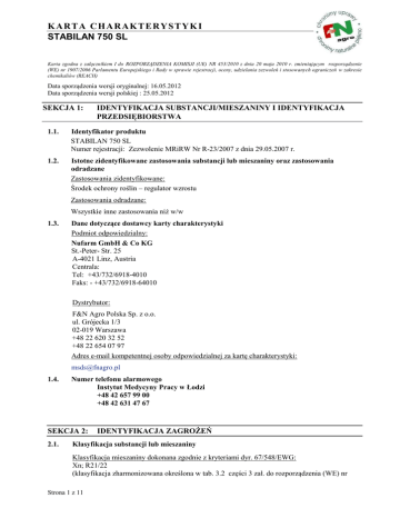 KARTA CHARAKTERYSTYKI STABILAN 750 SL Karta zgodna z załącznikiem I do ROZPORZĄDZENIA KOMISJI (UE) NR 453/2010 z dnia 20 maja 2010 r. zmieniającym rozporządzenie (WE) nr 1907/2006 Parlamentu Europejskiego i Rady w sprawie rejestracji, oceny, udzielania zezwoleń i stosowanych ograniczeń w zakresie chemikaliów (REACH) Data sporządzenia wersji oryginalnej: 16.05.2012 Data sporządzenia wersji polskiej : 25.05.2012 SEKCJA 1: IDENTYFIKACJA SUBSTANCJI/MIESZANINY I IDENTYFIKACJA PRZEDSIĘBIORSTWA 1.1. Identyfikator produktu STABILAN 750 SL Numer rejestracji: Zezwolenie MRiRW Nr R-23/2007 z dnia 29.05.2007 r. 1.2. Istotne zidentyfikowane zastosowania substancji lub mieszaniny oraz zastosowania odradzane Zastosowania zidentyfikowane: Środek ochrony roślin – regulator wzrostu Zastosowania odradzane: Wszystkie inne zastosowania niż w/w 1.3. Dane dotyczące dostawcy karty charakterystyki Podmiot odpowiedzialny: Nufarm GmbH & Co KG St.-Peter- Str. 25 A-4021 Linz, Austria Centrala: Tel: +43/732/6918-4010 Faks: - +43/732/6918-64010 Dystrybutor: F&N Agro Polska Sp. z o.o. ul. Grójecka 1/3 02-019 Warszawa +48 22 620 32 52 +48 22 654 07 97 Adres e-mail kompetentnej osoby odpowiedzialnej za kartę charakterystyki: [email protected] 1.4. Numer telefonu alarmowego Instytut Medycyny Pracy w Łodzi +48 42 657 99 00 +48 42 631 47 67 SEKCJA 2: 2.1. IDENTYFIKACJA ZAGROŻEŃ Klasyfikacja substancji lub mieszaniny Klasyfikacja mieszaniny dokonana zgodnie z kryteriami dyr. 67/548/EWG: Xn; R21/22 (klasyfikacja zharmonizowana określona w tab. 3.2 części 3 zał. do rozporządzenia (WE) nr Strona 1 z 11 KARTA CHARAKTERYSTYKI STABILAN 750 SL 1272/2008 – I ATP) Pełny tekst klasyfikacji, w tym znaczenie stosowanych skrótów i symboli oraz treść zwrotów H i R – patrz sekcja 16 karty charakterystyki 2.2. Elementy oznakowania Xn – szkodliwy Zwroty wskazujące rodzaj zagrożenia: R21/22 – Działa szkodliwie w kontakcie ze skórą i po połknięciu. Zwroty wskazujące środki ostrożności: S2 – Chronić przed dziećmi S13 – Nie przechowywać razem z żywnością, napojami i paszami dla zwierząt. S20/21 – Nie jeść i nie pić oraz nie palić tytoniu podczas stosowania produktu. S36/37 – Nosić odpowiednią odzież ochronną i odpowiednie rękawice ochronne. S46 – W razie połknięcia niezwłocznie zasięgnij porady lekarza — pokaż opakowanie lub etykietę. 2.3. Inne zagrożenia Nie określono SEKCJA 3: 3.1. SKŁAD/INFORMACJA O SKŁADNIKACH Substancje Nie dotyczy 3.2. Mieszaniny Wodny roztwór: chlorek chloromekwatu 750 g/l Trójzasadowy siarczan miedzi Zawartość: 65,9% Numer indeksowy: Numer CAS: 999-81-5 Numer WE: 213-666-4 Klasyfikacja: Xn; R21/22 SEKCJA 4: 4.1. ŚRODKI PIERWSZEJ POMOCY Opis środków pierwszej pomocy Kontakt z oczami Natychmiast przemyć dużą ilością wody, przytrzymując odchylone powieki. Przemywać min. 15 minut. Strona 2 z 11 KARTA CHARAKTERYSTYKI STABILAN 750 SL Kontakt ze skórą Natychmiast przemywać skórę dużą ilością wody z mydłem. Wdychanie Wyprowadzić na świeże powietrze. Połknięcie Wypłukać usta wodą. Nie powodować wymiotów. W przypadku połknięcia natychmiast zawiadomić lekarza; pokazać opakowanie lub etykietę. W przypadku połknięcia wykonać płukanie żołądka. 4.2. Najważniejsze ostre i opóźnione objawy oraz skutki narażenia Skutki narażenia ostrego i przewlekłego Trudności w oddychaniu, skurcze kloniczno-toniczne 4.3. Wskazania dotyczące wszelkiej natychmiastowej pomocy lekarskiej i szczególnego postępowania z poszkodowanym Zalecenia ogólne Brak danych Wskazówki dla lekarza Brak specyficznego antidotum, stosować leczenie objawowe. SEKCJA 5: 5.1. POSTĘPOWANIE W PRZYPADKU POŻARU Środki gaśnicze Odpowiednie środki gaśnicze: mgła wodna, dwutlenek węgla, proszki gaśnicze, piasek, piany gaśnicze Niewłaściwe środki gaśnicze: zwarty strumień wody pod ciśnieniem 5.2. Szczególne zagrożenia związane z substancją lub mieszaniną W czasie pożaru mogą wydzielać się toksyczne gazy np. tlenki węgla, chlor, chlorowodór 5.3. Informacje dla straży pożarnej Stosować środki ochrony indywidualnej. W razie potrzeby nosić aparaty oddechowe z niezależnym źródłem powietrza. Stosować się do standardowych procedur w zakresie pożaru chemikaliów. Zużyte środki gaśnicze zebrać osobno - nie dopuszczać do przedostawania się do kanalizacji SEKCJA 6: 6.1. POSTĘPOWANIE W PRZYPADKU NIEZAMIERZONEGO UWOLNIENIA DO ŚRODOWISKA Indywidualne środki ostrożności, wyposażenie ochronne i procedury w sytuacjach awaryjnych Dla osób nienależących do personelu udzielającego pomocy Brak szczególnych zaleceń Dla osób udzielających pomocy Strona 3 z 11 KARTA CHARAKTERYSTYKI STABILAN 750 SL Nosić środki ochrony indywidualnej 6.2. Środki ostrożności w zakresie ochrony środowiska Nie dopuścić do przedostania się produktu do kanalizacji i wód. 6.3. Metody i materiały zapobiegające rozprzestrzenianiu się skażenia i służące do usuwania skażenia Zmieść, odkurzyć lub zebrać uwolniony materiał za pomocą środka absorbującego (piasek, żel silikonowy, uniwersalny środek wiążący) i umieścić w odpowiednich pojemnikach na odpady. Używać sprzętu mechanicznego. Nigdy nie umieszczać uwolnionego materiału z powrotem w pojemnikach. 6.4. Odniesienia do innych sekcji Sprzęt ochronny i odzież - patrz sekcja 8 Unieszkodliwianie odpadu - patrz sekcja 13 i 15 SEKCJA 7: 7.1. POSTĘPOWANIE Z SUBSTANCJAMI I MIESZANINAMI ORAZ ICH MAGAZYNOWANIE Środki ostrożności dotyczące bezpiecznego postępowania Nosić środki ochrony indywidualnej. Chronić przed dziećmi. 7.2. Warunki bezpiecznego magazynowania, łącznie z informacjami dotyczącymi wszelkich wzajemnych niezgodności Przechowywać w temperaturze pokojowej w oryginalnych pojemnikach. Nie przechowywać razem z żywnością, napojami i paszami dla zwierząt. 7.3. Szczególne zastosowanie(-a) końcowe Brak informacji dotyczących szcze