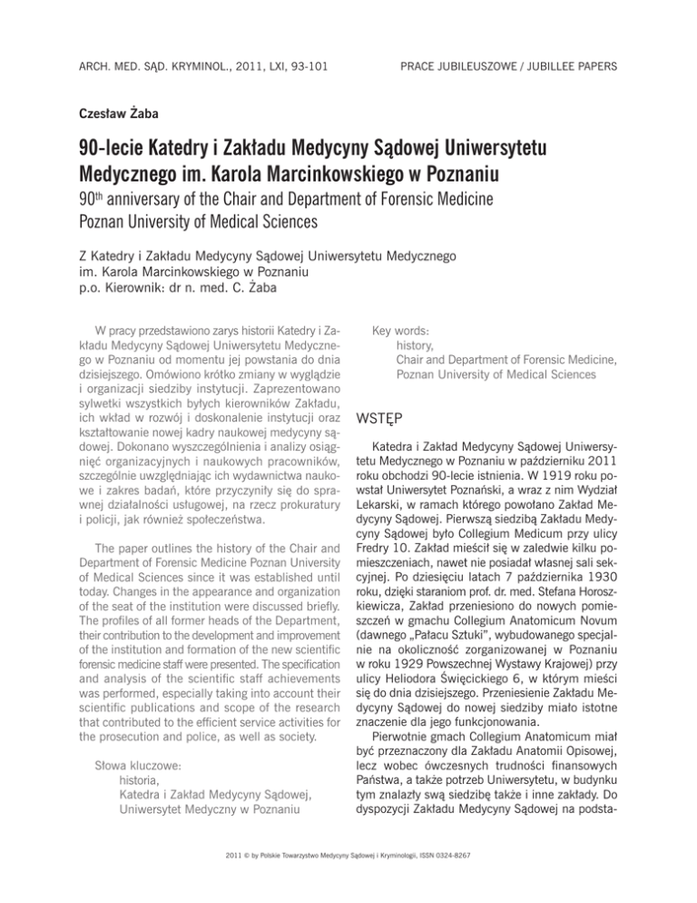 ARCH. MED. SĄD. KRYMINOL., 2011, LXI, 93-101 PRACE JUBILEUSZOWE / JUBILLEE PAPERS Czesław Żaba 90-lecie Katedry i Zakładu Medycyny Sądowej Uniwersytetu Medycznego im. Karola Marcinkowskiego w Poznaniu 90th anniversary of the Chair and Department of Forensic Medicine Poznan University of Medical Sciences Z Katedry i Zakładu Medycyny Sądowej Uniwersytetu Medycznego im. Karola Marcinkowskiego w Poznaniu p.o. Kierownik: dr n. med. C. Żaba W pracy przedstawiono zarys historii Katedry i Zakładu Medycyny Sądowej Uniwersytetu Medycznego w Poznaniu od momentu jej powstania do dnia dzisiejszego. Omówiono krótko zmiany w wyglądzie i organizacji siedziby instytucji. Zaprezentowano sylwetki wszystkich byłych kierowników Zakładu, ich wkład w rozwój i doskonalenie instytucji oraz kształtowanie nowej kadry naukowej medycyny sądowej. Dokonano wyszczególnienia i analizy osiągnięć organizacyjnych i naukowych pracowników, szczególnie uwzględniając ich wydawnictwa naukowe i zakres badań, które przyczyniły się do sprawnej działalności usługowej, na rzecz prokuratury i policji, jak również społeczeństwa. The paper outlines the history of the Chair and Department of Forensic Medicine Poznan University of Medical Sciences since it was established until today. Changes in the appearance and organization of the seat of the institution were discussed briefly. The profiles of all former heads of the Department, their contribution to the development and improvement of the institution and formation of the new scientific forensic medicine staff were presented. The specification and analysis of the scientific staff achievements was performed, especially taking into account their scientific publications and scope of the research that contributed to the efficient service activities for the prosecution and police, as well as society. Słowa kluczowe: historia, Katedra i Zakład Medycyny Sądowej, Uniwersytet Medyczny w Poznaniu Key words: history, Chair and Department of Forensic Medicine, Poznan University of Medical Sciences WSTĘP Katedra i Zakład Medycyny Sądowej Uniwersytetu Medycznego w Poznaniu w październiku 2011 roku obchodzi 90-lecie istnienia. W 1919 roku powstał Uniwersytet Poznański, a wraz z nim Wydział Lekarski, w ramach którego powołano Zakład Medycyny Sądowej. Pierwszą siedzibą Zakładu Medycyny Sądowej było Collegium Medicum przy ulicy Fredry 10. Zakład mieścił się w zaledwie kilku pomieszczeniach, nawet nie posiadał własnej sali sekcyjnej. Po dziesięciu latach 7 października 1930 roku, dzięki staraniom prof. dr. med. Stefana Horoszkiewicza, Zakład przeniesiono do nowych pomieszczeń w gmachu Collegium Anatomicum Novum (dawnego „Pałacu Sztuki”, wybudowanego specjalnie na okoliczność zorganizowanej w Poznaniu w roku 1929 Powszechnej Wystawy Krajowej) przy ulicy Heliodora Święcickiego 6, w którym mieści się do dnia dzisiejszego. Przeniesienie Zakładu Medycyny Sądowej do nowej siedziby miało istotne znaczenie dla jego funkcjonowania. Pierwotnie gmach Collegium Anatomicum miał być przeznaczony dla Zakładu Anatomii Opisowej, lecz wobec ówczesnych trudności finansowych Państwa, a także potrzeb Uniwersytetu, w budynku tym znalazły swą siedzibę także i inne zakłady. Do dyspozycji Zakładu Medycyny Sądowej na podsta- 2011 © by Polskie Towarzystwo Medycyny Sądowej i Kryminologii, ISSN 0324-8267 94 wową działalność przeznaczono parterową, półkolistą, znacznych rozmiarów część gmachu. Po przebudowie w części tej wydzielono kilka sal do celów dydaktycznych, pracownie dla przeprowadzania badań naukowych oraz sądowo-lekarskich, które zabezpieczały potrzeby związane z nauczaniem, jak również ze statutową działalnością na rzecz organów ścigania i wymiaru sprawiedliwości. Ryc. 1. Fig. 1. Nr 2 Czesław Żaba wych zostało ostatecznie przeniesione do korytarza zakładu. Na terenie zakładu powstała sala wykładowa w zabudowie amfiteatralnej z miejscami dla około stu słuchaczy. W sali wykładowej znajdował się stół sekcyjny i epidiaskop, pozwalający na wyświetlanie obrazów w różnych kombinacjach makro- i mikroprojekcji. Pomieszczenie posiadało zasłony opuszczane mechanizmem elektrycznym. Obok sali wykładowej umieszczono salę ćwiczeń dla słuchaczy, wyposażoną w stół laboratoryjny oraz wąskie stoły mikroskopowe z odpowiednimi pomocami naukowymi, takimi jak: mikroskopy, spektroskop, mikrospektroskop itd. oraz konieczne odczynniki chemiczne. Jednym z ważnych pomieszczeń był pokój badań, przeznaczony do przeprowadzania obdukcji sądowo-lekarskich, badań psychiatrycznych, oględzin kobiet podejrzanych o spędzenie płodu, zgwałconych i innych przypadków. Zdjęcie budynku Collegium Anatomicum z 1930 roku. Picture of the building Collegium Anatomicum in 1930. W głównej części zakładu znajdowała się oszklona ze wszystkich stron gablota, służąca do rozpoznawania tożsamości zwłok osób nieznanych. Usytuowana była ona w pomieszczeniu z osobnym wejściem dla publiczności. Sala sekcyjna posiadała dwa stoły sekcyjne, wykonane z płyt marmuru belgijskiego. Obok sali znajdował się gabinet, w którym urzędował sędzia śledczy, wykonujący w zakładzie podstawowe, przygotowawcze czynności sądowolekarskie. Przewidziano także pomieszczenie dla muzeum, w którym zgromadzono preparaty anatomopatologiczne oraz eksponaty z dziedziny sądowo-lekarskiej w ilości ponad 500 egzemplarzy. W muzeum duży zbiór stanowiły czaszki z różnego rodzaju obrażeniami, ponadto całkowicie zachowane zmumifikowane zwłoki, bogaty zestaw broni, zestawy pocisków różnego pochodzenia i kalibru, zbiory fotografii, narzędzi użytych do zbrodni, narzędzi do spędzania płodów, liczne pętle wisielcze oraz inne dowody rzeczowe. Do dnia dzisiejszego znaczna część eksponatów zachowała się, z wyjątkiem broni, pocisków, fotografii, narzędzi użytych do zbrodni, narzędzi do usuwania p