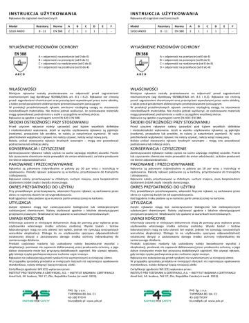 INSTRUKCJA UŻYTKOWANIA INSTRUKCJA UŻYTKOWANIA Rękawice do zagrożeń mechanicznych Rękawice do zagrożeń mechanicznych Model S2GO ANDO Rozmiary Norma A B C D E F Model 8 - 11 EN 388 2 1 1 1 - - S2GO ANDO WYJAŚNIENIE POZIOMÓW OCHRONY Norma A B C D E F 8 - 11 EN 388 2 1 1 1 - - WYJAŚNIENIE POZIOMÓW OCHRONY A = odporność na przetarcie (od 0 do 4) B = odporność na przecięcie (od 0 do 5) C = odporność na rozdzieranie (od 0 do 4) D = odporność na przekłucie (od 0 do 4) ABCD Rozmiary A = odporność na przetarcie (od 0 do 4) B = odporność na przecięcie (od 0 do 5) C = odporność na rozdzieranie (od 0 do 4) D = odporność na przekłucie (od 0 do 4) ABCD WŁAŚCIWOŚCI WŁAŚCIWOŚCI Niniejsze rękawice zostały przetestowane na odporność przed zagrożeniami mechanicznymi (wg dyrektywy 90/686/EWA art. 8.1 i 8.2). Rękawice nie chronią przed: zagrożeniami chemicznymi oraz przecięciami wywołanymi przez ostre obiekty, a także przed porażeniem elektrycznymi promieniowaniem jonizującym. W produkcji przedmiotowych rękawic zwrócono niezbędną uwagę na stosowanie nieszkodliwych materiałów. Nie można jednak wykluczyć, że zastosowane materiały mogą spowodować podrażnienia u osób o szczególnie wrażliwej skórze. Rękawice są zgodne z wymogami norm EN 420 i EN 388. Niniejsze rękawice zostały przetestowane na odporność przed zagrożeniami mechanicznymi (wg dyrektywy 90/686/EWA art. 8.1 i 8.2). Rękawice nie chronią przed: zagrożeniami chemicznymi oraz przecięciami wywołanymi przez ostre obiekty, a także przed porażeniem elektrycznymi promieniowaniem jonizującym. W produkcji przedmiotowych rękawic zwrócono niezbędną uwagę na stosowanie nieszkodliwych materiałów. Nie można jednak wykluczyć, że zastosowane materiały mogą spowodować podrażnienia u osób o szczególnie wrażliwej skórze. Rękawice są zgodne z wymogami norm EN 420 i EN 388. ŚRODKI OSTROŻNOŚCI PRZY STOSOWANIU ŚRODKI OSTROŻNOŚCI PRZY STOSOWANIU Przed użyciem rękawice należy sprawdzić pod kątem wszelkich defektów i niedoskonałości wykonania. Jeżeli w wyniku użytkowania rękawice są pęknięte (rozdarte), przepalone lub przebite, to należy je natychmiast wymienić. W razie jakichkolwiek wątpliwości rękawic nie należy używać, należy wziąć nową parę. Należy unikać stosowania rękawic brudnych wewnątrz – mogą one powodować podrażnienia lub infekcje skóry. Przed użyciem rękawice należy sprawdzić pod kątem wszelkich defektów i niedoskonałości wykonania. Jeżeli w wyniku użytkowania rękawice są pęknięte (rozdarte), przepalone lub przebite, to należy je natychmiast wymienić. W razie jakichkolwiek wątpliwości rękawic nie należy używać, należy wziąć nową parę. Należy unikać stosowania rękawic brudnych wewnątrz – mogą one powodować podrażnienia lub infekcje skóry. KONSERWACJA I CZYSZCZENIE KONSERWACJA I CZYSZCZENIE Zanieczyszczone rękawice należy czyścić na sucho używając miękkiej szczotki. Pranie lub czyszczenie chemiczne może prowadzić do zmian właściwości, za które producent nie bierze odpowiedzialności. Zanieczyszczone rękawice należy czyścić na sucho używając miękkiej szczotki. Pranie lub czyszczenie chemiczne może prowadzić do zmian właściwości, za które producent nie bierze odpowiedzialności. PAKOWANIE I PRZECHOWYWANIE PAKOWANIE I PRZECHOWYWANIE Rękawice są pakowane indywidualnie w pakiety po 10 par wraz z instrukcją w opakowaniu. Pakiety rękawic pakowane są w kartony, przystosowane do transportu i składowania. Rękawice należy przechowywać w chłodnym, suchym miejscu, poza bezpośrednim działaniem źródeł ciepła i światła słonecznego. Rękawice są pakowane indywidualnie w pakiety po 10 par wraz z instrukcją w opakowaniu. Pakiety rękawic pakowane są w kartony, przystosowane do transportu i składowania. Rękawice należy przechowywać w chłodnym, suchym miejscu, poza bezpośrednim działaniem źródeł ciepła i światła słonecznego. OKRES PRZYDATNOŚCI DO UŻYTKU OKRES PRZYDATNOŚCI DO UŻYTKU Przy prawidłowym przechowywaniu, własności fizyczne rękawic są zachowane przez okres co najmniej dwóch lat od wyprodukowania. Kod tygodnia i roku podane są w numerze partii umieszczonej na kartonie. Przy prawidłowym przechowywaniu, własności fizyczne rękawic są zachowane przez okres co najmniej dwóch lat od wyprodukowania. Kod tygodnia i roku podane są w numerze partii umieszczonej na kartonie. UTYLIZACJA UTYLIZACJA Zużyte rękawice mogą być zanieczyszczone biologicznie lub niebezpiecznymi substancjami chemicznymi. Należy utylizować zgodnie z lokalnie obowiązującymi przepisami prawnymi. Składowanie lub spalanie w warunkach kontrolowanych. Zużyte rękawice mogą być zanieczyszczone biologicznie lub niebezpiecznymi substancjami chemicznymi. Należy utylizować zgodnie z lokalnie obowiązującymi przepisami prawnymi. Składowanie lub spalanie w warunkach kontrolowanych. UWAGI KOŃCOWE UWAGI KOŃCOWE Informacje zawarte w niniejszym dokumencie służą do pomocy przy wyborze przez użytkownika właściwego środka ochrony osobistej. Wyniki badań i testów laboratoryjnych mają na celu ułatwić ten wybór, jednak nie symulują rzeczywistych warunków eksploatacji. Dlatego to na użytkowniku spoczywa odpowiedzialność ostatecznej decyzji o zastosowaniu danego środka ochrony indywidualnej do zamierzonego działania. Produkt częściowo rozdarty lub uszkodzony należy bezzwłocznie wycofać z eksploatacji, ponieważ nie zapewnia deklarowanej przez producenta ochrony, a jego dalsze stosowanie może być przyczyną dodatkowych zagrożeń. Nie używać rękawic, gdy istnieje ryzyko pochwycenia przez ruchome części maszyn. Rękawice nie zabezpieczają przed ryzykami nie wymienionymi w niniejszej ulotce. W przypadku sprzedaży produktu w mniejszych ilościach niż najmniejsze opakowanie standardowe, należy dołączyć kopię niniejszej ulotki. Informa