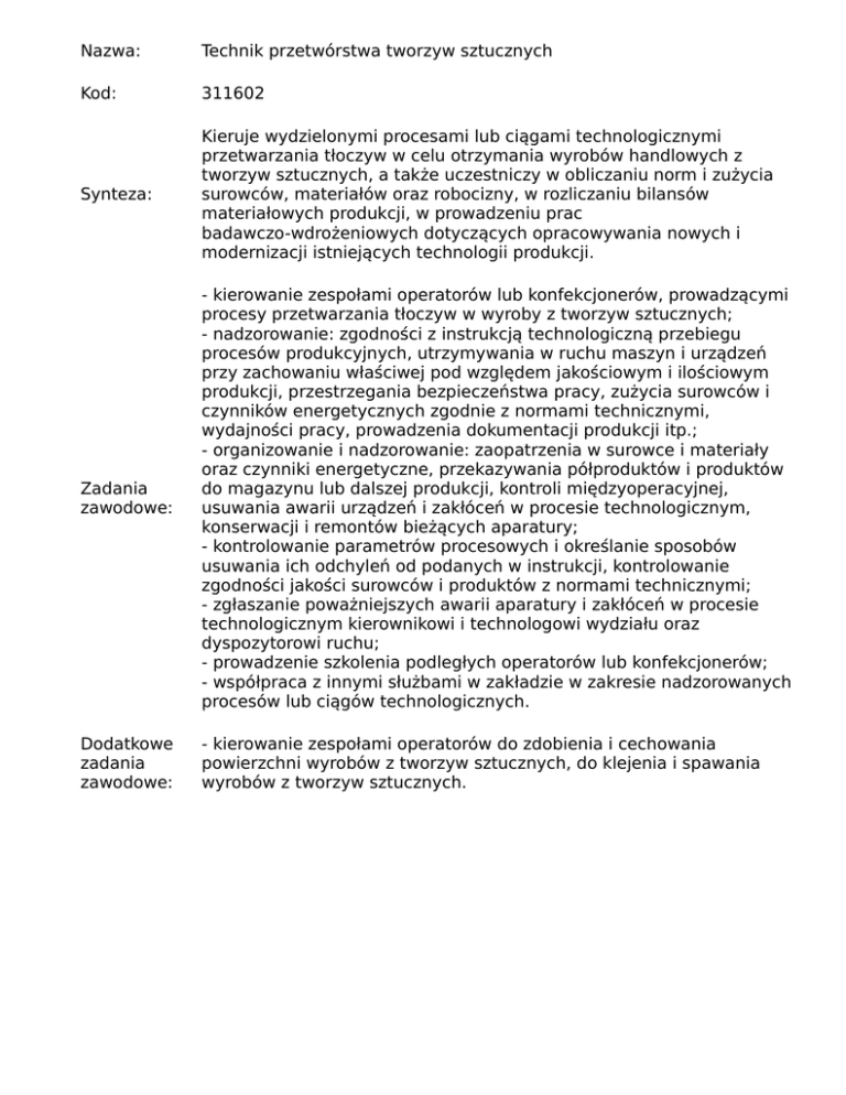 Nazwa: Technik przetwórstwa tworzyw sztucznych Kod: 311602 Synteza: Kieruje wydzielonymi procesami lub ciągami technologicznymi przetwarzania tłoczyw w celu otrzymania wyrobów handlowych z tworzyw sztucznych, a także uczestniczy w obliczaniu norm i zużycia surowców, materiałów oraz robocizny, w rozliczaniu bilansów materiałowych produkcji, w prowadzeniu prac badawczo-wdrożeniowych dotyczących opracowywania nowych i modernizacji istniejących technologii produkcji. Zadania zawodowe: - kierowanie zespołami operatorów lub konfekcjonerów, prowadzącymi procesy przetwarzania tłoczyw w wyroby z tworzyw sztucznych; - nadzorowanie: zgodności z instrukcją technologiczną przebiegu procesów produkcyjnych, utrzymywania w ruchu maszyn i urządzeń przy zachowaniu właściwej pod względem jakościowym i ilościowym produkcji, przestrzegania bezpieczeństwa pracy, zużycia surowców i czynników energetycznych zgodnie z normami technicznymi, wydajności pracy, prowadzenia dokumentacji produkcji itp.; - organizowanie i nadzorowanie: zaopatrzenia w surowce i materiały oraz czynniki energetyczne, przekazywania półproduktów i produktów do magazynu lub dalszej produkcji, kontroli międzyoperacyjnej, usuwania awarii urządzeń i zakłóceń w procesie technologicznym, konserwacji i remontów bieżących aparatury; - kontrolowanie parametrów procesowych i określanie sposobów usuwania ich odchyleń od podanych w instrukcji, kontrolowanie zgodności jakości surowców i produktów z normami technicznymi; - zgłaszanie poważniejszych awarii aparatury i zakłóceń w procesie technologicznym kierownikowi i technologowi wydziału oraz dyspozytorowi ruchu; - prowadzenie szkolenia podległych operatorów lub konfekcjonerów; - współpraca z innymi służbami w zakładzie w zakresie nadzorowanych procesów lub ciągów technologicznych. Dodatkowe zadania zawodowe: - kierowanie zespołami operatorów do zdobienia i cechowania powierzchni wyrobów z tworzyw sztucznych, do klejenia i spawania wyrobów z tworzyw sztucznych.
