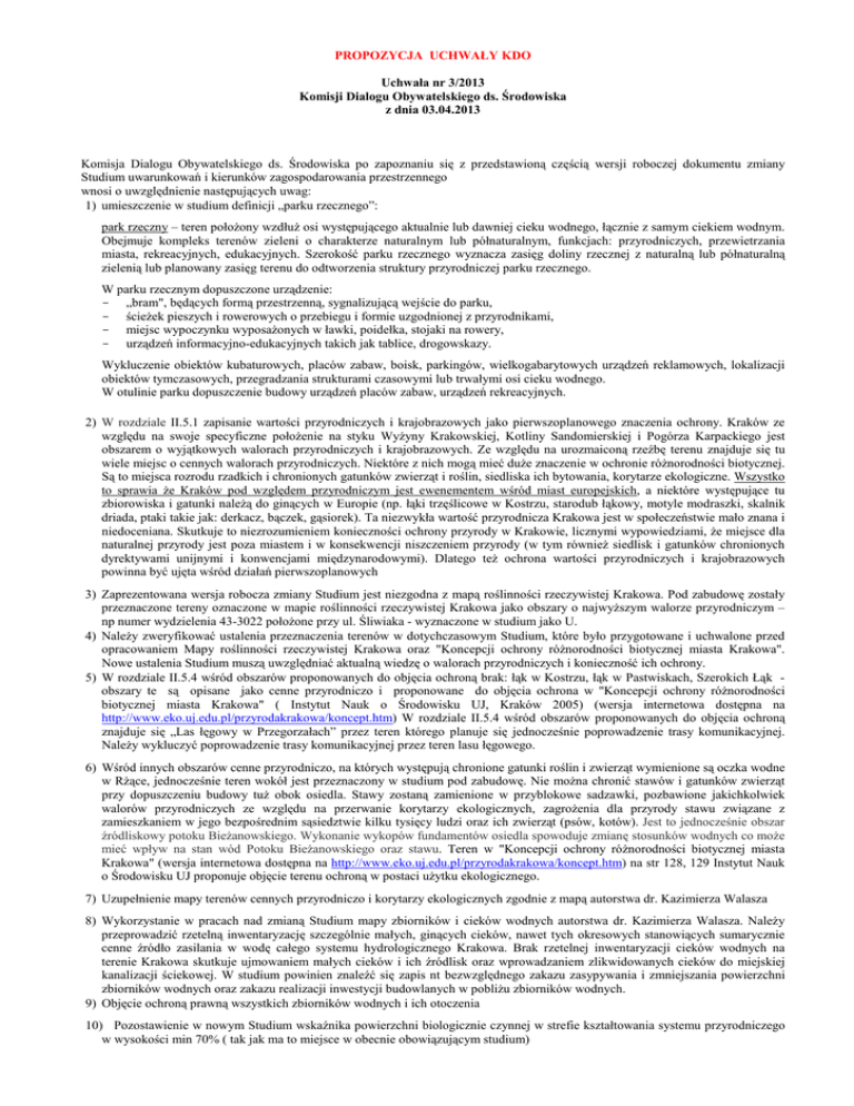 PROPOZYCJA UCHWAŁY KDO Uchwała nr 3/2013 Komisji Dialogu Obywatelskiego ds. Środowiska z dnia 03.04.2013 Komisja Dialogu Obywatelskiego ds. Środowiska po zapoznaniu się z przedstawioną częścią wersji roboczej dokumentu zmiany Studium uwarunkowań i kierunków zagospodarowania przestrzennego wnosi o uwzględnienie następujących uwag: 1) umieszczenie w studium definicji „parku rzecznego”: park rzeczny – teren połoŜony wzdłuŜ osi występującego aktualnie lub dawniej cieku wodnego, łącznie z samym ciekiem wodnym. Obejmuje kompleks terenów zieleni o charakterze naturalnym lub półnaturalnym, funkcjach: przyrodniczych, przewietrzania miasta, rekreacyjnych, edukacyjnych. Szerokość parku rzecznego wyznacza zasięg doliny rzecznej z naturalną lub półnaturalną zielenią lub planowany zasięg terenu do odtworzenia struktury przyrodniczej parku rzecznego. W parku rzecznym dopuszczone urządzenie: - „bram", będących formą przestrzenną, sygnalizującą wejście do parku, - ścieŜek pieszych i rowerowych o przebiegu i formie uzgodnionej z przyrodnikami, - miejsc wypoczynku wyposaŜonych w ławki, poidełka, stojaki na rowery, - urządzeń informacyjno-edukacyjnych takich jak tablice, drogowskazy. Wykluczenie obiektów kubaturowych, placów zabaw, boisk, parkingów, wielkogabarytowych urządzeń reklamowych, lokalizacji obiektów tymczasowych, przegradzania strukturami czasowymi lub trwałymi osi cieku wodnego. W otulinie parku dopuszczenie budowy urządzeń placów zabaw, urządzeń rekreacyjnych. 2) W rozdziale II.5.1 zapisanie wartości przyrodniczych i krajobrazowych jako pierwszoplanowego znaczenia ochrony. Kraków ze względu na swoje specyficzne połoŜenie na styku WyŜyny Krakowskiej, Kotliny Sandomierskiej i Pogórza Karpackiego jest obszarem o wyjątkowych walorach przyrodniczych i krajobrazowych. Ze względu na urozmaiconą rzeźbę terenu znajduje się tu wiele miejsc o cennych walorach przyrodniczych. Niektóre z nich mogą mieć duŜe znaczenie w ochronie róŜnorodności biotycznej. Są to miejsca rozrodu rzadkich i chronionych gatunków zwierząt i roślin, siedliska ich bytowania, korytarze ekologiczne. Wszystko to sprawia Ŝe Kraków pod względem przyrodniczym jest ewenementem wśród miast europejskich, a niektóre występujące tu zbiorowiska i gatunki naleŜą do ginących w Europie (np. łąki trzęślicowe w Kostrzu, starodub łąkowy, motyle modraszki, skalnik driada, ptaki takie jak: derkacz, bączek, gąsiorek). Ta niezwykła wartość przyrodnicza Krakowa jest w społeczeństwie mało znana i niedoceniana. Skutkuje to niezrozumieniem konieczności ochrony przyrody w Krakowie, licznymi wypowiedziami, Ŝe miejsce dla naturalnej przyrody jest poza miastem i w konsekwencji niszczeniem przyrody (w tym równieŜ siedlisk i gatunków chronionych dyrektywami unijnymi i konwencjami międzynarodowymi). Dlatego teŜ ochrona wartości przyrodniczych i krajobrazowych powinna być ujęta wśród działań pierwszoplanowych 3) Zaprezentowana wersja robocza zmiany Studium jest niezgodna z mapą roślinności rzeczywistej Krakowa. Pod zabudowę zostały przeznaczone tereny oznaczone w mapie roślinności rzeczywistej Krakowa jako obszary o najwyŜszym walorze przyrodniczym – np numer wydzielenia 43-3022 połoŜone przy ul. Śliwiaka - wyznaczone w studium jako U. 4) NaleŜy zweryfikować ustalenia przeznaczenia terenów w dotychczasowym Studium, które było przygotowane i uchwalone przed opracowaniem Mapy roślinności rzeczywistej Krakowa oraz "Koncepcji ochrony róŜnorodności biotycznej miasta Krakowa". Nowe ustalenia Studium muszą uwzględniać aktualną wiedzę o walorach przyrodniczych i konieczność ich ochrony. 5) W rozdziale II.5.4 wśród obszarów proponowanych do objęcia ochroną brak: łąk w Kostrzu, łąk w Pastwiskach, Szerokich Łąk obszary te są opisane jako cenne przyrodniczo i proponowane do objęcia ochrona w "Koncepcji ochrony róŜnorodności biotycznej miasta Krakowa" ( Instytut Nauk o Środowisku UJ, Kraków 2005) (wersja internetowa dostępna na http://www.eko.uj.edu.pl/przyrodakrakowa/koncept.htm) W rozdziale II.5.4 wśród obszarów proponowanych do objęcia ochroną znajduje się „Las łęgowy w Przegorzałach” przez teren którego planuje się jednocześnie poprowadzenie trasy komunikacyjnej. NaleŜy wykluczyć poprowadzenie trasy komunikacyjnej przez teren lasu łęgowego. 6) Wśród innych obszarów cenne przyrodniczo, na których występują chronione gatunki roślin i zwierząt wymienione są oczka wodne w RŜące, jednocześnie teren wokół jest przeznaczony w studium pod zabudowę. Nie moŜna chronić stawów i gatunków zwierząt przy dopuszczeniu budowy tuŜ obok osiedla. Stawy zostaną zamienione w przyblokowe sadzawki, pozbawione jakichkolwiek walorów przyrodniczych ze względu na przerwanie korytarzy ekologicznych, zagroŜenia dla przyrody stawu związane z zamieszkaniem w jego bezpośrednim sąsiedztwie kilku tysięcy ludzi oraz ich zwierząt (psów, kotów). Jest to jednocześnie obszar źródliskowy potoku BieŜanowskiego. Wykonanie wykopów fundamentów osiedla spowoduje zmianę stosunków wodnych co moŜe mieć wpływ na stan wód Potoku BieŜanowskiego oraz stawu. Teren w "Koncepcji ochrony róŜnorodności biotycznej miasta Krakowa" (wersja internetowa dostępna na http://www.eko.uj.edu.pl/przyrodakrakowa/koncept.htm) na str 128, 129 Instytut Nauk o Środowisku UJ proponuje objęcie terenu ochroną w postaci uŜytku ekologicznego. 7) Uzupełnienie mapy terenów cennych przyrodniczo i korytarzy ekologicznych zgodnie z mapą autorstwa dr. Kazimierza Walasza 8) Wykorzystanie w pracach nad zmianą Studium mapy zbiorników i cieków wodnych autorstwa dr. Kazimierza Walasza. NaleŜy przeprowadzić rzetelną inwentaryzację szczególnie małych, ginących cieków, nawet tych okresowych stanowiących sumarycznie cenne źródło zasilania w wodę całego systemu hydrologicznego Krakowa. Brak rzetelne