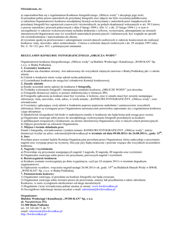 Oświadczam, że: a) zapoznałem/łam się z regulaminem Konkursu fotograficznego „Oblicze wody” i akceptuje jego treść; b) posiadam pełnie prawo autorskich do przesłanej fotografii oraz zdjęcie nie było wcześniej publikowane; c) udzielam Organizatorowi konkursu nieodpłatnej licencji na korzystanie z autorskich praw majątkowych do przesłanej fotografii bez ograniczeń czasowych i terytorialnych, na polach eksploatacji wskazanych w art. 50 Ustawy o prawie autorskim i prawach pokrewnych z dnia 4 lutego 1994 r. (Dz. U. z dn. 23 lutego 1994 r.), w tym w szczególności w zakresie wykorzystywania technika drukarska i cyfrowa, wystawiania, udostępniania na stronach internetowych Organizatora oraz we wszelkich materiałach promocyjnych i reklamowych, bez względu na sposób ich zwielokrotniania i wprowadzania do obrotu; d) wyrażam zgodę na przetwarzanie i udostępnianie swoich danych osobowych w zakresie koniecznym do realizacji konkursu: imię, nazwisko, adres zamieszkania - Ustawa o ochronie danych osobowych z dn. 29 sierpnia 1997 roku, Dz. U. Nr 133, poz. 833, z późniejszymi zmianami. REGULAMIN KONKURSU FOTOGRAFICZNEGO „OBLICZA WODY” Organizatorem konkursu fotograficznego „Oblicze wody” są Bialskie Wodociągi i Kanalizacja „WOD-KAN” Sp. z o.o. w Białej Podlaskiej. 1. Uczestnicy konkursu a) Konkurs ma charakter otwarty. Jest adresowany do wszystkich chętnych zarówno z Białej Podlaskiej jak i z okolic miasta. b) Udział w konkursie może wziąć udział osoba pełnoletnia. c) Uczestnikami konkursu nie mogą być członkowie Komisji konkursowej. 2. Zasady udziału a) Każdy uczestnik może zgłosić do konkursu 1 fotografię. b) Technika wykonania fotografii i interpretacja tematyki konkursu „OBLICZE WODY” jest dowolna. c) Fotografie dostarczyć należy w postaci elektronicznej w formacie JPG. d) Fotografia zgłoszona na konkurs musi być wyraźna, w kolorze, oraz w emailu musi być zawarte następujące informacje: imię, nazwisko, wiek, adres, w tytule tematu: „KONKURS FOTOGRAFICZNY „Oblicze wody”, oraz oświadczenie. e) Uczestnicy zgłaszający swój udział w konkursie poprzez poprawne nadesłanie i zamieszczenie wszystkich informacji, które są wymagane przez Organizatora automatycznie potwierdza zapoznanie się z regulaminem konkursu i jego akceptacje. f) Jakakolwiek niezgodność lub braki w nadesłanym emailu w konkursie nie będą brane pod uwagę przy ocenie. g) Organizator zastrzega sobie prawo do nieodpłatnego wykorzystania fotografii przesłanych na konkurs w publikacjach związanych z konkursem, na stronie internetowej Organizatora oraz w innych celach promocyjnych. h) Zdjęcie przechodzi na własność Organizatora. 3. Miejsce i termin składania prac Email z fotografią, oświadczeniem i tytułem tematu: KONKURS FOTOGRAFICZNY „Oblicze wody”, należy dostarczyć/wysłać na adres: [email protected] w terminie od dnia 09.08.2011r do 24.08.2011r., godz. 1200. 4. Jury Przesłane prace oceniać będzie Komisja Organizacyjna powołana przez Organizatora, która zadecyduje o przyznaniu nagród oraz wytypuje prace na wystawę. Decyzje jury będą ostateczne i prawnie wiążące dla wszystkich uczestników konkursu. 5. Nagrody i wyróżnienia a) Przewiduje się przyznanie następujących nagród: I nagroda, II nagroda, III nagroda oraz wyróżnień. b) Organizator zastrzega sobie prawo nie przyznania, pierwszych nagród i wyróżnień. 6. Rozstrzygniecie konkursu a) Konkurs zostanie rozstrzygnięty po dniu wygaśnięcia, czyli po 24 sierpnia 2011r w terminie dogodnym organizatorowi. b) Ogłoszenie wyników, wręczenie nagród nastąpi 26.08.2011r ok. godz. 1430 na Bialskich Dniach Wody w BWiK „WOD-KAN” Sp. z o.o. w Białej Podlaskiej. 7. Postanowienia końcowe 1) Organizator zastrzega, iż przesłane na konkurs fotografie nie będą zwracane. 2) Organizator zastrzega sobie również prawo do przerwania, zmiany lub przedłużenia a także odwołania Konkursu, w razie wystąpienia okoliczności od niego niezależnych. 3) Regulamin i treść oświadczenia pobrać można ze strony: www.bwikwodkan.pl 4) Szczegółowe informacje można uzyskać e-mail: [email protected] Organizator: Bialskie Wodociągi i Kanalizacje „WOD-KAN” Sp. z o.o. ul. Narutowicza 35A 21-500 Biała Podlaska tel.: 83 343-60-71 do 73 email: [email protected] http://bwikwodkan.pl/