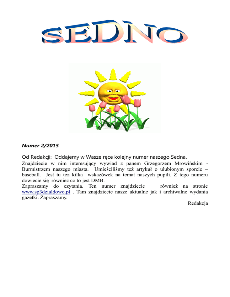 Numer 2/2015 Od Redakcji: Oddajemy w Wasze ręce kolejny numer naszego Sedna. Znajdziecie w nim interesujący wywiad z panem Grzegorzem Mrowińskim Burmistrzem naszego miasta. Umieściliśmy też artykuł o ulubionym sporcie – baseball. Jest tu tez kilka wskazówek na temat naszych pupili. Z tego numeru dowiecie się również co to jest DMB. Zapraszamy do czytania. Ten numer znajdziecie również na stronie www.sp3dzialdowo.pl . Tam znajdziecie nasze aktualne jak i archiwalne wydania gazetki. Zapraszamy. Redakcja WYWIAD Dzień dobry nazywam się Karol Bejgiert i jestem redaktorem naczelnym gazetki „Sedno”. Przeprowadzę wywiad z Burmistrzem miasta Działdowa panem Grzegorzem Mrowińskim. Dzień dobry. Jest mi bardzo miło. Grzegorz Mrowiński. Pierwsze pytanie: Jak Pan wspomina czas spędzony w naszej szkole i co Panu utkwiło w pamięci? Czas spędzony w szkole podstawowej każdy dorosły wspomina najcieplej i najchętniej cofa się do tamtych wydarzeń. Do Szkoły Podstawowej Nr 3 uczęszczałem 7 długich i wspaniałych lat. W pierwszej klasie uczęszczałem do SP nr 1, natomiast do SP nr 3 dołączyłem od drugiej klasy, w momencie oddania szkoły do użytku. Mieszkałem wtedy na ulicy Łąkowej, która znajduje się w centrum miasta. Dobrze pamiętam, że uczyliśmy się na dwie zmiany. W niektóre dni lekcje zaczynaliśmy o godz. 8.00, a w inne po południu i wtedy wracaliśmy do domów po godz. 18.00, gdy było już ciemno. Bardzo dobrze wspominam swoją klasę. Spędzaliśmy razem dużo czasu, ponieważ w czasach mojego dzieciństwa telewizja miała ubogą ofertę, nie było komputerów, telefonów, więc spotykaliśmy się na dworze wymyślając różne zabawy. Jakie przedmioty lubił Pan najbardziej ? Lubiłem i lubię do dziś matematykę. Wyjątkowo ciekawe były zajęcia, których obecnie już nie ma a dokładnie to ZPT czyli zajęcia praktyczno-techniczne. Prowadził je mój wychowawca, którego bardzo pamiętam, pan Marek Rzepczyński aktualnie nauczyciel informatyki. W klasie siódmej i ósmej, wychowawstwo przejęła pani Elżbieta Aleksandrowicz, nauczycielka matematyki. Natomiast moją przygodę z edukacją w SP nr 3 rozpocząłem pod okiem pani Bożeny Umińskiej. Mój pierwszy kontakt z komputerem miałem w klasie 6. Było to wielkie wydarzenie, nie wiedzieliśmy jeszcze do czego może on służyć. Szczególnie miło wspominam zajęcia języka polskiego i panią Marię Rzepczyńską, bardzo wymagającego pedagoga. Jeżeli mówimy o nauczycielach, to bardzo ciepło wspominam panią Zofie Jankowską. Obecnie pani Zofia pracuje w bibliotece szkolnej, natomiast w latach mojego dzieciństwa uczyła mnie historii. Na pracach klasowych pisaliśmy wypracowania. Zajęcia te ukształtowały mnie zawodowo. Był czas, że ja również uczyłem historii i zapewne będę jeszcze uczył. Czy w Pana szkolnej edukacji było wydarzenie które zapadło Panu w pamięci ? W roku 1987 roku brałem udział w konkursie wiedzy o patronie szkoły Bronisławie Malinowskim. Nasza klasa przygotowywała się to tego konkursu bardzo dobrze. Zajęliśmy pierwsze miejsce. Jednakże w Święto Szkoły odbył się finał. Ostatecznie zająłem drugie miejsce. Nie rozróżniałem tytułu mistrza olimpijskiego od mistrza świata. Przegrałem z koleżanką Iwoną Kołodziejczyk. Następnie pojechałem na Zlot Szkół do Grudziądza. Tam w międzyszkolnym konkursie wiedzy zająłem pierwsze miejsce. Również dobrze pamiętam nadanie imienia szkole, podniosły moment przywiezienia i odsłonięcia głazu pamiątkowego, który stoi przed budynkiem. Natomiast w trzeciej klasie awaryjnie lądował helikopter w miejscu, gdzie obecnie stoją bloki. Wszyscy byliśmy tak podekscytowani, że nauczyciele nie mogli nad nami zapanować. Rzadkością był widok helikoptera lecącego nad miastem, o lądowaniu można było tylko pomarzyć. Pamiętam jeszcze katastrofę w Czarnobylu w 1986. W szkole musieliśmy pić płyn Lugola. Nie byliśmy świadomi skutków wybuchu w elektrowni atomowej. Wszyscy staliśmy w rzędzie przed gabinetem pielęgniarki. Jednak mnie bardzo rozśmieszył moment, gdy w tym dniu jeden z moich kolegów przyszedł do szkoły w masce przeciwgazowej. Oczywiście dla żartów. Jak wyglądała szkoła kiedy Pan do niej uczęszczał i jak ona się zmieniła. Szczerze powiem, że szkoła była i jest bardzo nowoczesna. Oczywiście jest duża przepaść między szkołą mojego dzieciństwa a obecną. W momencie kiedy ja tutaj chodziłem wszystko było nowe. Nowe ławki, meble, pomoce dydaktyczne. Zewnętrznie wszyscy byliśmy podobni. Chodziliśmy w mundurkach, w takich samych chińskich trampkach. Nikt się nie wyróżniał. Nikt nie odstawał. Nikt nikomu nie dokuczał z powodu ubioru. Nie mieliśmy tabletów i telefonów i dlatego byliśmy szczęśliwsi. Przynajmniej tak mi się wydaje. Jedyna niedogodność, którą pamiętam to zajęcia wychowania fizycznego na korytarzu, które odbywały się w ten sposób do momentu oddania sali. To by było na tyle. Bardzo serdecznie dziękuję Panu za wywiad. Tez bardzo dziękuje i pozdrawiam całą społeczność szkoły. Do widzenia Do widzenia Karol Bejgiert Baseball Pochodzenie baseballu jest niejasne. Ciągle trwają spory, która z wcześniejszych gier mogła dać początek temu sportowi. Najczęściej wymienia się krykiet. Baseball jest podobny do staroangielskiej gry zwanej runders, w którą grano w Ameryce w XVIII w. Zmieniające się stopniowo zasady gry spisano w 1845r.[1]W tym roku powstał w Nowym Jorku klub the Knickerbockers, w którym grano w Baseballa. Zasady i przepisy gry zostały skodyfikowane przez Alexandra Cartwrighta. Przepisy te w wielu punktach jeszcze odbiegały od współczesnych, lecz podstawowe zasady pozostały te same. W drugiej połowie lat osiemdziesiątych XIX wieku baseball nabierał popularności, by stać się jedną z najpopularniejszych gier rekreacyjnych klasy średniej w USA. Już w czasie wojny secesyjnej mec