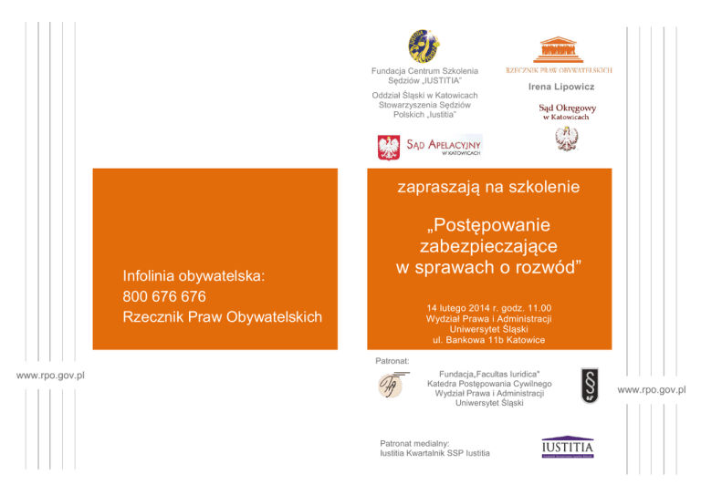 Fundacja Centrum Szkolenia Sędziów „IUSTITIA” Oddział Śląski w Katowicach Stowarzyszenia Sędziów Polskich „Iustitia” Irena Lipowicz zapraszają na szkolenie Infolinia obywatelska: 800 676 676 Rzecznik Praw Obywatelskich „Postępowanie zabezpieczające w sprawach o rozwód” 14 lutego 2014 r. godz. 11.00 Wydział Prawa i Administracji Uniwersytet Śląski ul. Bankowa 11b Katowice Patronat: www.rpo.gov.pl Fundacja„Facultas Iuridica" Katedra Postępowania Cywilnego Wydział Prawa i Administracji Uniwersytet Śląski Patronat medialny: Iustitia Kwartalnik SSP Iustitia www.rpo.gov.pl PROGRAM 12.45–13.45 09.30–10.00 Rejestracja uczestników 10.00–10.15 Powitanie Grzegorz Frączek, dyrektor Ośrodka Mediacji „Facultas Iuridica” przy WPiA UŚ dyskusja prof. Irena Lipowicz, Rzecznik Praw Obywatelskich SSR Edyta Bronowicka, Prezes Fundacji Centrum Szkolenia Sędziów „Iustitia” SSA Roman Sugier, Prezes Sądu Apelacyjnego w Katowicach 13.45–14.45 „Problemy związane z wysłuchaniem małoletnich w postępowaniu rodzinnym i rozwodowym – propozycja standardów wysłuchania, oceny wartości wypowiedzi dziecka” Alicja Budzyńska, psycholog w Fundacji Dzieci Niczyje dyskusja 14.45 Podsumowanie 15.00 Zakończenie 10.15–11.15 „Postępowanie zabezpieczające w sprawach o rozwód – problemy praktyczne” Anna Bohdziewicz Sędzia Sądu Apelacyjnego w Katowicach dyskusja 11.15–12.15 „Postępowanie zabezpieczające w sprawach o rozwód – analiza” adw. dr Marcin Cieśliński, wykładowca UW dyskusja „Mediacja w sprawach o rozwód i separację, z uwzględnieniem interesu małoletnich dzieci.” adw. Monika Stachura, mediator w sprawach cywilnych i rodzinnych w Centrum Rozwiązywania Sporów i Konfliktów przy WPiA UW Prowadzenie: dr Krystian Markiewicz Prezes Oddziału Śląskiego w Katowicach Stowarzyszenia Sędziów Polskich „Iustitia” Prosimy o potwierdzenie udziału do dnia 7 lutego 2014 r. 12.15–12.45 Przerwa w Biurze Rzecznika Praw Obywatelskich: tel. (0 22) 55 17 985, e-mail: [email protected] lub w Fundacji Centrum Szkolenia Sędziów „IUSTITIA” tel. (0 22) 535-88-31, e-mail [email protected] Liczba miejsc ograniczona