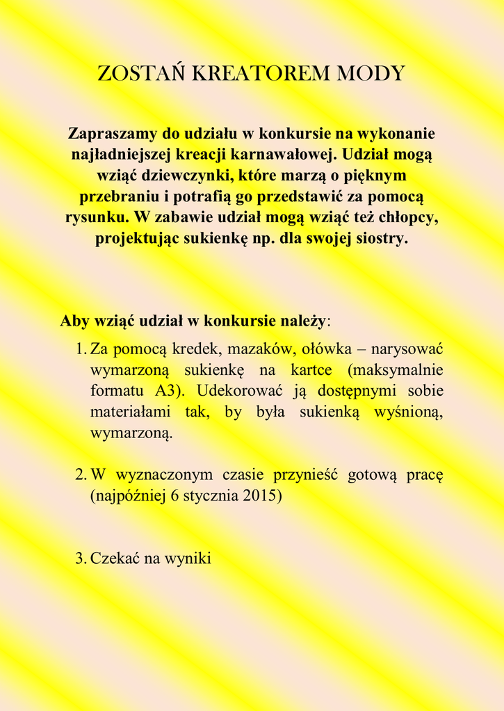 ZOSTAŃ KREATOREM MODY Zapraszamy do udziału w konkursie na wykonanie najładniejszej kreacji karnawałowej. Udział mogą wziąć dziewczynki, które marzą o pięknym przebraniu i potrafią go przedstawić za pomocą rysunku. W zabawie udział mogą wziąć też chłopcy, projektując sukienkę np. dla swojej siostry. Aby wziąć udział w konkursie należy: 1. Za pomocą kredek, mazaków, ołówka – narysować wymarzoną sukienkę na kartce (maksymalnie formatu A3). Udekorować ją dostępnymi sobie materiałami tak, by była sukienką wyśnioną, wymarzoną. 2. W wyznaczonym czasie przynieść gotową pracę (najpóźniej 6 stycznia 2015) 3. Czekać na wyniki REGULAMIN 1. W konkursie mogą brać udział dzieci z naszego przedszkola 2. Każde dziecko może przynieść jedną gotową pracę 3. Narysowana kreacja powinna być autorskim pomysłem, a nie być całkowicie przerysowana np. z ulubionej bajki (możliwe jest wykorzystanie elementów sukien ale nie powinno się całkowicie kopiować kreacji) 4. Przygotowując pracę można poprosić o pomoc rodzica bądź rodzeństwo 5. Z wszystkich otrzymanych prac powołane jury wybierze najlepiej wykonaną pracę, a będziemy zwracać uwagę na: staranność i dokładność w pokazaniu detali pomysłowość w przygotowaniu pracy zaangażowanie dziecka w wykonanie zadania użycie elementów dodatkowych, dekoracyjnych 6. Osoba, która wygra w konkursie, otrzyma sukienkę (kreację) wg zaproponowanego przez siebie wzoru ZAPRASZAMY DO PROJEKTOWANIA !!