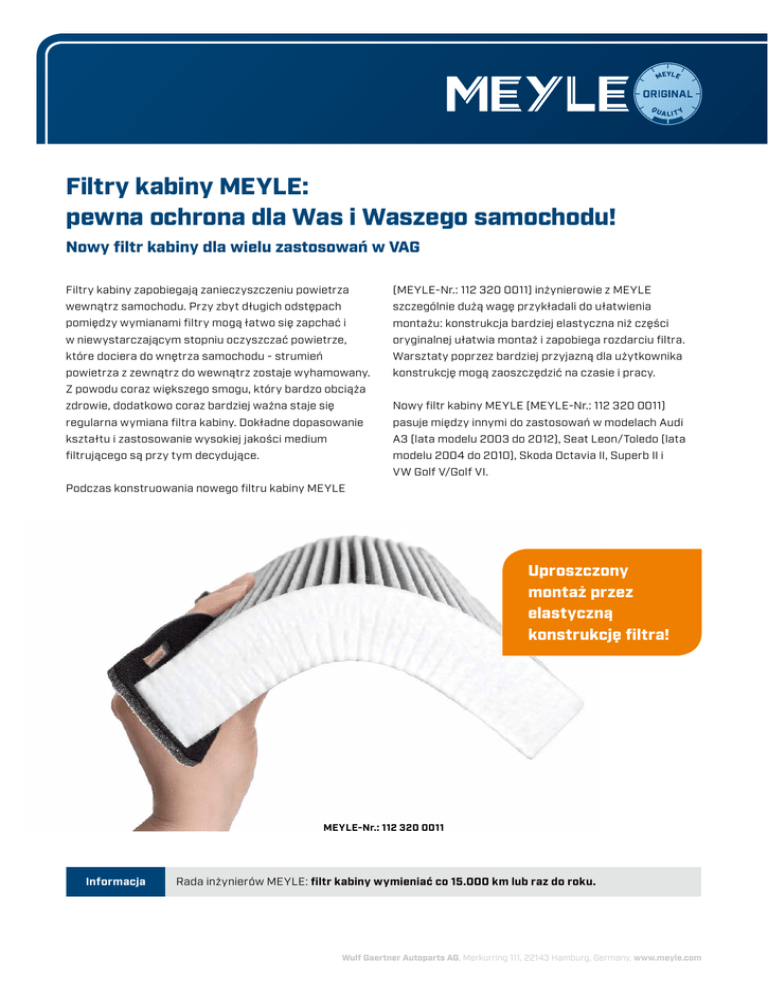 Filtry kabiny MEYLE: pewna ochrona dla Was i Waszego samochodu! Nowy filtr kabiny dla wielu zastosowań w VAG Filtry kabiny zapobiegają zanieczyszczeniu powietrza (MEYLE-Nr.: 112 320 0011) inżynierowie z MEYLE wewnątrz samochodu. Przy zbyt długich odstępach szczególnie dużą wagę przykładali do ułatwienia pomiędzy wymianami filtry mogą łatwo się zapchać i montażu: konstrukcja bardziej elastyczna niż części w niewystarczającym stopniu oczyszczać powietrze, oryginalnej ułatwia montaż i zapobiega rozdarciu filtra. które dociera do wnętrza samochodu - strumień Warsztaty poprzez bardziej przyjazną dla użytkownika powietrza z zewnątrz do wewnątrz zostaje wyhamowany. konstrukcję mogą zaoszczędzić na czasie i pracy. Z powodu coraz większego smogu, który bardzo obciąża zdrowie, dodatkowo coraz bardziej ważna staje się Nowy filtr kabiny MEYLE (MEYLE-Nr.: 112 320 0011) regularna wymiana filtra kabiny. Dokładne dopasowanie pasuje między innymi do zastosowań w modelach Audi kształtu i zastosowanie wysokiej jakości medium A3 (lata modelu 2003 do 2012), Seat Leon/Toledo (lata filtrującego są przy tym decydujące. modelu 2004 do 2010), Skoda Octavia II, Superb II i VW Golf V/Golf VI. Podczas konstruowania nowego filtru kabiny MEYLE Uproszczony montaż przez elastyczną konstrukcję filtra! MEYLE-Nr.: 112 320 0011 Informacja Rada inżynierów MEYLE: filtr kabiny wymieniać co 15.000 km lub raz do roku. Wulf Gaertner Autoparts AG, Merkurring 111, 22143 Hamburg, Germany, www.meyle.com