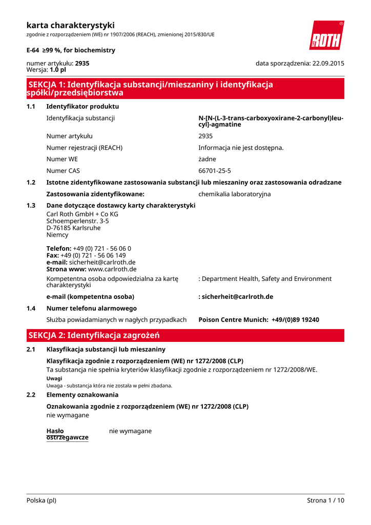 karta charakterystyki zgodnie z rozporządzeniem (WE) nr 1907/2006 (REACH), zmienionej 2015/830/UE E-64 ≥99 %, for biochemistry numer artykułu: 2935 Wersja: 1.0 pl data sporządzenia: 22.09.2015 SEKCJA 1: Identyfikacja substancji/mieszaniny i identyfikacja spółki/przedsiębiorstwa 1.1 1.2 Identyfikator produktu Identyfikacja substancji N-[N-(L-3-trans-carboxyoxirane-2-carbonyl)leucyl]-agmatine Numer artykułu 2935 Numer rejestracji (REACH) Informacja nie jest dostępna. Numer WE żadne Numer CAS 66701-25-5 Istotne zidentyfikowane zastosowania substancji lub mieszaniny oraz zastosowania odradzane Zastosowania zidentyfikowane: 1.3 chemikalia laboratoryjna Dane dotyczące dostawcy karty charakterystyki Carl Roth GmbH + Co KG Schoemperlenstr. 3-5 D-76185 Karlsruhe Niemcy Telefon: +49 (0) 721 - 56 06 0 Fax: +49 (0) 721 - 56 06 149 e-mail: [email protected] Strona www: www.carlroth.de 1.4 Kompetentna osoba odpowiedzialna za kartę charakterystyki : Department Health, Safety and Environment e-mail (kompetentna osoba) : [email protected] Numer telefonu alarmowego Służba powiadamianych w nagłych przypadkach Poison Centre Munich: +49/(0)89 19240 SEKCJA 2: Identyfikacja zagrożeń 2.1 Klasyfikacja substancji lub mieszaniny Klasyfikacja zgodnie z rozporządzeniem (WE) nr 1272/2008 (CLP) Ta substancja nie spełnia kryteriów klasyfikacji zgodnie z rozporządzeniem nr 1272/2008/WE. Uwagi Uwaga - substancja która nie została w pełni zbadana. 2.2 Elementy oznakowania Oznakowania zgodnie z rozporządzeniem (WE) nr 1272/2008 (CLP) nie wymagane Hasło ostrzegawcze Polska (pl) nie wymagane Strona 1 / 10 karta charakterystyki zgodnie z rozporządzeniem (WE) nr 1907/2006 (REACH), zmienionej 2015/830/UE E-64 ≥99 %, for biochemistry numer artykułu: 2935 2.3 Inne zagrożenia Nie ma dodatkowych informacji. SEKCJA 3: Skład/informacja o składnikach 3.1 Substancje Nazwa substancji N-[N-(L-3-trans-carboxyoxirane-2carbonyl)leucyl]-agmatine Numer CAS 66701-25-5 Wzór cząsteczkowy C₁₅H₂₇N₅O₅ Masa cząsteczkowa 357,4 g/mol SEKCJA 4: Środki pierwszej pomocy 4.1 Opis środków pierwszej pomocy Uwagi ogólne Zdjąć zanieczyszczoną odzież. Po narażeniu przez drogi oddechowe Zapewnić dostęp do świeżego powietrza. Zasięgnąć porady lekarza w przypadku pojawienia się jakichkolwiek wątpliwości, lub jeżeli objawy nie ustępują. Po kontakcie ze skórą Spłukać skórę pod strumieniem wody/prysznicem. Należy udać się do dermatologa. Po kontakcie z oczami Ostrożnie płukać wodą przez kilka minut. Zasięgnąć porady lekarza w przypadku pojawienia się jakichkolwiek wątpliwości, lub jeżeli objawy nie ustępują. Po narażeniu przez przewód pokarmowy Wypłukać usta. W przypadku złego samopoczucia skontaktować się z lekarzem. 4.2 Najważniejsze ostre i opóźnione objawy oraz skutki narażenia Objawy i skutki dotychczas nie są znane 4.3 Wskazania dotyczące wszelkiej natychmiastowej pomocy lekarskiej i szczególnego postępowania z poszkodowanym żadne Polska (pl) Strona 2 / 10 karta charakterystyki zgodnie z rozporządzeniem (WE) nr 1907/2006 (REACH), zmienionej 2015/830/UE E-64 ≥99 %, for biochemistry numer artykułu: 2935 SEKCJA 5: Postępowanie w przypadku pożaru 5.1 Środki gaśnicze Odpowiednie środki gaśnicze Środki gaśnicze należy dostosować do otoczenia rozpylona woda, piana, suchy proszek gaśniczy, dwutlenek węgla (CO2) Niewłaściwe środki gaśnicze silny strumień wody 5.2 Szczególne zagrożenia związane z substancją lub mieszaniną Palny. Produkty spalania stwarzające zagrożenie Podczas pożaru mogą powstawać: tlenki azotu (NOx), tlenek węgla (CO), dwutlenek węgla (CO2) 5.3 Informacje dla straży pożarnej Gasić pożar z rozsądnej odległości z zachowaniem zwykłych środków ostrożności. Nosić autonomiczny aparat oddechowy. SEKCJA 6: Postępowanie w przypadku niezamierzonego uwolnienia do środowiska 6.1 Indywidualne środki ostrożności, sprzęt ochronny i procedury w sytuacjach awaryjnych Dla osób nienależących do personelu udzielającego pomocy Ograniczenie pylenia. 6.2 Środki ostrożności w zakresie ochrony środowiska Zapobiegać przedostaniu się do kanalizacji, wód powierzchniowych i gruntowych. 6.3 Metody i materiały zapobiegające rozprzestrzenianiu się skażenia i służące do usuwania skażenia Porady na temat zapobiegania rozprzestrzenianiu się wycieku Przykrywanie kanalizacji. Porady na temat sposobu czyszczenia wycieku Zbierać mechanicznie. Inne informacje związane z wyciekiem lub uwolnieniem Umieścić w odpowiednich pojemnikach do usunięcia. Odniesienia do innych sekcji Niebezpieczne produkty powstające podczas spalania: zob. sekcja 5. Osobiste wyposażenie ochronne: zob. sekcja 8. Materiały niezgodne: zob. sekcja 10. Postępowanie z odpadami: zob. sekcja 13. Polska (pl) Strona 3 / 10 karta charakterystyki zgodnie z rozporządzeniem (WE) nr 1907/2006 (REACH), zmienionej 2015/830/UE E-64 ≥99 %, for biochemistry numer artykułu: 2935 SEKCJA 7: Postępowanie z substancjami i mieszaninami oraz ich magazynowanie 7.1 Środki ostrożności dotyczące bezpiecznego postępowania Nie są wymagane żadne dodatkowe środki ostrożności. Zalecenia dotyczące ogólnej higieny pracy Nie przechowywać razem z żywnością, napojami i paszami dla zwierząt. 7.2 Warunki bezpiecznego magazynowania, w tym informacje dotyczące wszelkich wzajemnych niezgodności Przechowywać pojemnik szczelnie zamknięty w chłodnym miejscu. Przechowywać w suchym miejscu. Niezgodne substancje lub mieszaniny Obserwować zgodność przechowywania. Uwzglednienie innych zaleceń Nie wymagane. • Wymagania dotyczące wentylacji Stosować ogólne i miejscowe wietrzenie. • Odpowienio zaprojektowane pomieszczenia lub zbiorniki przeznaczone do magazynowania Zalecana temperatura przechowywania: -20 °C. 7.3 Szczególne zastosowanie(a) końcowe Nie istnieją żadne informacje. SEKCJA 8: Kontrola narażenia/środki ochrony indywidualnej 8.1 Par