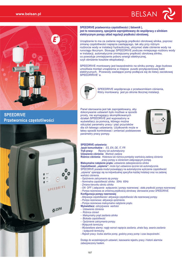www.belsan.pl SPEEDRIVE przetwornica częstotliwości ( falownik ), jest to nowoczesny, specjalnie zaprojektowany do współpracy z silnikiem elektrycznym pompy układ regulacji prędkości obrotowej. Urządzenie to ma za zadanie regulację prędkości obrotowej silnika, poprzez zmianę częstotliwości napięcia zasilającego, tak aby przy różnym rozbiorze wody w instalacji hydraulicznej, utrzymać stałe ciśnienie wody na rurociągu tłocznym. Stosując SPEEDRIVE podczas mniejszego rozbioru wody w instalacji, automatycznie zmniejszamy prędkość obrotową silnika, co powoduje zmniejszenie poboru energii elektrycznej, czyli obniżenie kosztów eksploatacji . SPEEDRIVE montowany jest bezpośrednio na silniku pompy. Jego budowa umożliwia montaż urządzenia w miejsce puszki przyłączeniowej kabli elektrycznych. Przewody zasilające pomp podłącza się do listwy zaciskowej SPEEDRRIVE' a. SPEEDRIVE współpracuje z przetwornikiem ciśnienia, Który montowany jest po stronie tłocznej instalacji. SPEEDRIVE Przetwornica częstotliwości Panel sterowania jest tak zaprojektowany, aby dokonywanie ustawień było możliwe w sposób prosty, nie wymagający skomplikowanych działań.SPEEDRIVE jest wyposażony w wyświetlacz za pomocą, którego można odczytać parametry pracy i pięć przycisków dla ich łatwego ustawiania. Użytkownik może w łatwy sposób kontrolować i zmieniać podstawowe parametry pracy pompy. SPEEDRIVE ustawienia: Język komunikatów : ES, EN, DE, IT, FR Ręczny lub automatyczny Tryb pracy: Ustawienie ciśnienia: Wartość zadana Różnice ciśnienia: Histereza lub różnica pomiędzy wartością zadaną ciśnienia pracy pompy a ciśnieniem załączającym pompę. Maksymalne natężenie prądu: ustawienie zabezpieczenia silnika Częstotliwość „uśpienia”: może być ustawiona ręcznie lub automatycznie. SPEEDRIVE posiada moduł pozwalający na automatyczne wyliczenie częstotliwość „uśpienia” opierając się na indywidualnej specyfice każdej Instalacji oraz na zadanej wartości ciśnienia. - Opóźnienie zatrzymania się pompy - Nominalna częstotliwość silnika: 50Hz 60Hz - Zmiana kierunku obrotu silnika - ON OFF ( załączenie wyłączenie ) pompy rezerwowej : stała prędkość pompa rezerwowej - Pompa rezerwowa ze zmienną prędkością obrotową: sterowanie przez SPEEDRIVE. Konfiguracja pompy rezerwowej - Aktywacja częstotliwości: aktywacja częstotliwości dla rezerwowej pompy. - Pompa rezerwowa: aktywacja opóźnienia. - Pompa rezerwowa maksymalne natężenie prądu. Wyświetlacz: odczytywane wartości - Ustawienie ciśnienia - Różnica ciśnień - Maksymalny prąd zasilania silnika - Blokada częstotliwość - Opóźnienie zatrzymania pompy. - Wyłącznik termiczny - Wyświetlane alarmy: nagły wzrost napięcia zasilania, utrata fazy, awaria zasilania i wyłącznik termiczny. - Rejestr pracy: liczba startów pomp, godziny pracy pomp i czas bezpośredni. Dostęp do wcześniejszych ustawień, kasowanie rejestru pracy i historii alarmów zabezpieczony hasłem. 187 www.belsan.pl Sposób montażu przetwornika ciśnienia Układ elektroniczny dla zasilania trój-fazowego SPEEDRIVE T1 Na instalacji po stronie tłocznej pompy Układ elektroniczny dla zasilania jedno-fazowego SPEEDRIVE M1 Wymiary i ciężar Dimensions and weights Model A B C D Kg Speedrive M1 128 71 207 207 2 Speedrive M2 128 71 207 207 2,2 Speedrive T1 142 85 207 207 2,2 Speedrive T2 142 85 207 207 2,4 Speedrive T3 142 85 207 207 2,5 Parametry techniczne Opis Przetwornicy czstotliwoci Konfiguracja Zasilanie Napiciezasilaniasilnika Maksymalnenatenieprdu Ch odzenie Sta ecinienie Sta yprzep yw Zmianazadanegopunktupracy Zabezpieczenieprzedpracnasucho Przetwornikcinienia Dodatkowewejciecyfrowe Dodatkowewejcieanalogowe Zewntrznyportkomunikacyjny Wywietlacz Przekanikpomocniczy Minimalnaczstotliwopracy Przyspieszenie Spowolnienie Tymczasowezatrzymanie Maksymalnailopomp Maksymalnailopomppodrzdnych W ukadzie jednofazowym M1 - M2 Wbudowanywskrzynkprzyczeniow 230V,jednofazowe 230V,trójfazowe 57A Wentylacjapowietrzna Jest Programowalny Programowalny Jest Zewntrzny420mA 1 1 RS485 Jest 1dlaalarmuzewntrznego Regulowana Stae Stae Jest do4 do3 W ukadzie trójfazowy T1 - T2 - T3 Wbudowanywskrzynkprzyczeniow 400V,trójfazowe 400V,trójfazowe 4 6 9A Wentylacjapowietrzna Jest Programowalny Programowalny Jest Zewntrzny420mA 1 1 RS485 Jest Brak Regulowana Stae Stae Jest do4 do3 BELSAN Sp. z o.o. 04-461 Warszawa ul. Stężycka 9 e-mail: [email protected] tel./fax: (022) 673 52 17(18) Regionalne Biura Techniczno-Handlowe: 43-384 Jaworze Dolne k/ Bielska Białej ul. Niecała 1 e-mail: [email protected] tel./fax: (033) 817 39 22 188 64-100 Leszno ul. Śniadeckich 21a e-mail: [email protected] tel./fax: (065) 520 50 26 21-500 Biała Podlaska ul. Sidorska 55 e-mail: [email protected] tel./fax: 083 343 72 52