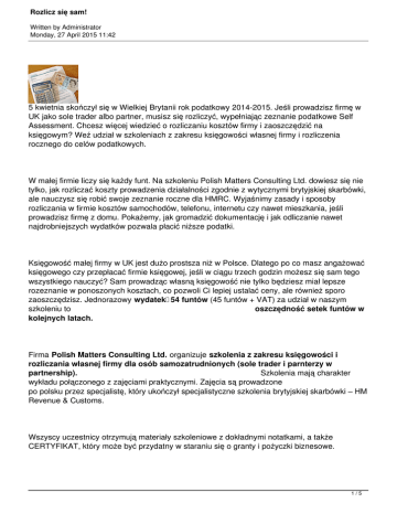 Rozlicz się sam! Written by Administrator Monday, 27 April 2015 11:42 5 kwietnia skończył się w Wielkiej Brytanii rok podatkowy 2014-2015. Jeśli prowadzisz firmę w UK jako sole trader albo partner, musisz się rozliczyć, wypełniając zeznanie podatkowe Self Assessment. Chcesz więcej wiedzieć o rozliczaniu kosztów firmy i zaoszczędzić na księgowym? Weź udział w szkoleniach z zakresu księgowości własnej firmy i rozliczenia rocznego do celów podatkowych. W małej firmie liczy się każdy funt. Na szkoleniu Polish Matters Consulting Ltd. dowiesz się nie tylko, jak rozliczać koszty prowadzenia działalności zgodnie z wytycznymi brytyjskiej skarbówki, ale nauczysz się robić swoje zeznanie roczne dla HMRC. Wyjaśnimy zasady i sposoby rozliczania w firmie kosztów samochodów, telefonu, internetu czy nawet mieszkania, jeśli prowadzisz firmę z domu. Pokażemy, jak gromadzić dokumentację i jak odliczanie nawet najdrobniejszych wydatków pozwala płacić niższe podatki. Księgowość małej firmy w UK jest dużo prostsza niż w Polsce. Dlatego po co masz angażować księgowego czy przepłacać firmie księgowej, jeśli w ciągu trzech godzin możesz się sam tego wszystkiego nauczyć? Sam prowadząc własną księgowość nie tylko będziesz miał lepsze rozeznanie w ponoszonych kosztach, co pozwoli Ci lepiej ustalać ceny, ale również sporo zaoszczędzisz. Jednorazowy wydatek 54 funtów (45 funtów + VAT) za udział w naszym szkoleniu to oszczędność setek funtów w kolejnych latach. Firma Polish Matters Consulting Ltd. organizuje szkolenia z zakresu księgowości i rozliczania własnej firmy dla osób samozatrudnionych (sole trader i parnterzy w partnership). Szkolenia mają charakter wykładu połączonego z zajęciami praktycznymi. Zajęcia są prowadzone po polsku przez specjalistę, który ukończył specjalistyczne szkolenia brytyjskiej skarbówki – HM Revenue & Customs. Wszyscy uczestnicy otrzymują materiały szkoleniowe z dokładnymi notatkami, a także CERTYFIKAT, który może być przydatny w staraniu się o granty i pożyczki biznesowe. 1/5 Rozlicz się sam! Written by Administrator Monday, 27 April 2015 11:42 Zdjęcia z kursów można obejrzeć na stonie facebookowej firmy: http://facebook.com/PolishMat tersConsultingLtd SZCZEGÓŁOWY PROGRAM TO: 1.Jak dokumentować własne przychody: a) wystawianie rachunków, w tym wystawianie rachunków klientom zagranicznym, np. do Polski; b) wystawianie paragonów; c) inne sposoby. 2.Jak dokumentować własne wydatki - zakupy i koszty (w tym: jak rozliczać rachunki zagraniczne, np. z Polski). 3.Środki trwałe - co to jest i jak prowadzić ich dokumentację. 4.Jakie koszty prowadzenia działalności – co można odliczyć, a co nie? 5.Rozliczanie samochodu w firmie. 6.Rozliczanie kosztów prywatnych telefonów, komórek i Internetu, wykorzystywanych do prowadzenia działalności gospodarczej. 2/5 Rozlicz się sam! Written by Administrator Monday, 27 April 2015 11:42 7.Rozliczanie kosztów mieszkania w przypadku pracy z domu. 8.Podatki i składki National Insurance samozatrudnionego w roku podatkowym 2014/2015 i 2015/2016 9.Terminy rozliczeń i opłacania podatków i składek. 10.Roczne zeznanie podatkowe w formie papierowej. 11.Rejestracja do zeznania podatkowego online. 12.Roczne zeznanie podatkowe online. 13.Wpłata należności/ zwrot nadpłaty. 14.Gdzie szukać informacji i pomocy? Szkolenia będą odbywały się w weekendy: - w soboty, w godzinach od 12.00 do 15.15 w niedziele, w godzinach od 10.00 do 13.15 Oto terminy szkoleń w maju, czerwcu i lipcu 2015 roku: 3/5 Rozlicz się sam! Written by Administrator Monday, 27 April 2015 11:42 - 9 maja (sobota), Sheffield - 10 maja (niedziela), Londyn - 23 maja (sobota), Newcastle-Gateshead - 31 maja (niedziela), Birmingham - 6 czerwca (sobota), Leeds - 7 czerwca (niedziela), Luton - 20 czerwca (sobota), Manchester - ZOSTAŁO OSTATNIE WOLNE MIEJSCE (informacja z piątku 19 czerwca, z godz. 16.38). - 21 czerca (niedziela), Bristol - NIE MA WOLNYCH MIEJSC - 27 czerwca (sobota), Peterborough - 28 czerwca (niedziela), Londyn Watford - 5 lipca (niedziela), Liverpool Zainteresowanych prosimy o zgłoszenia z podaniem: ü imienia i nazwiska uczestnika ü miasta ü numeru telefonu kontaktowego (komórkowego) ü adresu e-mailowego Zgłoszenia przyjmowane są: - telefonicznie pod numerem stacjonarnym 01670 33 65 44 od poniedziałku do piątku godzinach od 9.00 do 17.00 - SMS-em wysłanym na numer 077 235 445 62 4/5 Rozlicz się sam! Written by Administrator Monday, 27 April 2015 11:42 - e-mailowo – [email protected] - za pomocą formularza kontaktowego - KLIKNIJ TUTAJ>> Serdecznie zapraszamy! 5/5
