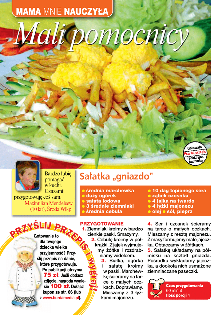 MAMA MNIE NAUCZYŁA Mali pomocnicy Gotowała pis Przyślij prze redakcyjna kucharka Bardzo lubię pomagać w kuchi. Czasami przygotowuję coś sam. Maximilian Mendeleew (10 lat), Środa Wlkp. Sałatka „gniazdo” ● ● ● ● ● średnia marchewka duży ogórek sałata lodowa 3 średnie ziemniaki średnia cebula PRZYGOTOWANIE 1. Ziemniaki kroimy w bardzo cienkie paski. Smażymy. Gotowanie to 2. Cebulę kroimy w półdla twojego krążki. Z jajek wyjmujedziecka wielka my żółtka i rozdrabprzyjemność? Przyniamy widelcem. ślij przepis na danie, 3. Białka, ogórka które przygotowuje. i sałatę kroimy Po publikacji otrzyma w paski. Marchew75 zł. Jeśli dodasz kę ścieramy na tarzdjęcie, nagroda wyniece o małych oczsie 100 zł. Dołącz kach. Doprawiamy. kupon ze str. 66 (lub Mieszamy z 3 łyżz www.burdamedia.pl). kami majonezu. ● ● ● ● ● 10 dag topionego sera ząbek czosnku 4 jajka na twardo 4 łyżki majonezu olej ● sól, pieprz 4. Ser i czosnek ścieramy na tarce o małych oczkach. Mieszamy z resztą majonezu. Z masy formujemy małe jajeczka. Obtaczamy w żółtkach. 5. Sałatkę układamy na półmisku na kształt gniazda. Pośrodku wykładamy jajeczka, a dookoła nich usmażone ziemniaczane paseczki. Czas przygotowania 60 minut Ilość porcji 4