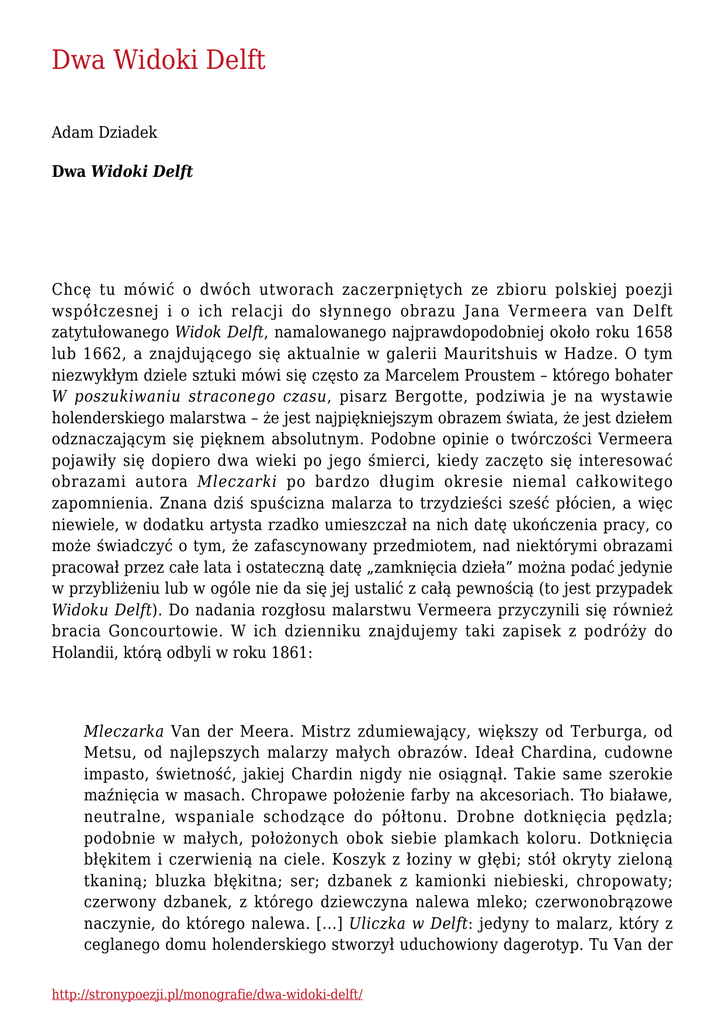 Dwa Widoki Delft Adam Dziadek Dwa Widoki Delft Chcę tu mówić o dwóch utworach zaczerpniętych ze zbioru polskiej poezji współczesnej i o ich relacji do słynnego obrazu Jana Vermeera van Delft zatytułowanego Widok Delft, namalowanego najprawdopodobniej około roku 1658 lub 1662, a znajdującego się aktualnie w galerii Mauritshuis w Hadze. O tym niezwykłym dziele sztuki mówi się często za Marcelem Proustem – którego bohater W poszukiwaniu straconego czasu, pisarz Bergotte, podziwia je na wystawie holenderskiego malarstwa – że jest najpiękniejszym obrazem świata, że jest dziełem odznaczającym się pięknem absolutnym. Podobne opinie o twórczości Vermeera pojawiły się dopiero dwa wieki po jego śmierci, kiedy zaczęto się interesować obrazami autora Mleczarki po bardzo długim okresie niemal całkowitego zapomnienia. Znana dziś spuścizna malarza to trzydzieści sześć płócien, a więc niewiele, w dodatku artysta rzadko umieszczał na nich datę ukończenia pracy, co może świadczyć o tym, że zafascynowany przedmiotem, nad niektórymi obrazami pracował przez całe lata i ostateczną datę „zamknięcia dzieła” można podać jedynie w przybliżeniu lub w ogóle nie da się jej ustalić z całą pewnością (to jest przypadek Widoku Delft). Do nadania rozgłosu malarstwu Vermeera przyczynili się również bracia Goncourtowie. W ich dzienniku znajdujemy taki zapisek z podróży do Holandii, którą odbyli w roku 1861: Mleczarka Van der Meera. Mistrz zdumiewający, większy od Terburga, od Metsu, od najlepszych malarzy małych obrazów. Ideał Chardina, cudowne impasto, świetność, jakiej Chardin nigdy nie osiągnął. Takie same szerokie maźnięcia w masach. Chropawe położenie farby na akcesoriach. Tło białawe, neutralne, wspaniale schodzące do półtonu. Drobne dotknięcia pędzla; podobnie w małych, położonych obok siebie plamkach koloru. Dotknięcia błękitem i czerwienią na ciele. Koszyk z łoziny w głębi; stół okryty zieloną tkaniną; bluzka błękitna; ser; dzbanek z kamionki niebieski, chropowaty; czerwony dzbanek, z którego dziewczyna nalewa mleko; czerwonobrązowe naczynie, do którego nalewa. [...] Uliczka w Delft: jedyny to malarz, który z ceglanego domu holenderskiego stworzył uduchowiony dagerotyp. Tu Van der http://stronypoezji.pl/monografie/dwa-widoki-delft/ Meer ukazuje się jako mistrz Decampsa – mistrz i ojciec, którego Decamps na pewno nie znał.1 Przedstawiony w tym fragmencie opis nie odnosi się, co prawda do obrazu, który będzie nas tu szczególnie interesował, ale warto było go przytoczyć, aby uświadomić sobie z jak wielkim entuzjazmem przyjęli dzieła Vermeera Goncourtowie, a po nich także i inni. Ernst H. Gombrich mówił, że widz patrzący na Widok Delft doznaje specyficznego estetycznego wstrząsu: Nikt nie musi mi mówić, dlaczego nazywamy ten obraz wybitnym dziełem, bo sam widzę, że wyróżnia się spośród wielkiej ilości pejzaży urbanistycznych malowanych w siedemnastowiecznej Holandii. [...] Nie musimy znać nazwisk i dat życia innych mistrzów holenderskich, aby zachwycać się tajemniczym urokiem Widoku miasta Delft. Jest nam potrzebny zespół oczekiwań, który można zmienić i przekraczać, intuicyjne odróżnianie tego, co jest powszechnie stosowaną formą, od tego, co wyjątkowe – wyczuwanie, które nie musi być bardziej zwerbalizowane niż jakiekolwiek inne rozróżnienie zmysłowe, ale które uwrażliwia nas na subtelne harmonizowanie leżące u podłoża naszego uczucia przyjemności.2 Można w tym miejscu sięgnąć również do innych omówień tego obrazu dokonanych przez historyków sztuki. Michał Walicki tak pisał o pejzażu z płótna Vermeera: Miasto widziane zza rzeki, leży skąpane w gorących promieniach zachodzącego słońca: pomarańczowy reflektor zda się powoli przesuwać po starych murach, zatrzymuje się dłużej po prawej stronie bramy wjazdowej. Wilgoci wody, starych murów i ekranu nieba odpowiadają refleksy świetlne – zawoalowane biegiem chmur, kierunkowe i ostre na wodnej tafli, pełzające i zapalające się gwałtownie na zabudowaniach: rzadkie, o wyjątkowej intuicji przedstawienie problemu atmosferyczności, syntetyczne a przecież zróżnicowane, w zależności od żywiołów powietrza i wody.3 Dodajmy do tych kilku cytatów jeszcze i ten, bardzo interesujący, zaczerpnięty z książki Ksawerego Piwockiego: http://stronypoezji.pl/monografie/dwa-widoki-delft/ Jest to zdumiewająca synteza szczegółowego oglądu przedmiotów, w ich jednostkowej wartości, z syntetycznym widzeniem całości, a osiągnięta dzięki studium światła: w jego kryształowym blasku, jak w szklanej kuli akwarium zanurzają się domy i wieże, mury i chmury, łodzie i ludzie. Rozgrywka między zimnem (względnym) wody i powietrza a czerwienią ceglanych murów łagodzona jest przez atmosferyczną perłowość powietrznej przestrzeni. Drobne sylwetki ludzi na pierwszym planie nie krzątają się: zamarłe w bezruchu zdają się kontemplować odwieczne piękno swej ojczyzny. Melancholijny spokój jest istotnym tematem pejzażu, zachodzi oto słońce i jego cudowne blaski pochłonie mrok nocy.4 Takich fragmentów można by przytoczyć znacznie więcej, czy nawet ułożyć z nich całą antologię i każdy z nich byłby fascynujący, napisany niezwykłym, „obrazowym” językiem. Te cytaty pochodzą z prac historyków oraz krytyków sztuki i stanowią szczególny przypadek opisu dzieła sztuki, który dokonywany jest według określonych metodologicznie norm i zgodnie z określonym systemem wartości. Wisława Szymborska pisała przed laty: „Opisywać Vermeera słowami to trud marny. Dużo lepszym środkiem wyrazu byłaby tu muzyka na kwartet z dwojgiem skrzypiec, fagotem i harfą”.5 Zobaczmy zatem, jak radzą sobie z tym zadaniem poeci. Z opisem – przynajmniej częściowym – tego samego obrazu mamy do czynienia w przypadku dwu niezwykłych wierszy