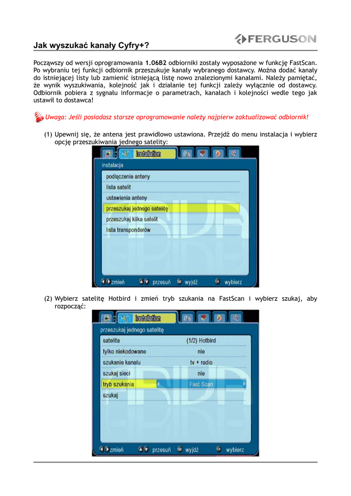 Jak wyszukać kanały Cyfry+? Począwszy od wersji oprogramowania 1.06B2 odbiorniki zostały wyposażone w funkcję FastScan. Po wybraniu tej funkcji odbiornik przeszukuje kanały wybranego dostawcy. Można dodać kanały do istniejącej listy lub zamienić istniejącą listę nowo znalezionymi kanałami. Należy pamiętać, że wynik wyszukiwania, kolejność jak i działanie tej funkcji zależy wyłącznie od dostawcy. Odbiornik pobiera z sygnału informacje o parametrach, kanałach i kolejności wedle tego jak ustawił to dostawca! Uwaga: Jeśli posiadasz starsze oprogramowanie należy najpierw zaktualizować odbiornik! (1) Upewnij się, że antena jest prawidłowo ustawiona. Przejdź do menu instalacja i wybierz opcję przeszukiwania jednego satelity: (2) Wybierz satelitę Hotbird i zmień tryb szukania na FastScan i wybierz szukaj, aby rozpocząć: Jak wyszukać kanały Cyfry+? (3) Wybierz pakiet kanałów swojego dostawcy: Cyfra+ SD. Dalej wybierz czy odbiornik ma dodać nowo znaleziona kanały do listy (dodaj) czy zamienić aktualną listę nowymi kanałami (zamień) i wybierz szukaj, aby rozpocząć przeszukiwanie: (4) Poczekaj, aż odbiornik zakończy przeszukiwanie kanałów dostawcy: (5) Zatwierdź OK, następnie wyjdź z menu. Lista kanałów została ustawiona zgodnie z danymi dostawcy sygnału. Jak wyszukać kanały Cyfry+? (6) Pamiętaj, że wynik wyszukiwania zależy wyłącznie od dostawcy. Odbiornik pobiera z sygnału informacje na podstawie, których wyszukuje kanały i układa listę tak jak ustawił to dostawca! UWAGA: Funkcja FastScan dla Cyfry+ nie wyszukuje kanałów HD. Kanały HD należy doszukać ręcznie przeszukując za pomocą listy transponderów odpowiednie częstotliwości: 11258.00 H Eurosport 2 HD NatGeo Wild HD Animal Planet HD Cinemax HD Eastern Europe 12265.00 V Fox Life HD Poland HBO HD Polska 11278.36 V 10834.00 V BBC HD Canal+ Film HD Polska Canal+ Sport HD Polska National Geographic Polska Filmbox HD Eurosport HD Proszę pamiętać, że podane częstotliwości dotyczą stanu z dnia 21 maja 2010 i mogą ulec zmianie w zależności od zmian wprowadzanych przez Cyfrę+. Aktualne informacje skąd nadawany jest dany kanał dostępne są na stronie internetowej Cyfry+.