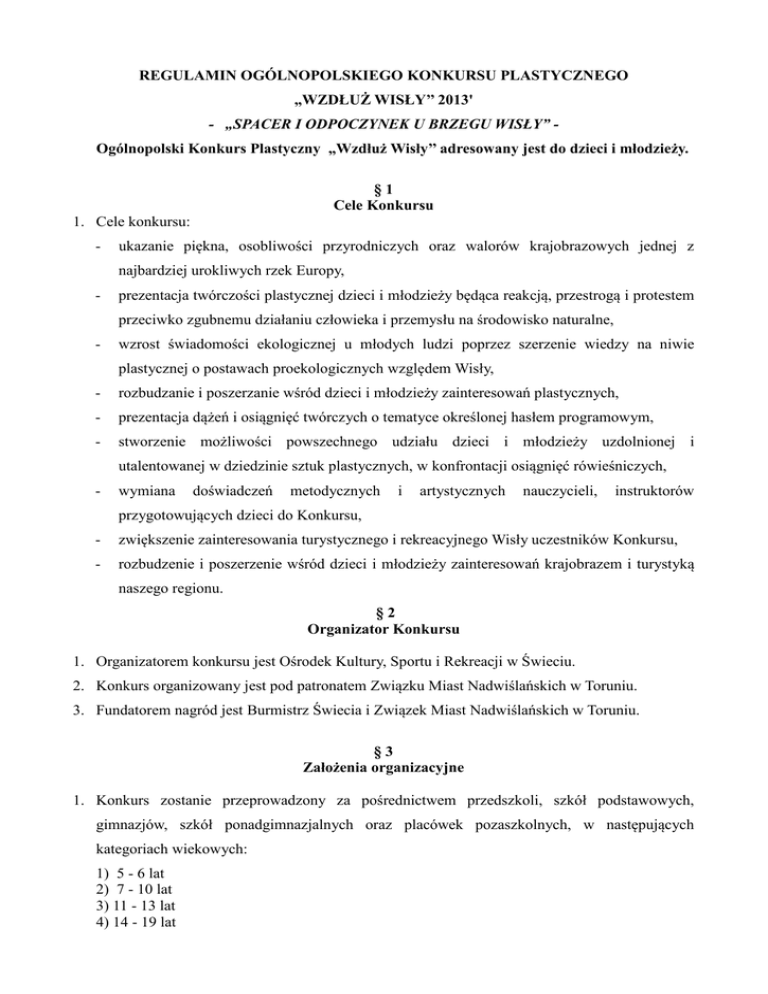 REGULAMIN OGÓLNOPOLSKIEGO KONKURSU PLASTYCZNEGO „WZDŁUŻ WISŁY’’ 2013' - „SPACER I ODPOCZYNEK U BRZEGU WISŁY” Ogólnopolski Konkurs Plastyczny „Wzdłuż Wisły’’ adresowany jest do dzieci i młodzieży. §1 Cele Konkursu 1. Cele konkursu: - ukazanie piękna, osobliwości przyrodniczych oraz walorów krajobrazowych jednej z najbardziej urokliwych rzek Europy, - prezentacja twórczości plastycznej dzieci i młodzieży będąca reakcją, przestrogą i protestem przeciwko zgubnemu działaniu człowieka i przemysłu na środowisko naturalne, - wzrost świadomości ekologicznej u młodych ludzi poprzez szerzenie wiedzy na niwie plastycznej o postawach proekologicznych względem Wisły, - rozbudzanie i poszerzanie wśród dzieci i młodzieży zainteresowań plastycznych, - prezentacja dążeń i osiągnięć twórczych o tematyce określonej hasłem programowym, - stworzenie możliwości powszechnego udziału dzieci i młodzieży uzdolnionej i utalentowanej w dziedzinie sztuk plastycznych, w konfrontacji osiągnięć rówieśniczych, - wymiana doświadczeń metodycznych i artystycznych nauczycieli, instruktorów przygotowujących dzieci do Konkursu, - zwiększenie zainteresowania turystycznego i rekreacyjnego Wisły uczestników Konkursu, - rozbudzenie i poszerzenie wśród dzieci i młodzieży zainteresowań krajobrazem i turystyką naszego regionu. §2 Organizator Konkursu 1. Organizatorem konkursu jest Ośrodek Kultury, Sportu i Rekreacji w Świeciu. 2. Konkurs organizowany jest pod patronatem Związku Miast Nadwiślańskich w Toruniu. 3. Fundatorem nagród jest Burmistrz Świecia i Związek Miast Nadwiślańskich w Toruniu. §3 Założenia organizacyjne 1. Konkurs zostanie przeprowadzony za pośrednictwem przedszkoli, szkół podstawowych, gimnazjów, szkół ponadgimnazjalnych oraz placówek pozaszkolnych, w następujących kategoriach wiekowych: 1) 5 - 6 lat 2) 7 - 10 lat 3) 11 - 13 lat 4) 14 - 19 lat 2. Prace nadesłane na Konkurs muszą być pracami własnymi, nigdzie wcześniej niepublikowanymi. 3. Prace powinny być wykonane w następujących technikach plastycznych: pastele, farby plakatowe, tempera, pisaki, grafika, na papierze typu brystol, w formacie od A3 do A0. Temat prac powinien obejmować aspekt piękna, osobliwości przyrodniczych oraz walorów krajobrazowych Wisły. 4. Praca plastyczna winna być opisana na odwrocie wg powyższego wzoru: Imię, nazwisko Wiek (rok urodzenia ) Telefon kontaktowy, e-mail Nazwa Instytucji, adres Imię, nazwisko opiekuna 5. Udział w Konkursie jest jednoznaczny z nieodpłatnym udzieleniem praw autorskich, na wykorzystanie prac w celach promocyjnych Konkursu. 6. Osoby nadsyłające prace konkursowe wyrażają zgodę na przetwarzanie przez Organizatora Konkursu swoich danych osobowych (Ustawa o ochronie danych Osobowych z dnia 29 sierpnia 1997 roku, Dz. U. Nr 133, poz. 833, z późn. zm). 7. Prace zgłoszone do Konkursu nie będą zwracane autorom. 8. Prace nie spełniające zasad uczestnictwa, nie będą podlegały ocenie konkursowej. §4 Ocena prac konkursowych 1. Prace należy składać do 12 listopada 2013 r., na adres: Ośrodek Kultury, Sportu i Rekreacji ul. Wojska Polskiego 139 86-100 Świecie z dopiskiem: „WZDŁUŻ WISŁY” Szczegółowych informacji dotyczących Konkursu udziela instruktor ds. plastycznych OKSiR Hanna Kawecka, tel. 795 117 260. 2. O wyłonieniu laureatów Konkursu decyduje jury powołane przez Organizatora. 3. Jury pod uwagę weźmie: • umiejętność doboru tematu pracy, • jakość wykonania, • oryginalność. 4. Decyzje Komisji Konkursowej są ostateczne. §5 Ogłoszenie wyników Konkursu 1. Lista laureatów zostanie opublikowana na stronie Internetowej OKSiR w Świeciu, www.oksir.eu. 2. Osoby wyróżnione zostaną powiadomione telefonicznie, mailowo do końca listopada 2013 r. 3. Prace laureatów będą prezentowane na wystawie pokonkursowej w Świeciu. §6 Nagrody 1. Organizator przyzna nagrodę główną GRAND PRIX. 2. Przyznane zostaną nagrody rzeczowe w poszczególnych kategoriach wiekowych. 3. Przewidziana jest również nagroda specjalna dla opiekuna, za największą ilość wyróżnionych prac wśród podopiecznych. §7 Terminarz 1. Nadsyłanie prac do 12 listopada 2013 r. 2. Termin prezentacji pokonkursowej wystawy listopad - grudzień 2013. 3. Nagrodzona praca (GRAND-PRIX) będzie wykorzystana do celów promocyjnych miast nadwiślańskich. 4. Nadesłanie prac jest jednoznaczne z akceptacją niniejszego regulaminu.