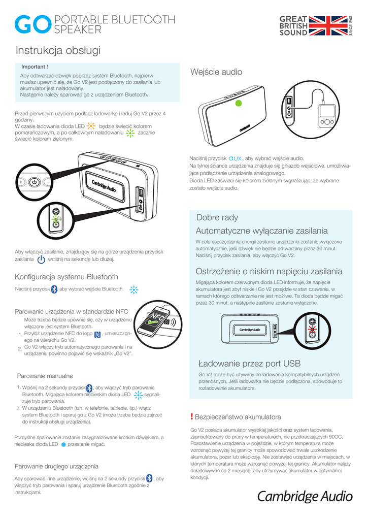 GO PORTABLE BLUETOOTH SPEAKER Instrukcja obsługi Important ! Aby odtwarzać dźwięk poprzez system Bluetooth, najpierw musisz upewnić się, że Go V2 jest podłączony do zasilania lub akumulator jest naładowany. Następnie należy sparować go z urządzeniem Bluetooth. Wejście audio Przed pierwszym użyciem podłącz ładowarkę i ładuj Go V2 przez 4 godziny. W czasie ładowania dioda LED będzie świecić kolorem pomarańczowym, a po całkowitym naładowaniu zacznie świecić kolorem zielonym. Naciśnij przycisk , aby wybrać wejście audio. Na tylnej ściance urządzenia znajduje się gniazdo wejściowe, umożliwiające podłączanie urządzenia analogowego. Dioda LED zaświeci się kolorem zielonym sygnalizując, że wybrane zostało wejście audio. Dobre rady Automatyczne wyłączanie zasilania Aby włączyć zasilanie, znajdujący się na górze urządzenia przycisk zasilania wciśnij na sekundę lub dłużej. Ostrzeżenie o niskim napięciu zasilania Konfiguracja systemu Bluetooth Naciśnij przycisk Migająca kolorem czerwonym dioda LED informuje, że napięcie akumulatora jest zbyt niskie i Go V2 przejdzie w stan czuwania, w ramach którego odtwarzanie nie jest możliwe. Ta dioda będzie migać przez 30 minut, a następnie zasilanie zostanie wyłączone. , aby wybrać wejście Bluetooth. Parowanie urządzenia w standardzie NFC Może trzeba będzie upewnić się, czy w urządzeniu włączony jest system Bluetooth. , umieszczon1. Przyłóż urządzenie NFC do logo ego na wierzchu Go V2. 2. Go V2 włączy tryb automatycznego parowania i na urządzeniu powinno pojawić się wskaźnik „Go V2”. W celu oszczędzania energii zasilanie urządzenia zostanie wyłączone automatycznie, jeśli dźwięk nie będzie odtwarzany przez 30 minut. Naciśnij przycisk zasilania, aby włączyć Go V2. NFC Parowanie manualne 1. Wciśnij na 2 sekundy przycisk , aby włączyć tryb parowania Bluetooth. Migająca kolorem niebieskim dioda LED sygnalizuje tryb parowania. 2. W urządzeniu Bluetooth (tzn. w telefonie, tablecie, itp.) włącz system Bluetooth i sparuj go z Go V2 (może trzeba będzie zajrzeć do instrukcji obsługi urządzenia). Pomyślne sparowanie zostanie zasygnalizowane krótkim dźwiękiem, a niebieska dioda LED przestanie migać. Parowanie drugiego urządzenia Aby sparować inne urządzenie, wciśnij na 2 sekundy przycisk , aby włączyć tryb parowania i sparuj urządzenie Bluetooth zgodnie z instrukcjami. Ładowanie przez port USB Go V2 może być używany do ładowania kompatybilnych urządzeń przenośnych. Jeśli ładowarka nie będzie podłączona, spowoduje to rozładowanie akumulatora. ! Bezpieczeństwo akumulatora Go V2 posiada akumulator wysokiej jakości oraz system ładowania, zaprojektowany do pracy w temperaturach, nie przekraczających 50OC. Pozostawienie urządzenia w pojeździe, w którym temperatura może wzrosnąć powyżej tej granicy może spowodować trwałe uszkodzenie akumulatora, pożar lub eksplozję. Nie zostawiać urządzenia w miejscach, w których temperatura może wzrosnąć powyżej tej granicy. Akumulator należy doładowywać co 2 miesiące, aby utrzymywać akumulator w optymalnej kondycji.