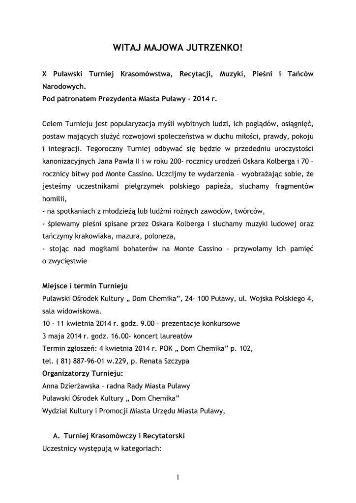 WITAJ MAJOWA JUTRZENKO! X Puławski Turniej Krasomówstwa, Recytacji, Muzyki, Pieśni i Tańców Narodowych. Pod patronatem Prezydenta Miasta Puławy – 2014 r. Celem Turnieju jest popularyzacja myśli wybitnych ludzi, ich poglądów, osiągnięć, postaw mających służyć rozwojowi społeczeństwa w duchu miłości, prawdy, pokoju i integracji. Tegoroczny Turniej odbywać się będzie w przededniu uroczystości kanonizacyjnych Jana Pawła II i w roku 200- rocznicy urodzeń Oskara Kolberga i 70 – rocznicy bitwy pod Monte Cassino. Uczcijmy te wydarzenia – wyobrażając sobie, że jesteśmy uczestnikami pielgrzymek polskiego papieża, słuchamy fragmentów homilii, - na spotkaniach z młodzieżą lub ludźmi rożnych zawodów, twórców, - śpiewamy pieśni spisane przez Oskara Kolberga i słuchamy muzyki ludowej oraz tańczymy krakowiaka, mazura, poloneza, - stojąc nad mogiłami bohaterów na Monte Cassino – przywołamy ich pamięć o zwycięstwie Miejsce i termin Turnieju Puławski Ośrodek Kultury „ Dom Chemika”, 24- 100 Puławy, ul. Wojska Polskiego 4, sala widowiskowa. 10 - 11 kwietnia 2014 r. godz. 9.00 – prezentacje konkursowe 3 maja 2014 r. godz. 16.00- koncert laureatów Termin zgłoszeń: 4 kwietnia 2014 r. POK „ Dom Chemika” p. 102, tel. ( 81) 887-96-01 w.229, p. Renata Szczypa Organizatorzy Turnieju: Anna Dzierżawska – radna Rady Miasta Puławy Puławski Ośrodek Kultury „ Dom Chemika” Wydział Kultury i Promocji Miasta Urzędu Miasta Puławy, A. Turniej Krasomówczy i Recytatorski Uczestnicy występują w kategoriach: 1 a) krasomówstwa- młodzież gimnazjalna, ponadgimnazjalna i dorośli - przedmiotem oceny będzie wygłoszenie przez siebie napisanego opowiadania bądź listu na temat wybrany przez siebie do Jana Pawła II, a może Go o coś poprosisz; - opowiadanie o zasługach Oskara Kolberga dla kultury, - opowieść o bohaterskich czynach polskich żołnierzy pod Monte Cassino b) recytacja – dzieci przedszkoli, szkół podstawowych, młodzieży szkolnej, dorosłych związanych z ww. tematyką lub 3 Maja- rocznicą Konstytucji 1791, najpiękniejsze strofy o Polsce. Do prezentacji uczestnicy wybierają: - dzieci przedszkolne – jeden utwór - dzieci szkolne, młodzież dorośli – dwa utwory np. wiersz + fragment prozy, dwa wiersze lub dwa fragmenty prozy ( dotyczące dwóch różnych postaci, problemów, wydarzeń). B. Przegląd Małych Form Teatralnych Montaż słowno – muzyczny ( nawiązujący do 3 Maja, Oskara Kolberga lub 70 rocznicy bitwy pod Monte Cassino) prezentacja do 25 minut. C. Turniej Pieśni Narodowych Uczestnicy będą oceniani w kategoriach: - soliści, - zespoły wokalne, - zespoły wokalno – instrumentalne, - zespoły rodzinne - chóry Uczestnicy wykonują dwie pieśni ( w tym zapisaną przez O. Kolberga ) lub związaną z Janem Pawłem II, 3 Maja D. Turniej Muzyki o charakterze patriotycznym związaną z 3 Maja, bitwa pod Monte Cassino lub muzyka ludowa – np. zapisana przez Oskara Kolberga. 2 - soliści - zespoły instrumentalne, - zespoły rodzinne Repertuar obejmuje 2 utwory muzyczne. Łączny czas nie może przekraczać 10 minut. E. Turniej Tańca Narodowego Ocenie będzie podlegać wykonanie jednego z wymienionych tańców: polonez, mazur, krakowiak, kujawiak a) w grupie przedszkolnej i szkół podstawowych może być taniec ludowy z przyśpiewką Każda z kategorii artystycznych będzie oceniana w grupie wiekowej: a) dzieci przedszkolne b) dzieci szkół podstawowych c) młodzież szkolna d) dorośli Jury będzie brać pod uwagę dobór repertuaru do możliwości wykonawczych uczestników, poprawności wykonania i ogólny wyraz artystyczny ( w tym odpowiedni ubiór – godny tego święta) Organizatorzy zapewniają reklamę imprezy, sprzęt nagłaśniający oraz jego obsługę podczas Turnieju, możliwość korzystania z fortepianu. Pozostałe instrumenty wykonawcy zapewniają sobie we własnym zakresie. - Uczestnicy spoza Puław przyjeżdżają na własny koszt - Uczestnicy otrzymują pamiątkowe dyplomy a laureaci nagrody - Informację o kolejności zgłoszeń występowania można uzyskać w POK „ Dom Chemika” w pok. 102 tel. ( 81) 887-96-01 w.229 3 Termin zgłoszeń – 4 kwietnia 2014 r. Pragniemy zaprosić do Turnieju wszystkich nauczycieli przygotowujących montaż słowno – muzyczny z okazji 3 Maja w szkołach, a także z okazji kanonizacji Jana Pawła II. Zaproście rodziców swoich uczniów, by mogli zobaczyć swoje dzieci na dużej scenie. Organizatorzy proszą o przeprowadzenie eliminacji środowiskowych w dziedzinie recytacji W karcie zgłoszeń – w recytacji: - wpisujemy nazwisko jednego instruktora - prosimy o zróżnicowany dobór utworów, by nie było, że z danej szkoły ten sam wiersz mówi kilku uczniów: - w zespołach muzycznych, wokalnych, tanecznych podajemy nazwisko instruktora i akompaniatora - wiek uczniów, jeśli jest zespół szkół- zaznaczyć gimnazjum, liceum czy szkołę podstawową - każdy recytator wpisany na oddzielnym zgłoszeniu jeśli są reprezentantami tej samej szkoły czy klasy. Organizatorzy proszą, by wszyscy uczestnicy, soliści i chórzyści umieli śpiewać „ Witaj majowa jutrzenko”. 4