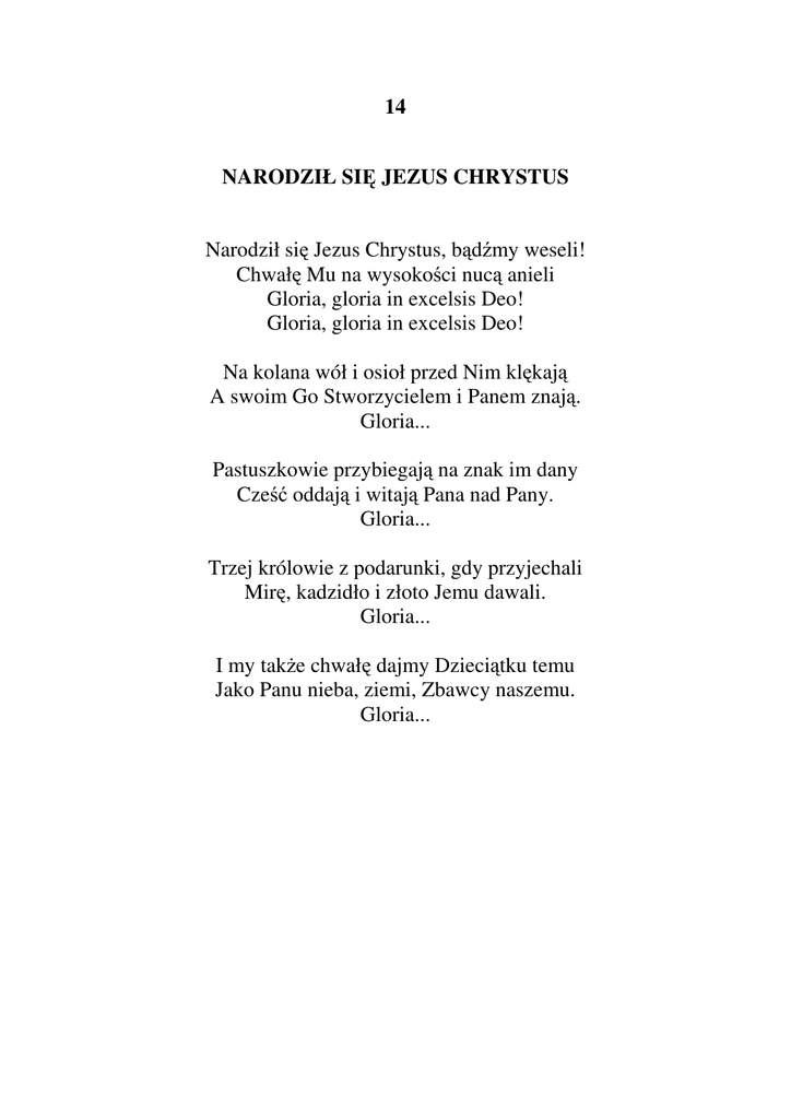 14 NARODZIŁ SIĘ JEZUS CHRYSTUS Narodził się Jezus Chrystus, bądźmy weseli! Chwałę Mu na wysokości nucą anieli Gloria, gloria in excelsis Deo! Gloria, gloria in excelsis Deo! Na kolana wół i osioł przed Nim klękają A swoim Go Stworzycielem i Panem znają. Gloria... Pastuszkowie przybiegają na znak im dany Cześć oddają i witają Pana nad Pany. Gloria... Trzej królowie z podarunki, gdy przyjechali Mirę, kadzidło i złoto Jemu dawali. Gloria... I my także chwałę dajmy Dzieciątku temu Jako Panu nieba, ziemi, Zbawcy naszemu. Gloria...