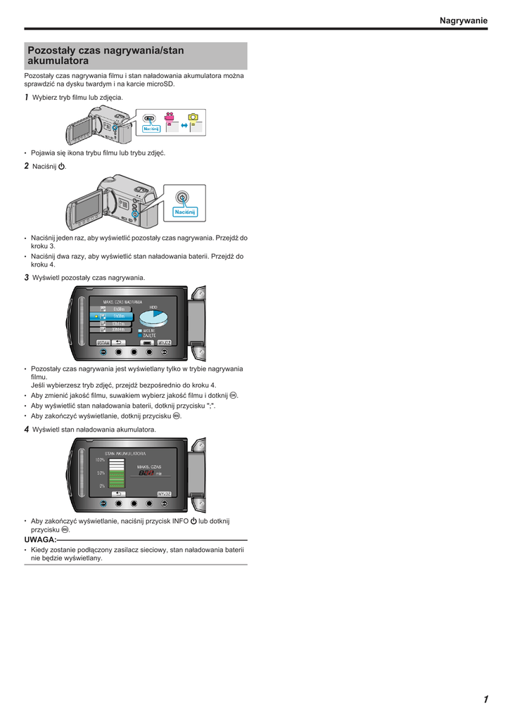 Nagrywanie Pozostały czas nagrywania/stan akumulatora Pozostały czas nagrywania filmu i stan naładowania akumulatora można sprawdzić na dysku twardym i na karcie microSD. Wybierz tryb filmu lub zdjęcia. . 1 ● Naciśnij M. . 2 Pojawia się ikona trybu filmu lub trybu zdjęć. ● ● Wyświetl pozostały czas nagrywania. . 3 Naciśnij jeden raz, aby wyświetlić pozostały czas nagrywania. Przejdź do kroku 3. Naciśnij dwa razy, aby wyświetlić stan naładowania baterii. Przejdź do kroku 4. ● ● ● ● Aby zmienić jakość filmu, suwakiem wybierz jakość filmu i dotknij C. Aby wyświetlić stan naładowania baterii, dotknij przycisku ";". Aby zakończyć wyświetlanie, dotknij przycisku D. Wyświetl stan naładowania akumulatora. . 4 Pozostały czas nagrywania jest wyświetlany tylko w trybie nagrywania filmu. Jeśli wybierzesz tryb zdjęć, przejdź bezpośrednio do kroku 4. ● Aby zakończyć wyświetlanie, naciśnij przycisk INFO M lub dotknij przycisku D. UWAGA: ● Kiedy zostanie podłączony zasilacz sieciowy, stan naładowania baterii nie będzie wyświetlany. 1 Nagrywanie Przybliżony czas nagrywania filmu Jakość HDD GZ-HD620 120 GB HDD GZ-HD510/GZ-HD500 80 GB Karta microSDHC 4 GB Karta microSDHC 8 GB UXP 11 godz. 7 godz. 20 m 22 m 44 m XP 15 godz. 10 godz. 31 m 1 godz. 3 m SP 21 godz. 14 godz. 44 m 1 godz. 29 m EP 50 godz. 33 godz. 1 godz. 51 m 3 godz. 43 m Rzeczywisty czas nagrywania może ulec skróceniu w zależności od warunków zapisu. ● Przybliżona liczba zdjęć (jednostka: liczba ujęć) Rozmiar obrazu Jakość Karta microSD 256 MB Karta microSD 512 MB Karta microSD 1 GB Karta microSD 2 GB Karta microSDHC 4 GB Karta microSDHC 8 GB 1920x1080 (16:9) WYSOKA 260 510 1030 2100 4 200 8 420 1920x1080 (16:9) STANDARD 410 810 1620 3210 6 410 9999 1440x1080 (4:3) WYSOKA 350 680 1360 2770 5 540 9999 1440x1080 (4:3) STANDARD 550 1070 2 150 4360 8 700 9999 640x480 (4:3) WYSOKA 1 710 3330 6 680 9999 9999 9999 640x480 (4:3) STANDARD 3 090 5990 9999 9999 9999 9999 HDD może zarejestrować do 9 999 zdjęć w dowolnym trybie. ● Przybliżony czas nagrywania (z użyciem akumulatora) Bateria Czas ładowania Rzeczywisty czas nagrywania Czas nagrywania ciągłego BN-VG114E 2 godz. 30 m 45 m 1 godz. 20 m BN-VG121E 3 godz. 30 m 1 godz. 10 m 2 godz. 05 m ● ● ● 2 Powyższe wartości są aktualne, gdy „ŚWIATŁO” jest ustawiona na „WYŁ.”, a „PODŚWIETL. MONITORA” na „STANDARD”. Rzeczywisty czas nagrywania może być krótszy, jeśli używana jest funkcja zoom lub jeśli nagrywanie jest wielokrotnie przerywane. (Zaleca się przygotowanie baterii o pojemności trzykrotnie przekraczającej spodziewany czas nagrywania.) W miarę zbliżania się końca żywotności baterii, czas nagrywania staje się krótszy, pomimo pełnego naładowania baterii. (Wymień baterię na nową.)