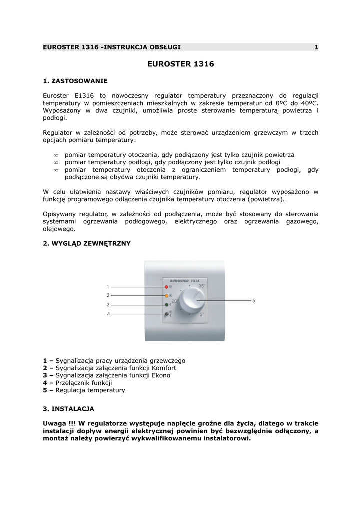 EUROSTER 1316 -INSTRUKCJA OBSŁUGI 1 EUROSTER 1316 1. ZASTOSOWANIE Euroster E1316 to nowoczesny regulator temperatury przeznaczony do regulacji temperatury w pomieszczeniach mieszkalnych w zakresie temperatur od 0ºC do 40ºC. Wyposażony w dwa czujniki, umożliwia proste sterowanie temperaturą powietrza i podłogi. Regulator w zależności od potrzeby, może sterować urządzeniem grzewczym w trzech opcjach pomiaru temperatury: • • • pomiar temperatury otoczenia, gdy podłączony jest tylko czujnik powietrza pomiar temperatury podłogi, gdy podłączony jest tylko czujnik podłogi pomiar temperatury otoczenia z ograniczeniem temperatury podłogi, podłączone są obydwa czujniki temperatury. gdy W celu ułatwienia nastawy właściwych czujników pomiaru, regulator wyposażono w funkcję programowego odłączenia czujnika temperatury otoczenia (powietrza). Opisywany regulator, w zależności od podłączenia, może być stosowany do sterowania systemami ogrzewania podłogowego, elektrycznego oraz ogrzewania gazowego, olejowego. 2. WYGLĄD ZEWNĘTRZNY 1 2 3 4 5 – – – – – Sygnalizacja pracy urządzenia grzewczego Sygnalizacja załączenia funkcji Komfort Sygnalizacja załączenia funkcji Ekono Przełącznik funkcji Regulacja temperatury 3. INSTALACJA Uwaga !!! W regulatorze występuje napięcie groźne dla życia, dlatego w trakcie instalacji dopływ energii elektrycznej powinien być bezwzględnie odłączony, a montaż należy powierzyć wykwalifikowanemu instalatorowi. EUROSTER 1316 -INSTRUKCJA OBSŁUGI 2 Regulator powinien być zamontowany w puszce elektroinstalacyjnej (dołączona w komplecie) na wewnętrznej ścianie często używanego pomieszczenia, około 1,5m powyżej poziomu podłogi. 4. SPOSÓB PODŁĄCZENIA W zależności od typu urządzenia sterowanego, regulator umożliwia podłączenie na dwa sposoby: a) Podłączenie źródła ciepła zasilanego napięciem 230V AC Regulator seryjnie wyposażony jest w zworkę łączącą punkty L1 kostki Z1 z punktem COM kostki Z2 powodując występowanie na złączu NO kostki Z2 napięcia 230V AC. Przewody urządzenia odbiorczego należy podłączyć do: • złącza NO kostki Z2 przewód fazowy • złącza N2 kostki Z3 przewód neutralny. b) Podłączenie urządzenia odbiorczego-wyjście bezpotencjałowe Aby podłączyć urządzenie odbiorcze wykorzystujące styki bezpotencjałowe należy zdemontować zworkę łączącą punkty COM kostki Z2 i L1 kostki Z1. Po demontażu zworki przekaźnik posiada wyjście zwierne bez napięcia. Przewody urządzenia odbiorczego należy podłączyć do: • punktów COM i NO kostki Z2 EUROSTER 1316 -INSTRUKCJA OBSŁUGI 3 c) Podłączenie zasilania do regulatora Euroster 1316 Regulator jest zasilany napięciem 230V AC. Przewody sieci należy podłączyć do: • złącze L2 kostki Z1 – przewód zasilający fazowy • złącze N1 kostki Z3 – przewód zasilający neutralny. 5. WYBÓR CZUJNIKA POMIARU TEMPERATURY Dwa czujniki temperatury. 1. Podłączyć czujnik podłogi. 2. Załączyć zasilanie - dwa czujniki temperatury są aktywne. Czujnik temperatury podłogi. Regulator posiada możliwość programowego odłączenia oraz ponownego załączenia czujnika otoczenia, (gdy chcemy wykorzystać tylko czujnik podłogowy). 1. Podłączyć czujnik podłogi do kostki Z5. 2. Przytrzymać przez ok. 5 sekund przełącznik funkcji - zaświecenie diod LED (Komfort i Ekono) na 5 sekund powoduje odłączenie lub załączenie czujnika otoczenia (powietrza). Zablokowanie czujnika temperatury otoczenia (aktywny tylko czujnik podłogowy), sygnalizowane jest pulsowaniem co 4 sekundy dwóch lub jednej diod LED (w zależności od załączonej funkcji). Jeżeli czujnik zostanie ponownie załączony, to pulsowanie zostanie wyłączone. UWAGA: W przypadku zaniku zasilania dodatkowe zaprogramowane funkcje takie jak Ekono, Komfort czy też blokada programowa czujnika temperatury otoczenia zostaną wyłączone. Czujnik temperatury powietrza. 1. Nie podłączać czujnika podłogi. 2. Załączyć zasilanie - czujnik temperatury powietrza jest aktywny 6. PRACA REGULATORA Po załączeniu zasilania regulator przeprowadza test (ok. 5 sekund), załączając przekaźnik i diody LED. W zależności od ilości aktywnych czujników regulator obsługuje jeden lub dwa algorytmy. EUROSTER 1316 -INSTRUKCJA OBSŁUGI 4 Algorytm ograniczenia temperatury podłogi jest aktywny, gdy podłączone są obydwa czujniki temperatury. Regulator posiada na stałe ustawioną temperaturę graniczną podłogi 35ºC, przy której wyłącza nadrzędnie przekaźnik. Spadek temperatury do 34ºC ponownie załącza urządzenie grzewcze, jeżeli temperatura otoczenia nie osiągnęła wymaganej. Algorytm regulacji temperatury otoczenia lub regulacji temperatury podłogi jest aktywny, gdy podłączony jest odpowiednio tylko czujnik otoczenia lub tylko podłogi. Obie regulacje wykorzystują taką samą nastawę z potencjometru nastawczego zgodnie ze skalą. Regulacja temperatury otoczenia działa z histerezą 0,5ºC, natomiast regulacja temperatury podłogi z histerezą 1ºC. W przypadku osiągnięcia przez odpowiedni czujnik nastawionej temperatury urządzenie grzewcze zostanie wyłączone. Spadek temperatury poniżej nastawionej o wartość histerezy powoduje ponowne załączenie urządzenia grzewczego. Regulator sygnalizuje załączenie sterowanego urządzenia zapalając czerwoną diodę. Sterownik wyposażony jest w system ograniczania częstotliwości przełączeń przekaźnika umożliwiając przełączanie max. Raz na 30 sekund, co przedłuża jego trwałość 7. FUNKCJE DODATKOWE Regulator posiada dwa programy czasowe uruchamiane przyciskiem funkcji: ECONO i KOMFORT. EKONO 1. Nacisnąć przycisk funkcji - zostanie załączona funkcja EKONO (świecąca dioda zielona) KOMFORT 2. 1. Nacisnąć powtórnie przycisk funkcji - zostanie załączona funkcja KOMFORT (świecąca dioda żółta). Kolejne naciśnięcie przycisku funkcji powoduje anulowanie prog