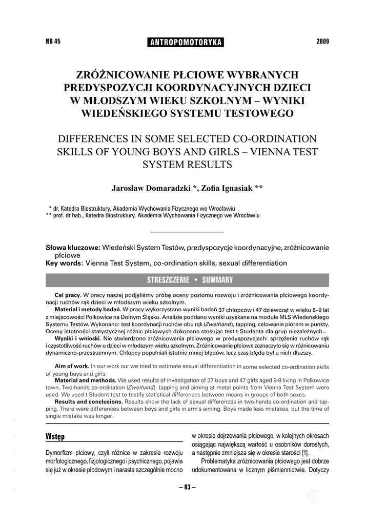 NR 45 AN TRO PO MO TO RY KA 2009 ZRÓŻNICOWANIE PŁCIOWE WYBRANYCH PREDYSPOZYCJI KOORDYNACYJNYCH DZIECI W MŁODSZYM WIEKU SZKOLNYM – WYNIKI WIEDEŃSKIEGO SYSTEMU TESTOWEGO DIFFERENCES IN SOME SELECTED CO-ORDINATION SKILLS OF YOUNG BOYS AND GIRLS – VIENNA TEST SYSTEM RESULTS Jarosław Domaradzki *, Zofia Ignasiak ** ** dr, Katedra Biostruktury, Akademia Wychowania Fizycznego we Wrocławiu ** prof. dr hab., Katedra Biostruktury, Akademia Wychowania Fizycznego we Wrocławiu Słowa kluczowe: Wiedeński System Testów, predyspozycje koordynacyjne, zróżnicowanie płciowe Key words: Vienna Test System, co-ordination skills, sexual differentiation STRESZCZENIE • SUMMARY - - - - - Cel pracy. W pracy naszej podjęliśmy próbę oceny poziomu rozwoju i zróżnicowania płciowego koordynacji ruchów rąk dzieci w młodszym wieku szkolnym. Materiał i metody badań. W pracy wykorzystano wyniki badań 37 chłopców i 47 dziewcząt w wieku 8–9 lat z miejscowości Polkowice na Dolnym Śląsku. Analizie poddano wyniki uzyskane na module MLS Wiedeńskiego Systemu Testów. Wykonano: test koordynacji ruchów obu rąk (Zweihand), tapping, celowanie piórem w punkty. Oceny istotności statystycznej różnic płciowych dokonano stosując test t-Studenta dla grup niezależnych.. Wyniki i wnioski. Nie stwierdzono zróżnicowania płciowego w predyspozycjach: sprzężenie ruchów rąk i częstotliwość ruchów u dzieci w młodszym wieku szkolnym. Zróżnicowanie płciowe zaznaczyło się w różnicowaniu dynamiczno-przestrzennym. Chłopcy popełniali istotnie mniej błędów, lecz czas błędu był u nich dłuższy. Aim of work. In our work our we tried to estimate sexual differentiation in some selected co-ordination skills of young boys and girls. Material and methods. We used results of investigation of 37 boys and 47 girls aged 8-9 living in Polkowice town. Two-hands co-ordination (Zweihand), tapping and aiming at metal points from Vienna Test System were used. We used t-Student test to testify statistical differences between means in groups of both sexes. Results and conclusions. Results show the lack of sexual differences in two-hands co-ordination and tapping. There were differences between boys and girls in arm’s aiming. Boys made less mistakes, but the time of single mistake was longer. Wstęp Dymorfizm płciowy, czyli różnice w zakresie rozwoju morfologicznego, fizjologicznego i psychicznego, pojawia się już w okresie płodowym i narasta szczególnie mocno w okresie dojrzewania płciowego, w kolejnych okresach osiągając największą wartość u osobników dorosłych, a następnie zmniejsza się w okresie starości [1]. Problematyka zróżnicowania płciowego jest dobrze udokumentowana w licznym piśmiennictwie. Dotyczy – 83 – - - - - - Jarosław Domaradzki, Zofia Ignasiak to przede wszystkim różnic morfologicznych osobników obu płci. Zdaniem Starosty [2] dla teorii motoryczności problem dymorfizmu płciowego, jego przejawy i biospołeczne skutki stanowią wciąż aktualne zagadnienia badawcze. Wynika to z wciąż niejednoznacznego obrazu uwarunkowań rozwoju motorycznego na tle rozwoju morfologicznego chłopców i dziewcząt, który wydaje się być efektem większego udziału w kształtowaniu zdolności motorycznych warunków środowiska [3]. Dotyczy to przede wszystkim koordynacyjnego potencjału motorycznego. Pomimo nakreślonych już ogólnych ram rozwoju i zróżnicowania płciowego zdolności koordynacyjnych, w których stwierdza się krótki okres progresywny do czasu dojrzewania płciowego i brak istotnych odmienności u obu płci do tego momentu, różnice te narastają dopiero po 13–14 roku życia na korzyść chłopców [3, 4, 5]. Niemniej jednak charakter różnic płciowych poszczególnych predyspozycji nie jest jeszcze do końca ustalony. Większość opracowań opiera się na wynikach testów populacyjnych i sportowo-motorycznych (np. Eurofit), mniej jest natomiast opracowań, w których wykorzystano narzędzia laboratoryjne i pomiary komputerowe. Nawet stosując te ostatnie, większość autorów bada różnice wśród dorosłych mężczyzn i kobiet. Ważkość zagadnienia związana jest z faktem, iż pogłębiona analiza zróżnicowania płciowego zdolności motorycznych winna być podstawą tworzenia teoretycznych podstaw optymalnego systemu zorganizowanej aktywności fizycznej (zajęcia wychowania fizycznego i szkolenia sportowego w systemie edukacji), dostosowanej do specyfiki funkcjonowania organizmu chłopców i dziewcząt [6]. Wśród pojęć związanych z motorycznością człowieka istnieje pojęcie tzw. motoryki małej [7]. Odnosi się ono do manipulacyjnych czynności rąk. Rozwój tej motoryki odbywa się głównie w okresie dziecięcym w trakcie doskonalenia umiejętności opartych na chwytaniu, trzymaniu, manipulacji przedmiotami i wzajemnej koordynacji obu rąk. Odmienne zainteresowania w zabawach czy grach pomiędzy chłopcami a dziewczętami stają się z czasem przyczyną pogłębiających się różnic płciowych również w obszarze motoryczności [8]. Z drugiej strony zastanowić się trzeba, czy manipulacja podczas zabaw typowo dziewczęcych (lalki, domki, naczynia) i typowo chłopięcych (samochody, zwierzęta, klocki) ma na tyle odmienny charakter, by różnicować motorykę małą dzieci na etapie młodszego wieku szkolnego. Zważywszy na tak postawiony problem, celem pracy było określenie poziomu koordynacji ruchów rąk chłopców i dziewcząt w młodszym wieku szkolnym oraz ocena zróżnicowania płciowego analizowanych parametrów testu wiedeńskiego. Materiał i metody badań Materiał badawczy stanowią dane pomiarowe dzieci, które zebrano w trakcie kompleksowych badań prowadzonych przez pracowników Katedry Biostruktury Akademii Wychowania Fizycznego we Wrocławiu [9, 10]. Odbyły się one we wrześniu 2005 roku w mieście Polkowice. Miejscowość tę charakteryzuje z jednej strony wysoki poziom zanieczyszczenia metalami 