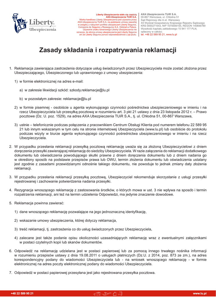 Liberty Ubezpieczenia stało się częścią AXA Ubezpieczenia TUiR S.A. Marka handlowa Liberty Ubezpieczenia jest używana przez AXA Ubezpieczenia TUiR S.A. na podstawie umowy zawartej w związku z nabyciem portfela ubezpieczeń Liberty Seguros, Compania de Seguros y Reaseguros S.A. Oddział w Polsce. Używanie znaku towarowego Liberty Ubezpieczenia nie oznacza, że stroną umowy ubezpieczenia jest Liberty Seguros ani że Liberty Seguros ponosi odpowiedzialność z jej tytułu. AXA Ubezpieczenia TUiR S.A. 00-867 Warszawa, ul. Chłodna 51 Sąd Rejonowy dla m.st. Warszawy XII Wydział Gospodarczy Krajowego Rejestru Sądowego KRS 0000271543, NIP 1070006155, REGON 140806789 Wysokość kapitału zakładowego 15 941 177 PLN, opłacony w całości. tel. +48 22 589 95 21, www.lu.pl Zasady składania i rozpatrywania reklamacji 1. Reklamacja zawierająca zastrzeżenia dotyczące usług świadczonych przez Ubezpieczyciela może zostać złożona przez Ubezpieczającego, Ubezpieczonego lub uprawnionego z umowy ubezpieczenia: 1) w formie elektronicznej na adres e-mail: a) w zakresie likwidacji szkód: [email protected] b) w pozostałym zakresie: [email protected] 2) w formie pisemnej - osobiście u agenta wykonującego czynności pośrednictwa ubezpieczeniowego w imieniu i na rzecz Ubezpieczyciela lub przesyłką pocztową w rozumieniu art. 3 pkt 21 ustawy z dnia 23 listopada 2012 r. – Prawo pocztowe (Dz. U. poz. 1529), na adres AXA Ubezpieczenia TUiR S.A., tj. ul. Chłodna 51, 00-867 Warszawa, 3) ustnie – telefonicznie podczas połączenia z pracownikiem Centrum Obsługi Klienta pod numerem telefonu 22 589 95 21 lub innym wskazanym w tym celu na stronie internetowej Ubezpieczyciela (www.lu.pl) lub osobiście do protokołu podczas wizyty w biurze agenta wykonującego czynności pośrednictwa ubezpieczeniowego w imieniu i na rzecz Ubezpieczyciela. 2. W przypadku przesłania reklamacji przesyłką pocztową reklamację uważa się za złożoną Ubezpieczycielowi z dniem doręczenia przesyłki zawierającej reklamację do siedziby Ubezpieczyciela. W razie załączenia do reklamacji dodatkowego dokumentu lub oświadczenia powodującego skutki prawne z dniem doręczenia dokumentu lub z dniem nadania go w określony sposób na podstawie przepisów prawa lub OWU, termin złożenia dokumentu lub oświadczenia ustalany jest zgodnie z zasadami przewidzianymi odnośnie takiego dokumentu, nie powoduje to jednak zmiany daty złożenia reklamacji. 3. W przypadku przesłania reklamacji przesyłką pocztową, Ubezpieczyciel rekomenduje skorzystanie z usługi przesyłki rejestrowanej i zachowanie potwierdzenia nadania przesyłki. 4. Rezygnacja wnoszącego reklamację z zastosowania środków, o których mowa w ust. 3 nie wpływa na sposób i termin rozpatrzenia reklamacji, ani też na termin udzielenia Odpowiedzi, ma jedynie znaczenie dowodowe. 5. Reklamacja powinna zawierać: 1) dane wnoszącego reklamację pozwalające na jego jednoznaczną identyfikację, 2) wskazanie umowy ubezpieczenia, której dotyczy reklamacja, 3) treść reklamacji, tj. zastrzeżenia co do usług świadczonych przez Ubezpieczyciela, 4) zalecane jest także podanie opisu okoliczności uzasadniających reklamację wraz z ewentualnymi załącznikami w postaci czytelnych kopii lub skanów dokumentów. 6. Odpowiedź na reklamację udzielana jest w postaci papierowej lub za pomocą innego trwałego nośnika informacji w rozumieniu przepisów ustawy z dnia 19.08.2011 o usługach płatniczych (Dz.U. z 2014, poz. 873 ze zm.), na adres korespondencyjny podany do wiadomości Ubezpieczyciela lub - na wniosek wnoszącego reklamację - w formie elektronicznej na adres poczty elektronicznej podany do wiadomości Ubezpieczyciela. 7. Odpowiedź w postaci papierowej przesyłana jest jako rejestrowana przesyłka pocztowa. +48 22 589 95 21 www.lu.pl 8. Ubezpieczyciel udziela odpowiedzi na reklamację niezwłocznie po rozpatrzeniu reklamacji, jednak w terminie nie dłuższym, niż 30 dni od dnia otrzymania reklamacji. Do zachowania terminu wystarczy wysłanie odpowiedzi przed jego upływem. 9. W szczególnie skomplikowanych przypadkach uniemożliwiających udzielenie odpowiedzi w terminie określonym w ust. 8., Ubezpieczyciel informuje wnoszącego reklamację (w formie właściwej dla odpowiedzi na reklamację) o: 1) przyczynie opóźnienia, 2) okolicznościach, które Ubezpieczyciel musi ustalić w celu rozpatrzenia reklamacji, 3) przewidywanym terminie przesłania odpowiedzi, który jednak nie może przekroczyć 60 dni od dnia otrzymania reklamacji. 10.W relacjach z wnoszącym reklamację, który jest osobą fizyczną mają zastosowanie następujące zasady: 1) przypadku niedotrzymania terminu wskazanego w ust. 8 lub 9 pkt 3) reklamację uważa się za rozpatrzoną zgodnie z wolą wnoszącego reklamację; 2) jeżeli wnoszący reklamację nie zgadza się z odpowiedzią na reklamację może wnieść do Rzecznika Finansowego wniosek o rozpatrzenie sprawy w ramach pozasądowego postępowania w sprawie rozwiązywania sporów zgodnie z przepisami ustawy z 5 sierpnia 2015 r. o rozpatrywaniu reklamacji przez podmioty rynku finansowego i o Rzeczniku Finansowym (Dz.U. z 2015 r., poz. 1348). +48 22 589 95 21 www.lu.pl