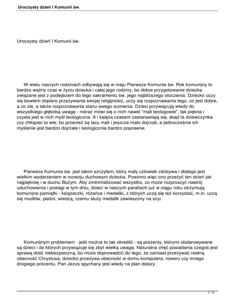 Uroczysty dzień I Komunii św. Uroczysty dzień I Komunii św. W wielu naszych rodzinach odbywają się w maju Pierwsze Komunie św. Rok komunijny to bardzo ważny czas w życiu dziecka i całej jego rodziny, bo dobre przygotowanie dziecka związane jest z podejściem do tego sakramentu św. jego najbliższego otoczenia. Dziecko uczy się bowiem dopiero przeżywania swojej religijności, uczy się rozpoznawania tego, co jest dobre, a co złe, a także rozpoznawania stanu swego sumienia. Dzieci przywiązują wtedy do wszystkiego głęboką uwagę - nieraz mówi się o nich nawet "mali teologowie", tak piękna i czysta jest w nich myśl teologiczna. A i księża czasem zastanawiają się, skąd ta dziewczynka czy chłopiec to wie, bo przecież są tacy mali i jeszcze mało dojrzali, a jednocześnie ich myślenie jest bardzo dojrzałe i teologicznie bardzo poprawne. Pierwsza Komunia św. jest takim szczytem, który mały człowiek zdobywa i dlatego jest wielkim wydarzeniem w rozwoju duchowym dziecka. Powinno więc ono przeżyć ten dzień jak najpiękniej i w duchu Bożym. Aby zminimalizować wszystko, co może rozproszyć nastrój uduchowienia i powagi w tym dniu, dzieci w naszych parafiach już w ciągu roku otrzymują komunijne pamiątki - książeczki, różańce i medaliki, z których uczą się też korzystać, m.in. uczą się modlitw, pieśni, wiedzą, czemu służy medalik zawieszony na szyi. Komunijnym problemem - jeśli można to tak określić - są prezenty, którymi obdarowywane są dzieci i do których przywiązuje się zbyt wielką uwagę. Naturalna chęć posiadania czegoś jest sprawą dość niebezpieczną, bo może doprowadzić do tego, że zamiast przeżywać realną obecność Chrystusa, dziecko przeżywa obecność w domu komputera, roweru czy innego drogiego prezentu. Pan Jezus spychany jest wtedy na plan dalszy. 1/3 Uroczysty dzień I Komunii św. Oczywiście, trzeba być wdzięcznym za prezenty, ale trzeba też uczyć dziecko dystansu wobec rzeczy materialnych. Istotą tej uroczystości jest przyjęcie Pana Jezusa i to On w Eucharystii jest największym darem dla dziecka. Tej uroczystej chwili nie powinien rozpraszać także strój, choć na tę okazję jest on zawsze wyjątkowy. Trzeba zrobić wszystko, by nie odebrać dziecku tego, co jest największym skarbem tego dnia. Także w kolejne dni tzw. białego tygodnia dzieci, ubrane uroczyście, będą realizować zaplanowany program duszpasterski. Tę radość trzeba bowiem przeżywać na różnych płaszczyznach, by dziecko było świadome wielowymiarowości Kościoła. W czasie pokomunijnym ważne jest również pielgrzymowanie dzieci, np. na Jasną Górę czy do innych sanktuariów maryjnych. Dzieci przybywają do Matki Jezusa z eucharystycznym darem Jej Syna i chcą Ją prosić, by pomagała im być z Jezusem, kochać Go i zawsze o Nim pamiętać. Pamiętajmy, że Pierwsza Komunia św. powinna mieć charakter religijny, uczyć pobożności szczerej i prawdziwej, takiej, która prowadzi dziecko do kościoła, a nie na wybieg dla modeli czy na aukcję otrzymanych prezentów komunijnych. Bo cała uroczystość służy temu, by podkreślić, jaki skarb będzie teraz otrzymywać dziecko w Komunii św. 2/3 Uroczysty dzień I Komunii św. Ks. Ireneusz Skubiś Tekst pochodzi z Tygodnika Katolickiego 3/3