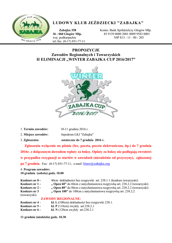 LUDOWY KLUB JEŹDZIECKI "ZABAJKA" Zabajka 358 36 - 060 Głogów Młp. woj. podkarpackie tel./fax (0-17) 851-77-11 Konto: Bank Spółdzielczy Głogów Młp. 85 9159 0000 2001 0009 9583 0001 NIP 813 - 11 - 00 - 203 PROPOZYCJE Zawodów Regionalnych i Towarzyskich II ELIMINACJI „WINTER ZABAJKA CUP 2016/2017” 1. Termin zawodów: 10-11 grudnia 2016 r. 2. Miejsce zawodów: hipodrom LKJ "Zabajka" 3. Zgłoszenia: ostateczne do 7 grudnia 2016 r. Zgłoszenia wyłącznie na piśmie (fax, poczta, poczta elektroniczna, itp.) do 7 grudnia 2016r. z dołączonym dowodem wpłaty za boksy. Opłaty za boksy nie podlegają zwrotowi w przypadku rezygnacji ze startów w zawodach (niezależnie od przyczyny), zgłoszonej po 7 grudnia. Fax: (0-17) 851-77-11, e-mail: [email protected] 4. Program zawodów: 10 grudnia (sobota) godz. 10.00 Konkurs nr 0 Konkurs nr 1 Konkurs nr 2 Konkurs nr 3 (towarzyski) Konkurs nr 4 Konkurs nr 5 Konkurs nr 6 - 40cm dokładności bez rozgrywki art. 238.1.1 (konkurs towarzyski) „ Open 60” do 60cm z natychmiastowa rozgrywką art. 238.2.2 (towarzyski) „ Open 80” do 80cm z natychmiastowa rozgrywką art. 238.2.2 (towarzyski) „ Open 100” do 100cm z natychmiastowa rozgrywką art. 238.2.2 ZAWODY REGIONALNE: kl. L (100cm) dokładności bez rozgrywki 238.1. kl. P (110cm) zwykły art.238.2.1 kl. N (120cm zwykły art.238.2.1 11 grudnia (niedziela) godz. 10.30 40cm dokładności bez rozgrywki art. 238.1.1 (konkurs towarzyski) „ Open 60” do 60cm z natychmiastowa rozgrywką art. 238.2.2 (towarzyski) „ Open 80” do 80cm z natychmiastowa rozgrywką art. 238.2.2 (towarzyski) „ Open 100” do 100cm z natychmiastowa rozgrywką art. 238.2.2(towarzyski) ZAWODY REGIONALNE: Konkurs nr 10 kl. L (100cm) dokładności bez rozgrywki 238.1.1 Konkurs nr 11 kl. P (110cm) zwykły art.238.2.1 Konkurs nr 0 Konkurs nr 7 Konkurs nr 8 Konkurs nr 9 KONKURSY 1,2,3,7,8,9 zaliczane do I eliminacji „WINTER ZABAJKA CUP 2016/2017” Pozostałe konkursy to zawody regionalne. Sobota godz. 20.00 OGNISKO DLA WSZYSTKICH ZAWODNIKÓW, TRENERÓW, LUZAKÓW, SZEFÓW EKIP, WŁAŚCICIELI KONI, SĘDZIÓW 6. OPŁATY Opłaty za start - tylko w „WINTER ZABAJKA CUP” opłata od zawodnika 100zł + boks 80zł od konia za całe zawody - „WINTER ZABAJKA CUP” + ZAWODY REGIONALNE opłata od zawodnika 130zł + boks 80zł od konia za całe zawody - ZAWODY REGIONALNE opłata od zawodnika 130zł + boks 80zł od konia za całe zawody - start za 1 dzień zawodów („WINTER ZABAJKA CUP” lub „WINTER ZABAJKA CUP” + ZAWODY REGIONALNE) 110zł od konia (w tym boks) Boksy przygotowane od 9 grudnia 2016 r., godz. 16.00. Wpłaty można przelać na konto Bank Spółdzielczy Głogów Młp. 85 9159 0000 2001 0009 9583 0001 Opłata organizacyjna musi być uregulowana na godzinę przed rozpoczęciem pierwszego konkursu. W przypadku nieuregulowania opłat, do startu nie zostanie dopuszczona cała ekipa. - cisza nocna w stajni od godz. 22.00 – 6.00 - prosimy o przestrzeganie przepisów BHP i p.poż. 7. Zakwaterowanie: Zawodnicy, szefowie ekip, trenerzy, luzacy – noclegi na własny koszt. Można dokonać rezerwacji w LKJ „Zabajka”: -stare domki 2- osobowe: cena 50zł z własnymi śpiworami; -nowe domki 2-osobowe: cena 70zł nowy domek 4-osobowy: cena 140zł -w 6 pokojach gościnnych po 2osobowy – 90zł 3osobowy – 135zł Wyżywienie: We własnym zakresie w Gospodzie Wiśta-wio! na terenie zawodów. zawody odbywać się będą na hali 8. Warunki techniczne: tor konkursowy, wymiary: 25 x 56 [m]– podłoże piaszczyste z flizeliną rozprężania, wymiary: 12 x 25 [m] – podłoże piaszczyste 9. Klasyfikacja ogólna: - flots dla 25% startujących w konkursie, - po każdym konkursie odbędzie się dekoracja zwycięzców. nie przewiduje się zebrania technicznego 10. Zebranie techniczne: Sprawdzanie dokumentów koni i zawodników odbędzie się w biurze zawodów w dniu 10 grudnia 2016 r.(sobota) godz. 8.00. 11. Uczestnictwo: W „WINTER ZABAJKA CUP”: Zgodnie z Regulaminem „WINTER ZABAJKA CUP” 12. Osoby oficjalne: Komisja sędziowska: Przewodniczący WZJ / Styl: Komisarz: III: Gospodarz toru: Lekarz weterynarii: Agnieszka Kloc Katarzyna Bącal Barbara Galuba Danuta Zakrzewska, Wojciech Wiater, Adam Galuba dr Jacek Sołtyski, Tel.: 500 049 955 13. Informacje ogólne: Zawody odbywają się wg aktualnych przepisów i regulaminów PZJ Odpowiedzialność: Organizatorzy nie ponoszą odpowiedzialności z tytułu wypadków i zachorowań trenerów, zawodników, luzaków i koni, jak również w przypadku kradzieży, zniszczeń, pożarów i innych wydarzeń wynikłych w czasie transportu i trwania zawodów. Organizacja zawodów: W nadzwyczajnych okolicznościach nieprzewidzianych organizator zastrzega sobie prawo do odwołania zwodów. Ubezpieczenie: przepisami, Przypominamy o obowiązkowym ubezpieczeniu NNW zawodników oraz aktualnych badaniach zawodników. Wstęp do stajni: Poza osobami oficjalnymi, prawo wstępu do stajni mają tylko: szefowie ekip, trenerzy, zawodnicy, luzacy, właściciele koni. 14. Listy startowe: Dokonanie zmian na listach startowych (po ich wywieszeniu) za zgodą Sędziego Głównego – 0 zł. 15. Protesty i skargi (art. 65 i art.66 Przepisów ogólnych PZJ) Każdy protest i skarga, ażeby były ważne, muszą być zgłoszone na piśmie z dołączeniem kaucji w wysokości 200 PLN. KODEKS POSTĘPOWANIA Z KONIEM I. Na wszystkich etapach treningu i przygotowań konia do startu w zawodach, dobro konia musi stać ponad wszelkimi innymi wymaganiami. Dotyczy to stałej opieki, metod treningu, starannego obrządku, kucia i transportu. II. Konie i jeźdźcy muszą być wytrenowani, kompetentni i zdrowi zanim wezmą udział w zawodach. Odnosi się to także do podawania leków środków medycznych, zabiegów chirurgicznych zagrażających dobru konia lub ciąży klaczy, oraz do przypadków nadużywania przemocy. III. Zawody nie mogą zagrażać dobru konia. Wymaga to zwrócenie szczególnej uwagi na teren zawodów, 