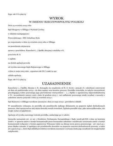 Sygn. akt I Ca 369/15 WYROK W IMIENIU RZECZYPOSPOLITEJ POLSKIEJ Dnia 23 września 2015 roku Sąd Okręgowy w Elblągu I Wydział Cywilny w składzie następującym : Przewodniczący : SSO Arkadiusz Kuta po rozpoznaniu w dniu 23 września 2015 roku w Elblągu na posiedzeniu niejawnym sprawy z powództwa Kancelarii (...) Spółki Akcyjnej z siedzibą w K. przeciwko R. S. o zapłatę na skutek apelacji powoda od wyroku zaocznego Sądu Rejonowego w Elblągu z dnia 21 maja 2015 roku , sygnatura akt IX C 1098/14 upr oddala apelację . Sygn. akt I Ca 369/15 UZASADNIENIE Kancelaria (...) Spółka Akcyjna w K. domagała się zasądzenia od R. S. kwoty 1.505,96 zł z odsetkami umownymi od dnia 26 października 2013 r. do dnia zapłaty oraz kosztów procesu. Powódka twierdziła, że nabyła wierzytelność przysługującą wobec pozwanego jego pierwotnemu wierzycielowi – (...) Spółce z ograniczoną odpowiedzialnością w W., na podstawie umowy cesji z dnia 16 grudnia 2013 r., zaś zadłużenie pozwanego miało wynikać z zawartej z cedentem umowy pożyczki z dnia 23 września 2013 r. Sąd Rejonowy w Elblągu wyrokiem zaocznym z dnia 21 maja 2015 r. powództwo oddalił. W uzasadnieniu wskazano, że powódka nie przedstawiła żadnego dokumentu na poparcie żądań dochodzonych pozwem, choć spoczywał na niej ciężar dowodu swoich twierdzeń. Żądania powódki więc, jako nieweryfikowalne, nie mogły zostać uwzględnione. Apelację od wyroku zaocznego wniosła powódka, zaskarżając go w całości. Zarzuciła naruszenie art. 10 ust 1 Dyrektywy Parlamentu Europejskiego i Rady 2008/48/WE z dnia 23 kwietnia 2008 r. w sprawie umów o kredyt konsumencki przez bezzasadne założenie o możliwości zawierania umów o kredyt konsumencki wyłącznie w formie papierowej. Wskazano także na obrazę norm prawa procesowego - art. 232 k.p.c. przez błędne uznanie, iż apelująca nie przedstawiła dowodów na poparcie roszczeń dochodzonych pozwem, a także art. 339 § 2 k.p.c., skoro Sąd oddalił powództwo wyrokiem zaocznym w sytuacji, kiedy jego zasadność nie mogła budzić wątpliwości. Powódka domagała się zmiany zaskarżonego wyroku i uwzględnienia żądań dochodzonych pozwem oraz zasądzenia na jej rzecz kosztów postępowania, ewentualnie uchylenia tego wyroku i przekazanie sprawy Sądowi pierwszej instancji do ponownego rozpoznania. Skarżąca argumentowała, że w toku postępowania przed Sądem pierwszej instancji przedstawiła dowody na poparcie żądań pozwu. Ze złożonych przez nią dokumentów wynikał zarówno sam fakt zawarcia umowy pożyczki pomiędzy pozwanym, a cedentem, jak również fakt zawarcia umowy cesji, uzasadniającej uprawnienie apelantki do dochodzenia od pozwanego roszczeń wymienionych w pozwie. Sąd Okręgowy w Elblągu ustalił i zważył , co następuje : Apelacja Kancelarii (...) Spółki Akcyjnej z siedzibą w K. okazała się bezzasadna i podlegała oddaleniu . Przebieg postępowania przed Sądem pierwszej instancji determinować mogło niestawiennictwo pozwanego na posiedzeniu wyznaczonym na rozprawę . Skoro nie zajął on także stanowiska na piśmie to otwierało się pole do stosowania art. 339 § 2 k.p.c. Gdy pozwany jest bierny to sąd przyjmuje za prawdziwe twierdzenia powoda o okolicznościach faktycznych przytoczonych w pozwie . Powódka stanowisko co do istoty sprawy przedstawiła wyłącznie w uzasadnieniu pozwu . Wiadomo zatem tylko tyle , że przysługiwać ma jej względem R. S. wierzytelność przelana przez Spółkę (...) Polska , która zawarła z pozwanym umowę pożyczki kwoty 999 zł za pośrednictwem platformy internetowej . Pozwany kwotę tą wypłacił i zobowiązany był do zwrotu kapitału , odsetek i dodatkowych kosztów w łącznej kwocie 1.505,96 zł . Twierdzenia powódki budziły uzasadnione wątpliwości z braku choćby podstawowej możliwości ich konfrontacji z dowodami . W toku niniejszego postępowania nie przedstawiono umów pożyczki i przelewu ani żadnych innych dokumentów poświadczających dokonanie tych czynności , pobranie środków przez pozwanego , wzywanie do zapłaty długu czy zawiadomienie o cesji wierzytelności . Dowodów nie przedstawiono ani w postaci kopii dokumentów sporządzonych pisemnie , ani materiałów pochodzących z innego trwałego nośnika . W związku z tym zupełnie bezpodstawne są zarzuty naruszenia przez Sąd pierwszej instancji wymienionych w apelacji norm bowiem tych w uzasadnieniu zaskarżonego wyroku nie wskazywano , ani wskazywać nie trzeba było . Powodowa Spółka zdaje się przekonana o wadliwej ocenie przedstawionych w rozstrzyganej sprawie dowodów podczas gdy żadnego dowodu nie przedstawiła . Postępowanie apelacyjne toczy się pomimo dalszej bezczynności pozwanego i wyrok kończący sprawę w drugiej instancji nie jest wyrokiem zaocznym ( art. 376 k.p.c. ) . Przyjąć więc należy , że w postępowaniu apelacyjnym w ogóle nie stosuje się przepisów o wyrokowaniu zaocznym . Sytuacja procesowa powoda , którego powództwo oddalono wyrokiem zaocznym , pomimo odpadnięcia możliwości stosowania art. 339 § 2 k.p.c. , nadal pozwalała na wykorzystanie bezczynności przeciwnika i naprawienie uchybień wytkniętych przez Sąd pierwszej instancji , co w ogólności polegać mogło na dawaniu wyjaśnień co do okoliczności sprawy zgodnie z prawdą i bez zatajania czegokolwiek oraz przedstawieniu dowodów ( art. 3 k.p.c. ) . Nie było przecież przeszkód aby w drugiej instancji przeprowadzić postępowanie dowodowe z dokumentów ( art. 50511 § 1 k.p.c. ) . Powódka dowodów nadal nie przedstawiła . Uzasadnienie apelacji ostatecznie wyłącza zaś możliwość oparcia się li tylko na niezaprzeczonych twierdzeniach powódki o okolicznościach faktycznych . Tym razem wskazuje się bowiem , że poprzednik (...) Spółki (...) udzielił pozwanemu pożyczki w kwocie 390 zł i ten zwrócić winien obecnie kwotę 736,99 zł . Powołano się zatem na okoliczności nowe , sprz