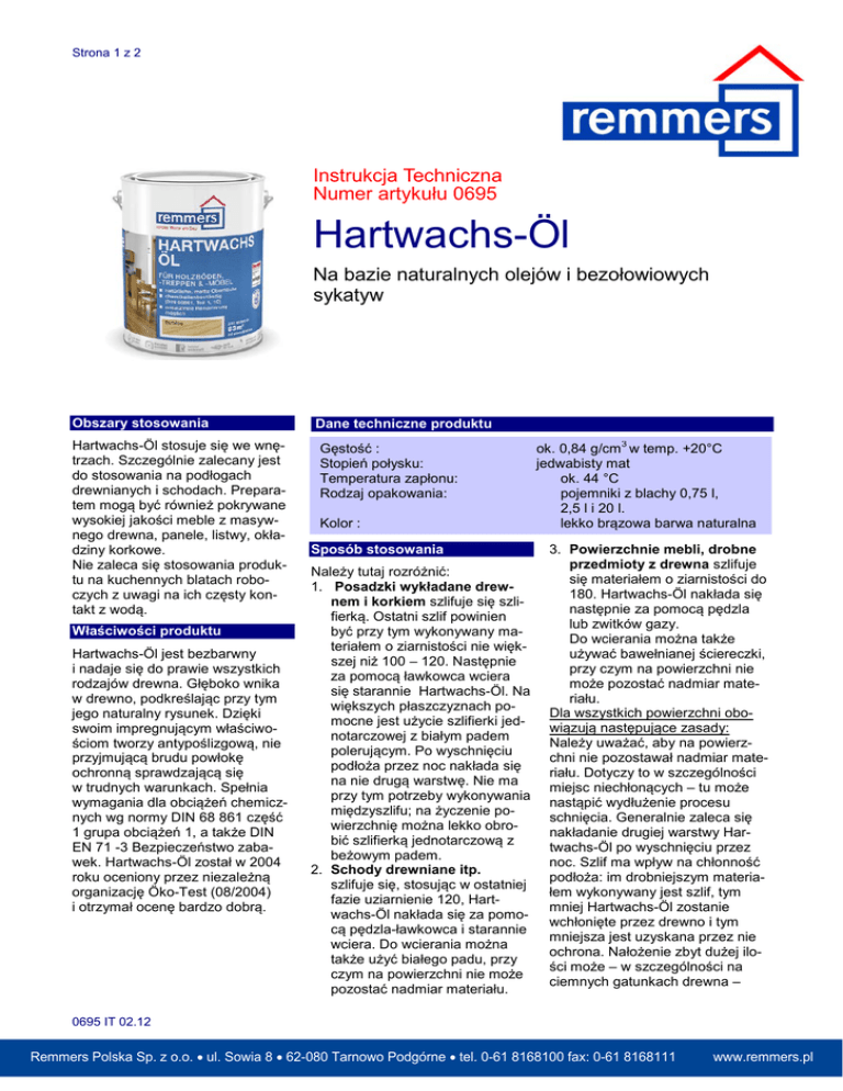 Strona 1 z 2 Instrukcja Techniczna Numer artykułu 0695 Hartwachs-Öl Na bazie naturalnych olejów i bezołowiowych sykatyw Obszary stosowania Hartwachs-Öl stosuje się we wnętrzach. Szczególnie zalecany jest do stosowania na podłogach drewnianych i schodach. Preparatem mogą być również pokrywane wysokiej jakości meble z masywnego drewna, panele, listwy, okładziny korkowe. Nie zaleca się stosowania produktu na kuchennych blatach roboczych z uwagi na ich częsty kontakt z wodą. Właściwości produktu Hartwachs-Öl jest bezbarwny i nadaje się do prawie wszystkich rodzajów drewna. Głęboko wnika w drewno, podkreślając przy tym jego naturalny rysunek. Dzięki swoim impregnującym właściwościom tworzy antypoślizgową, nie przyjmującą brudu powłokę ochronną sprawdzającą się w trudnych warunkach. Spełnia wymagania dla obciążeń chemicznych wg normy DIN 68 861 część 1 grupa obciążeń 1, a także DIN EN 71 -3 Bezpieczeństwo zabawek. Hartwachs-Öl został w 2004 roku oceniony przez niezależną organizację Öko-Test (08/2004) i otrzymał ocenę bardzo dobrą. Dane techniczne produktu Gęstość : Stopień połysku: Temperatura zapłonu: Rodzaj opakowania: Kolor : Sposób stosowania Należy tutaj rozróżnić: 1. Posadzki wykładane drewnem i korkiem szlifuje się szlifierką. Ostatni szlif powinien być przy tym wykonywany materiałem o ziarnistości nie większej niż 100 – 120. Następnie za pomocą ławkowca wciera się starannie Hartwachs-Öl. Na większych płaszczyznach pomocne jest użycie szlifierki jednotarczowej z białym padem polerującym. Po wyschnięciu podłoża przez noc nakłada się na nie drugą warstwę. Nie ma przy tym potrzeby wykonywania międzyszlifu; na życzenie powierzchnię można lekko obrobić szlifierką jednotarczową z beżowym padem. 2. Schody drewniane itp. szlifuje się, stosując w ostatniej fazie uziarnienie 120, Hartwachs-Öl nakłada się za pomocą pędzla-ławkowca i starannie wciera. Do wcierania można także użyć białego padu, przy czym na powierzchni nie może pozostać nadmiar materiału. 3 ok. 0,84 g/cm w temp. +20°C jedwabisty mat ok. 44 °C pojemniki z blachy 0,75 l, 2,5 l i 20 l. lekko brązowa barwa naturalna 3. Powierzchnie mebli, drobne przedmioty z drewna szlifuje się materiałem o ziarnistości do 180. Hartwachs-Öl nakłada się następnie za pomocą pędzla lub zwitków gazy. Do wcierania można także używać bawełnianej ściereczki, przy czym na powierzchni nie może pozostać nadmiar materiału. Dla wszystkich powierzchni obowiązują następujące zasady: Należy uważać, aby na powierzchni nie pozostawał nadmiar materiału. Dotyczy to w szczególności miejsc niechłonących – tu może nastąpić wydłużenie procesu schnięcia. Generalnie zaleca się nakładanie drugiej warstwy Hartwachs-Öl po wyschnięciu przez noc. Szlif ma wpływ na chłonność podłoża: im drobniejszym materiałem wykonywany jest szlif, tym mniej Hartwachs-Öl zostanie wchłonięte przez drewno i tym mniejsza jest uzyskana przez nie ochrona. Nałożenie zbyt dużej ilości może – w szczególności na ciemnych gatunkach drewna – 0695 IT 02.12 Remmers Polska Sp. z o.o. • ul. Sowia 8 • 62-080 Tarnowo Podgórne • tel. 0-61 8168100 fax: 0-61 8168111 www.remmers.pl Strona 2 z 2 spowodować powstanie plam na powierzchni. Różnice stopnia połysku po nałożeniu drugiej warstwy, powstałe na skutek nierównomiernego nasycenia włókien drewna można wyrównać, ponownie nakładając cienką warstwę Hartwachs-Öl. Należy sprawdzić tolerancję z podłożem i końcowy efekt kolorystyczny przez wykonanie próbnego malowania. Wskazówki należy usunąć za pomocą wełny stalowej i nanieść cienką warstwę Hartwachs-Öl. Zawiera kobaltoktoat. Może powodować reakcje alergiczne. Narzędzia, czyszczenie Usuwanie Zwitki z gazy, szczotki do rozprowadzania, pędzle. Natychmiast po użyciu narzędzia wyczyścić stosując Verdünnung V 101, nr art. 0978. Zużycie, ilość nakładanego materiału Zużycie w istotnym stopniu zależy od chłonności drewna i od ostatniego szlifu. Zużycie na poziomie 10 – 50 ml/m² odzwierciedla doświadczenia praktyczne. Hartwachs-Öl stosować tylko zgodnie z przeznaczeniem i według instrukcji. Chronić przed dziećmi. Unikać zanieczyszczenia oczu i skóry. W czasie pracy nie jeść, nie pić i nie palić tytoniu. Nie przechowywać razem z żywnością i paszą dla zwierząt. W czasie stosowania wewnątrz zadbać o odpowiednie wietrzenie. Nie stosować produktu na tym samym natrysku co bejce lub lakiery zawierające nitrocelulozę. Istnieje niebezpieczeństwo samozapalenia. Zabrudzoną środkiem odzież, ścierki, które mogą ulec samozapaleniu, gromadzić w pojemnikach ogniotrwałych i usuwać. Nadmiar materiału na niechłonących miejscach wydłuża proces schnięcia podobnie, jak niższe temperatury. Czyszczenie i pielęgnacja Składowanie Luźne zanieczyszczenia, pyły i piasek na schodach i podłogach należy regularnie usuwać za pomocą miotły lub mopa. Do pielęgnacji podtrzymującej zalecamy nasz Hartwachs-Polish, nr. art. 0687. Dzięki tem]u schody i podłogi zostaną optymalnie zabezpieczone i na długo zachowają swoją jakość. Do okazyjnej renowacji wyczyszczoną powierzchnię pokryć ponownie Hartwachs-Öl. Zabieg ten można także wykonywać partiami, w miejscach szczególnie mocno zniszczonych, ponieważ produkt nie pozostawia śladów na brzegach rozprowadzonej części materiału. Odciski szklanek lub plamy na meblach W zamkniętych oryginalnych opakowaniach, w miejscu suchym i chłodnym – co najmniej 5 lat. Resztki produktu należy usuwać zgodnie z obowiązującymi przepisami. Opróżnione opakowania przekazywać do systemu recyklingu. Oznaczenia WGK: ADR 2 -/- Schnięcie Około 12 – 16 godzin w temp. 20°C i wilgotności względnej powietrza 65%. Po poddanej zabiegowi powierzchni można chodzić po upływie 7 dni. Zawartość lotnych związków