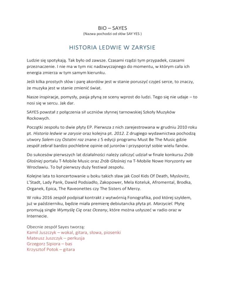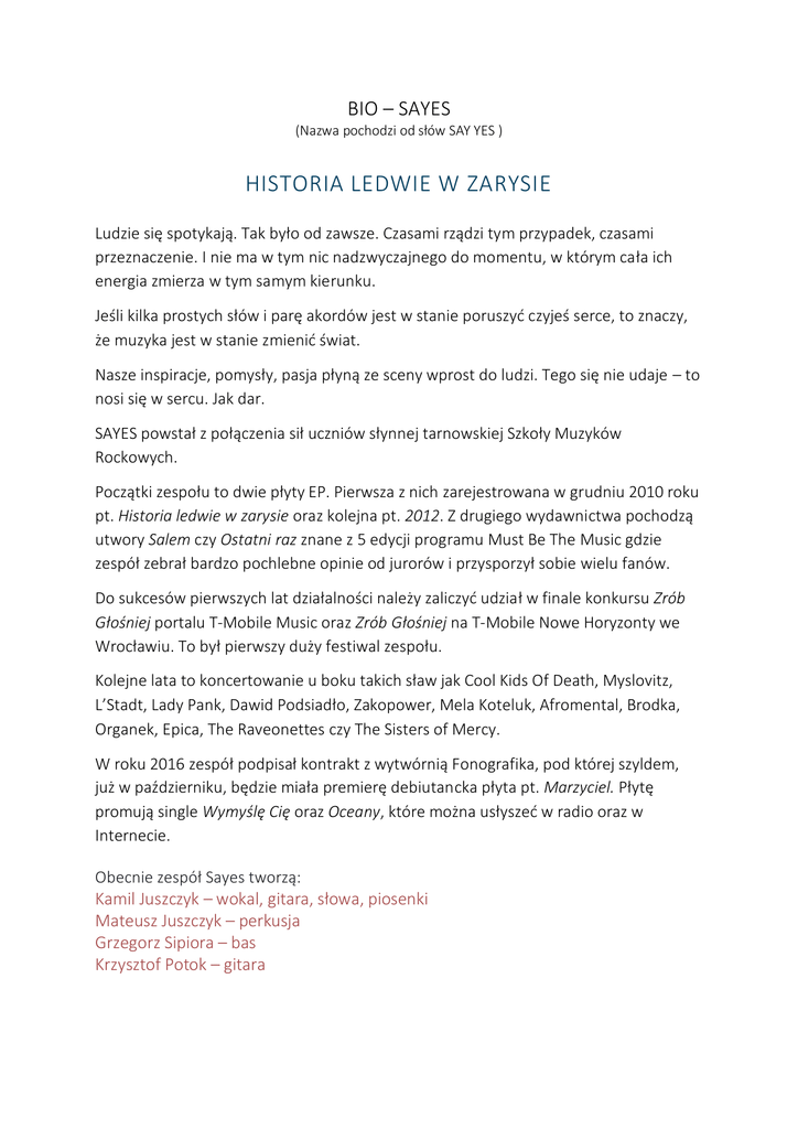 BIO – SAYES (Nazwa pochodzi od słów SAY YES ) HISTORIA LEDWIE W ZARYSIE Ludzie się spotykają. Tak było od zawsze. Czasami rządzi tym przypadek, czasami przeznaczenie. I nie ma w tym nic nadzwyczajnego do momentu, w którym cała ich energia zmierza w tym samym kierunku. Jeśli kilka prostych słów i parę akordów jest w stanie poruszyć czyjeś serce, to znaczy, że muzyka jest w stanie zmienić świat. Nasze inspiracje, pomysły, pasja płyną ze sceny wprost do ludzi. Tego się nie udaje – to nosi się w sercu. Jak dar. SAYES powstał z połączenia sił uczniów słynnej tarnowskiej Szkoły Muzyków Rockowych. Początki zespołu to dwie płyty EP. Pierwsza z nich zarejestrowana w grudniu 2010 roku pt. Historia ledwie w zarysie oraz kolejna pt. 2012. Z drugiego wydawnictwa pochodzą utwory Salem czy Ostatni raz znane z 5 edycji programu Must Be The Music gdzie zespół zebrał bardzo pochlebne opinie od jurorów i przysporzył sobie wielu fanów. Do sukcesów pierwszych lat działalności należy zaliczyć udział w finale konkursu Zrób Głośniej portalu T-Mobile Music oraz Zrób Głośniej na T-Mobile Nowe Horyzonty we Wrocławiu. To był pierwszy duży festiwal zespołu. Kolejne lata to koncertowanie u boku takich sław jak Cool Kids Of Death, Myslovitz, L’Stadt, Lady Pank, Dawid Podsiadło, Zakopower, Mela Koteluk, Afromental, Brodka, Organek, Epica, The Raveonettes czy The Sisters of Mercy. W roku 2016 zespół podpisał kontrakt z wytwórnią Fonografika, pod której szyldem, już w październiku, będzie miała premierę debiutancka płyta pt. Marzyciel. Płytę promują single Wymyślę Cię oraz Oceany, które można usłyszeć w radio oraz w Internecie. Obecnie zespół Sayes tworzą: Kamil Juszczyk – wokal, gitara, słowa, piosenki Mateusz Juszczyk – perkusja Grzegorz Sipiora – bas Krzysztof Potok – gitara WAŻNE DATY 2012 Finalista konkursu Zrób głośniej na T-Mobile Nowe Horyzonty (koncert z Cool Kids Of Death) 2012 Europejskie Targi Muzyczne Co Jest Grane – Scena T-Mobile Music 2012 Zdearzenia Tarnów – support przed Myslovitz 2013 Warsaw Music Week – support przed gwiazdą festiwalu The Raveonettes 2014 Czyżynalia – nagroda główna występ na Festiwalu przed między innymi Epica, The Sisters Of Mercy 2014 Półfinalista Must Be The Music 2015 Juwenalia UEK, nagroda główna, nagroda publiczności 2015 Festiwal Talentów Muzycznych w Szczecinie – finalista (jury: Piotr Metz, Katarzyna Nosowska, Paweł Krawczyk) 2015 Festiwal Synestezje w Krakowie – finalista 2016 Zimowa Giełda Piosenki – nagroda główna 2016 Podpisanie umowy z Fonografiką 2016 Hej Fest Zakopane – finalista festiwalu supportów (support Lady Pank, Dawid Podsiadło, Brodka, Mela Koteluk) 2016 Festiwal Funduszy Europejskich – support Dawid Podsiadło, Zakopower 2016 Debiutancka płyta "Marzyciel" 2016 Supporty Piotr Zioła, Organek