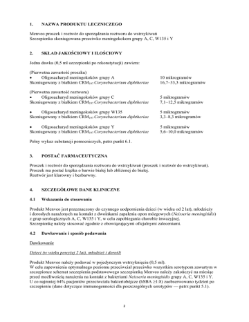 1. NAZWA PRODUKTU LECZNICZEGO Menveo proszek i roztwór do sporządzania roztworu do wstrzykiwań Szczepionka skoniugowana przeciwko meningokokom grupy A, C, W135 i Y 2. SKŁAD JAKOŚCIOWY I ILOŚCIOWY Jedna dawka (0,5 ml szczepionki po rekonstytucji) zawiera: (Pierwotna zawartość proszku) Oligosacharyd meningokoków grupy A Skoniugowany z białkiem CRM197 Corynebacterium diphtheriae 10 mikrogramów 16,7–33,3 mikrogramów (Pierwotna zawartość roztworu) Oligosacharyd meningokoków grupy C Skoniugowany z białkiem CRM197 Corynebacterium diphtheriae 5 mikrogramów 7,1–12,5 mikrogramów Oligosacharyd meningokoków grupy W135 Skoniugowany z białkiem CRM197 Corynebacterium diphtheriae 5 mikrogramów 3,3–8,3 mikrogramów Oligosacharyd meningokoków grupy Y Skoniugowany z białkiem CRM197 Corynebacterium diphtheriae 5 mikrogramów 5,6–10,0 mikrogramów Pełny wykaz substancji pomocniczych, patrz punkt 6.1. 3. POSTAĆ FARMACEUTYCZNA Proszek i roztwór do sporządzania roztworu do wstrzykiwań (proszek i roztwór do wstrzykiwań). Proszek ma postać krążka o barwie białej lub zbliżonej do białej. Roztwór jest klarowny i bezbarwny. 4. SZCZEGÓŁOWE DANE KLINICZNE 4.1 Wskazania do stosowania Produkt Menveo jest przeznaczony do czynnego uodpornienia dzieci (w wieku od 2 lat), młodzieży i dorosłych narażonych na kontakt z dwoinkami zapalenia opon mózgowych (Neisseria meningitidis) z grup serologicznych A, C, W135 i Y, w celu zapobiegania chorobie inwazyjnej. Szczepionkę należy stosować zgodnie z obowiązującymi oficjalnymi zaleceniami. 4.2 Dawkowanie i sposób podawania Dawkowanie Dzieci (w wieku powyżej 2 lat), młodzież i dorośli Produkt Menveo należy podawać w pojedynczym wstrzyknięciu (0,5 ml). W celu zapewnienia optymalnego poziomu przeciwciał przeciwko wszystkim serotypom zawartym w szczepionce schemat szczepienia podstawowego szczepionką Menveo należy zakończyć na miesiąc przed możliwością narażenia na kontakt z bakteriami Neisseria meningitidis grupy A, C, W135 i Y. U co najmniej 64% pacjentów przeciwciała bakteriobójcze (hSBA ≥1:8) zaobserwowano tydzień po szczepieniu (dane dotyczące immunogenności dla poszczególnych serotypów — patrz punkt 5.1). 2 Osoby w starszym wieku Istnieją ograniczone dane dotyczące osób w wieku 56-65 lat. Brak danych dotyczących osób w wieku powyżej 65 lat. Dawka przypominająca Długoterminowe dane dotyczące trwałości przeciwciał po podaniu szczepionki Menveo są dostępne dla okresu do 5 lat po szczepieniu (patrz punkty 4.4 i 5.1). Szczepionka Menveo może być podana jako dawka przypominająca osobom, które otrzymały uprzednio szczepienie podstawowe szczepionką Menveo, inną skoniugowaną szczepionką przeciw meningokokom lub nieskoniugowaną, polisacharydową szczepionką przeciw meningokokom. Konieczność oraz czas podania dawki przypominającej u osób uprzednio zaszczepionych szczepionką Menveo należy określić na podstawie zaleceń krajowych. Dzieci (w wieku poniżej 2 lat) Nie określono dotychczas bezpieczeństwa stosowania ani skuteczności produktu leczniczego Menveo u dzieci w wieku poniżej 2 lat. Aktualne dane przedstawiono w punkcie 5.1, ale brak zaleceń dotyczących dawkowania. Sposób podawania Produkt Menveo podaje się we wstrzyknięciu domięśniowym, najlepiej w mięsień naramienny. Nie podawać donaczyniowo, podskórnie lub śródskórnie. Jeśli w tym samym czasie podaje się inne szczepionki, należy je wstrzykiwać w różne miejsca. Informacje na temat przygotowania i rekonstytucji produktu leczniczego przed podaniem, patrz punkt 6.6. 4.3 Przeciwwskazania Nadwrażliwość na substancję czynną lub na którąkolwiek substancję pomocniczą wymienioną w punkcie 6.1, w tym toksoid błonicy (CRM197), lub wystąpienie zagrażających życiu reakcji po uprzednim podaniu szczepionki zawierającej podobne składniki (patrz punkt 4.4). Podobnie jak w przypadku innych szczepionek podanie produktu Menveo należy odroczyć u osób z ostrą, poważną chorobą przebiegającą z gorączką. Łagodne zakażenie nie stanowi przeciwwskazania. 4.4 Specjalne ostrzeżenia i środki ostrożności dotyczące stosowania Przed podaniem jakiejkolwiek szczepionki we wstrzyknięciu, osoba odpowiedzialna za szczepienie musi podjąć wszelkie środki ostrożności, by zapobiec reakcji alergicznej lub innej, m.in. zebrać dokładny wywiad lekarski i sprawdzić aktualny stan zdrowia. Podobnie jak w przypadku wszystkich szczepionek do wstrzykiwań należy zawsze zapewnić możliwość właściwego leczenia i nadzoru na wypadek wystąpienia rzadkich reakcji anafilaktycznych po podaniu szczepionki. W związku z podaniem szczepionki mogą wystąpić reakcje lękowe, w tym reakcje wazowagalne (omdlenie), hiperwentylacja lub reakcje związane ze stresem jako psychogenna odpowiedź na wkłucie igły (patrz punkt 4.8 Działania niepożądane). Ważne jest, aby wykonywać szczepienie w miejscu pozwalającym uniknąć obrażeń w wyniku omdlenia. Pod żadnym pozorem nie należy podawać produktu Menveo donaczyniowo. 3 Szczepionka Menveo nie zapewnia ochrony przed zakażeniami wywołanymi przez inne niewystępujące w niej serotypy N. meningitidis. Podobnie jak w przypadku innych szczepionek, ochronna odpowiedź immunologiczna może nie wystąpić u wszystkich szczepionych osób (patrz punkt 5.1). Badania nad szczepionką Menveo z wykorzystaniem surowicy ludzkiej (hSBA) jako dopełniacza wykazały zmniejszenie miana bakteriobójczego surowicy przeciw serotypowi A (patrz punkt 5.1). Znaczenie kliniczne zmniejszenia miana hSBA przeciw serotypowi A nie jest znane. W przypadku podejrzewania ryzyka zakażenia meningokokami grupy A oraz jeśli od otrzymania ostatniej dawki szczepionki Menveo upłynął minimum rok, można rozważyć podanie dawki przypominającej. Brak danych dotyczących szczepień w profilaktyce po ekspozycji. U osób ze zmniejszoną odpornością szczepienie może nie wywołać odpowiedniej od