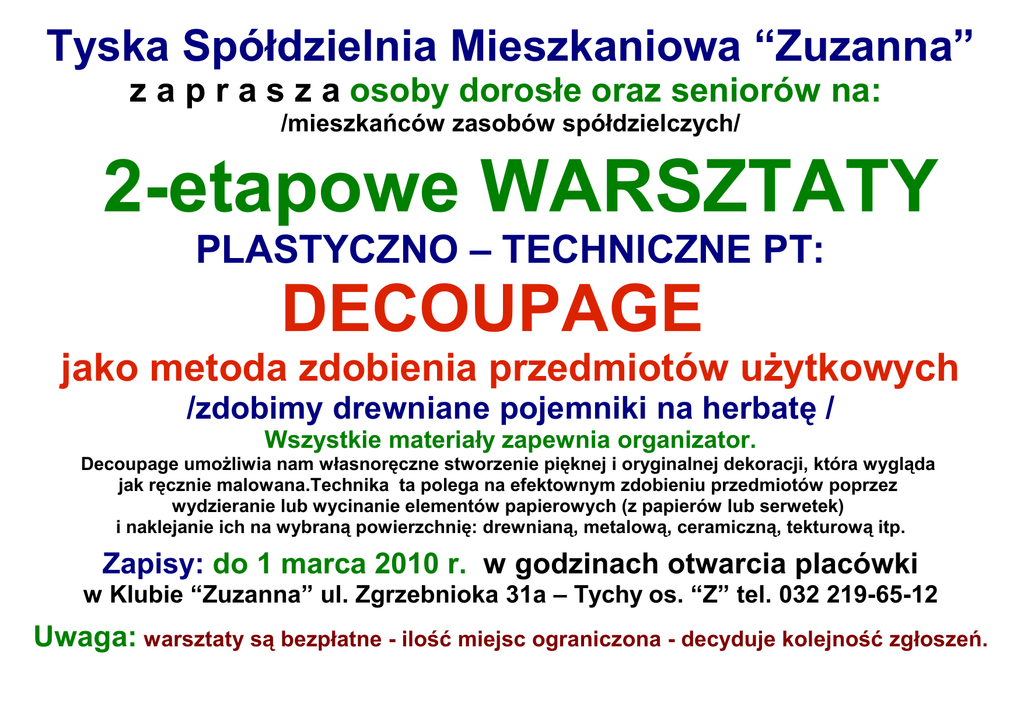Tyska Spółdzielnia Mieszkaniowa “Zuzanna” z a p r a s z a osoby dorosłe oraz seniorów na: /mieszkańców zasobów spółdzielczych/ 2-etapowe WARSZTATY PLASTYCZNO – TECHNICZNE PT: DECOUPAGE jako metoda zdobienia przedmiotów użytkowych /zdobimy drewniane pojemniki na herbatę / Wszystkie materiały zapewnia organizator. Decoupage umożliwia nam własnoręczne stworzenie pięknej i oryginalnej dekoracji, która wygląda jak ręcznie malowana.Technika ta polega na efektownym zdobieniu przedmiotów poprzez wydzieranie lub wycinanie elementów papierowych (z papierów lub serwetek) i naklejanie ich na wybraną powierzchnię: drewnianą, metalową, ceramiczną, tekturową itp. Zapisy: do 1 marca 2010 r. w godzinach otwarcia placówki w Klubie “Zuzanna” ul. Zgrzebnioka 31a – Tychy os. “Z” tel. 032 219-65-12 Uwaga: warsztaty są bezpłatne - ilość miejsc ograniczona - decyduje kolejność zgłoszeń.
