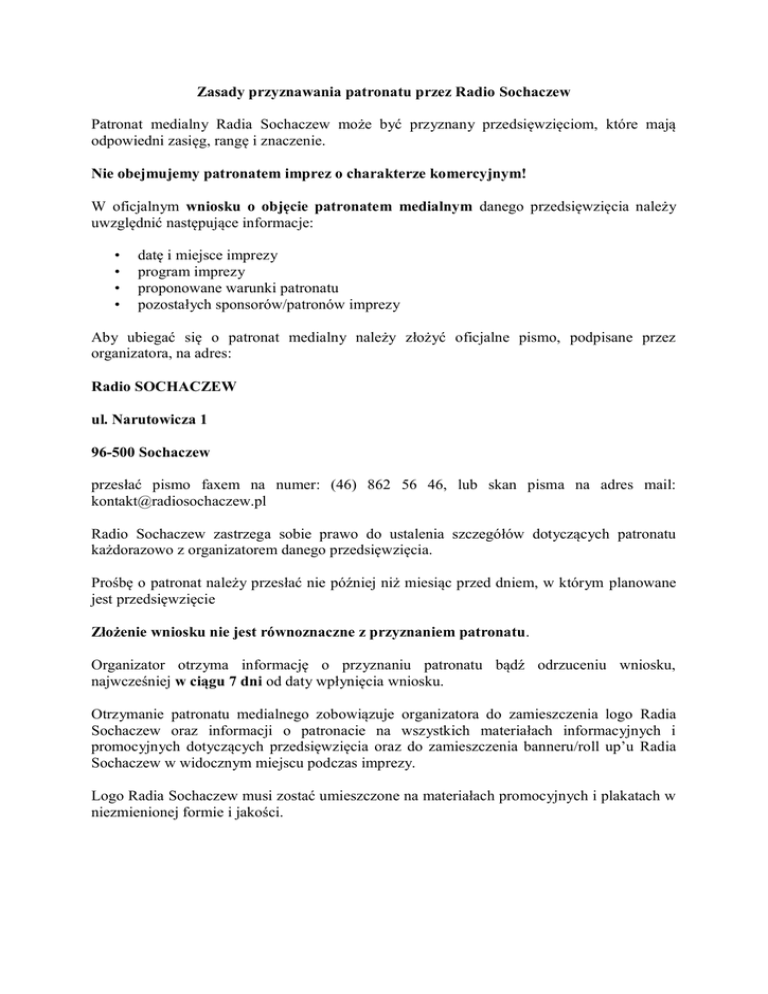 Zasady przyznawania patronatu przez Radio Sochaczew Patronat medialny Radia Sochaczew może być przyznany przedsięwzięciom, które mają odpowiedni zasięg, rangę i znaczenie. Nie obejmujemy patronatem imprez o charakterze komercyjnym! W oficjalnym wniosku o objęcie patronatem medialnym danego przedsięwzięcia należy uwzględnić następujące informacje: • • • • datę i miejsce imprezy program imprezy proponowane warunki patronatu pozostałych sponsorów/patronów imprezy Aby ubiegać się o patronat medialny należy złożyć oficjalne pismo, podpisane przez organizatora, na adres: Radio SOCHACZEW ul. Narutowicza 1 96-500 Sochaczew przesłać pismo faxem na numer: (46) 862 56 46, lub skan pisma na adres mail: [email protected] Radio Sochaczew zastrzega sobie prawo do ustalenia szczegółów dotyczących patronatu każdorazowo z organizatorem danego przedsięwzięcia. Prośbę o patronat należy przesłać nie później niż miesiąc przed dniem, w którym planowane jest przedsięwzięcie Złożenie wniosku nie jest równoznaczne z przyznaniem patronatu. Organizator otrzyma informację o przyznaniu patronatu bądź odrzuceniu wniosku, najwcześniej w ciągu 7 dni od daty wpłynięcia wniosku. Otrzymanie patronatu medialnego zobowiązuje organizatora do zamieszczenia logo Radia Sochaczew oraz informacji o patronacie na wszystkich materiałach informacyjnych i promocyjnych dotyczących przedsięwzięcia oraz do zamieszczenia banneru/roll up’u Radia Sochaczew w widocznym miejscu podczas imprezy. Logo Radia Sochaczew musi zostać umieszczone na materiałach promocyjnych i plakatach w niezmienionej formie i jakości.
