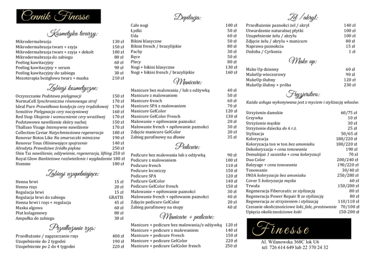 Depilacja: Kosmetyka twarzy: Mikrodermabrazja Mikrodermabrazja twarz + szyja Mikrodermabrazja twarz + szyja + dekolt Mikrodermabrazja do zabiegu Peeling kawitacyjny Peeling kawitacyjny + serum Peeling kawitacyjny do zabiegu Mezoterapia bezigłowa twarz + maska 130 zł 150 zł 180 zł 80 zł 60 zł 90 zł 30 zł 210 zł Zabiegi kosmetyczne: Oczyszczanie Podstawa pielęgnacji 150 zł NormaCell Synchroniczna równowaga stref 170 zł Ideal Pure Prawidłowa kondycja cery trądzikowej 170 zł Sensitive Pielęgnacja cery naczyniowej 160 zł Red Stop Ukojenie i wzmocnienie cery wrażliwej 170 zł Podstawowe nawilżenie skóry suchej 150 zł Thallaso Visage Intensywne nawilżenie 170 zł Collection Caviar Natychmiastowa regeneracja 180 zł Renovar Botox Like Na zmarszczki mimiczne 190 zł Renovar Yeux Olśniewające spojrzenie 140 zł Afrodyta Prawdziwe źródło piękna 250 zł Shin Tai nawilżenie, odżywienie, regeneracja, lifting 250 zł Royal Glow Bankietowe rozświetlenie i wygładzenie 180 zł Homme 180 zł Zabiegi uzupełniające: Henna brwi Henna rzęs Regulacja brwi Regulacja brwi do zabiegu Henna brwi i rzęs + regulacja Maska algowa Płat kolagenowy Ampułka do zabiegu 15 zł 20 zł 15 zł GRATIS 45 zł 60 zł 80 zł 30 zł Przedłużanie rzęs: Przedłużanie / zagęszczanie rzęs Uzupełnienie do 2 tygodni Uzupełnienie po 2 do 4 tygodni 400 zł 190 zł 220 zł Całe nogi Łydki Uda Bikini klasyczne Bikini french / brazylijskie Pachy Ręce Plecy Nogi + bikini klasyczne Nogi + bikini french / brazylijskie Żel /akryl: 100 zł 50 zł 60 zł 50 zł 80 zł 30 zł 50 zł 80 zł 130 zł 160 zł Manicure: Manicure bez malowania / lub z odżywką Manicure z malowaniem Manicure french Manicure SPA z malowaniem Manicure GelColor Manicure GelColor French Malowanie + opiłowanie paznokci Malowanie french + opiłowanie paznokci Zdjęcie manicure GelColor Zabieg parafinowy na dłonie 40 zł 50 zł 60 zł 70 zł 120 zł 130 zł 20 zł 30 zł 20 zł 35 zł Pedicure: Pedicure bez malowania lub z odżywką Pedicure z malowaniem Pedicure french Pedicure leczniczy Pedicure SPA Pedicure GelColor Pedicure GelColor french Malowanie + opiłowanie paznokci Malowanie french + opiłowanie paznokci Zdjęcie pedicure GelColor Zabieg parafinowy na stopy 90 zł 100 zł 110 zł 150 zł 120 zł 140 zł 150 zł 30 zł 40 zł 20 zł 40 zł Manicure + pedicure: Manicure + pedicure bez malowania/z odżywką Manicure + pedicure z malowaniem Manicure + pedicure French Manicure + pedicure GelColor Manicure + pedicure GelColor french 120 zł 140 zł 150 zł 220 zł 250 zł Przedłużenie paznokci żel / akryl Utwardzenie naturalnej płytki Uzupełnienie żelu / akrylu Zdjęcie żelu / akrylu + manicure Naprawa paznokcia Ozdoba / Cyrkonia 140 zł 100 zł 100 zł 80 zł 15 zł 1 zł Make up: Make Up dzienny MakeUp wieczorowy MakeUp ślubny MakeUp ślubny + próba 60 zł 90 zł 120 zł 230 zł Fryzjerstwo: Każda usługa wykonywana jest z myciem i stylizacją włosów. Strzyżenie damskie 60/75 zł Grzywka 10 zł Strzyżenie męskie 30 zł Strzyżenie dziecka do 6 r.ż. 25 zł Stylizacja 50/65 zł Koloryzacja 180/220 zł Koloryzacja ton w ton bez amoniaku 180/220 zł Dekoloryzacja + cena tonowania 190 zł Demakijaż 1 saszetka + cena koloryzacji 70 zł Duo Color 200/240 zł Baleyage + cena tonowania 190/220 zł Tonowanie 30/40 zł INOA koloryzacja bez amoniaku 250/280 zł Cover 5 koloryzacja męska 60 zł Trwała 150/200 zł Regeneracja Fiberceutic ze stylizacją 80 zł Regeneracja Power Repair B ze stylizacją 80 zł Regeneracja ze strzyżeniem i stylizacją 110/118 zł Czesanie okolicznościowe loki, fale, prostowanie 70/100 zł Upięcia okolicznościowe koki 150-200 zł Al. Wilanowska 368C lok U6 tel: 726 614 649 lub 22 370 24 32
