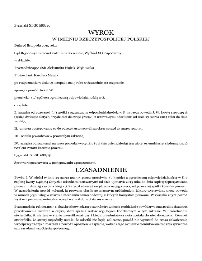 Sygn. akt XI GC 688/15 WYROK W IMIENIU RZECZYPOSPOLITEJ POLSKIEJ Dnia 26 listopada 2015 roku Sąd Rejonowy Szczecin-Centrum w Szczecinie, Wydział XI Gospodarczy, w składzie: Przewodniczący: SSR Aleksandra Wójcik-Wojnowska Protokolant: Karolina Mateja po rozpoznaniu w dniu 19 listopada 2015 roku w Szczecinie, na rozprawie sprawy z powództwa J. W. przeciwko (...) spółce z ograniczoną odpowiedzialnością w S. o zapłatę I. zasądza od pozwanej (...) spółki z ograniczoną odpowiedzialnością w S. na rzecz powoda J. W. kwotę 1 200,39 zł (tysiąc dwieście złotych, trzydzieści dziewięć groszy ) z ustawowymi odsetkami od dnia 13 marca 2015 roku do dnia zapłaty, II. umarza postępowanie co do odsetek ustawowych za okres sprzed 13 marca 2015 r., III. oddala powództwo w pozostałym zakresie, IV. zasądza od pozwanej na rzecz powoda kwotę 183,87 zł (sto osiemdziesiąt trzy złote, osiemdziesiąt siedem groszy) tytułem zwrotu kosztów procesu. Sygn. akt: XI GC 688/15 Sprawa rozpoznawana w postępowaniu uproszczonym. UZASADNIENIE Powód J. W. złożył w dniu 13 marca 2015 r. pozew przeciwko (...) spółce z ograniczoną odpowiedzialnością w S. o zapłatę kwoty 1.481,64 złotych z odsetkami ustawowymi od dnia 13 marca 2015 roku do dnia zapłaty (sprecyzowane pismem z dnia 25 sierpnia 2015 r.). Zażądał również zasądzenia na jego rzecz, od pozwanej spółki kosztów procesu. W uzasadnieniu powód wskazał, iż pozwana płaciła ze znacznym opóźnieniem faktury wystawione przez powoda w ramach jego usług w zakresie mechaniki samochodowej, z których korzystała pozwana. W związku z tym powód wystawił pozwanej notę odsetkową i wezwał do zapłaty roszczenia. Pozwana dnia 13 lipca 2015 r. złożyła odpowiedź na pozew, którą wniosła o oddalenie powództwa oraz podniosła zarzut przedawnienia roszczeń w części, która spełnia zadość regulacjom kodeksowym w tym zakresie. W uzasadnieniu stwierdziła, iż nie jest w stanie zweryfikować czy i kiedy przedmiotowa nota została do niej doręczona. Również stwierdziła, że strony uzgodniły ustnie, że odsetki nie będą naliczane, powód nie wysuwał do czasu zakończenia współpracy żadnych roszczeń z powodu opóźnień w zapłacie, wobec czego aktualnie formułowane żądania sprzeczne są z zasadami współżycia społecznego. Sąd ustalił następujący stan faktyczny: Powód w związku z prowadzoną działalnością gospodarczą wystawił pozwanej faktury Vat nr : 746/11/K, 830/11/K, 947/11/K, 64/12/K, 86/12/K, 346/12/K, 442/12/K, 465/12/K, 586/12/K, 647/12/K, 658/12/K, 667/12/K, 667/12/K, 703/12/K, 824/12/K, 856/12/K, 598/13/K. Wszystkie faktury zostały opłacone z opóźnieniem. Dowód: faktury Vat i wyciągi bankowe k. 50-110 Dnia 26 lipca 2012 r. pozwana przekazała powodowi kwotę 1.607,35 zł, która została zaliczona na poczet należności wynikającej z faktury Vat nr (...). Dowód: wyciąg i pismo k. 38-39 Dnia 2 kwietnia 2014 r. powód wystawił pozwanej notę odsetkową nr : (...), przewidującą następujące naliczenia: - faktura Vat nr (...), od 2011-07-17 do 2012-01-11, dni zwłoki 179, kwota 999,11, odsetki 63,70; - faktura Vat nr (...), od 2011-08-07 do 2012-01-11, dni zwłoki 158, kwota 1 000,89, odsetki 56,32; - faktura Vat nr (...), od 2011-08-07 do 2012-01-13, dni zwłoki 160, kwota 1 027,00, odsetki 58,52; - faktura Vat nr (...), od 2011-09-10 do 2011-10-05, dni zwłoki 26, kwota 467,87, odsetki 4,33; - faktura Vat nr (...), od 2011-09-10 do 2012-01-13, dni zwłoki 126, kwota 222,90, odsetki 10,00; - faktura Vat nr (...), od 2012-01-29 do 2012-01-30, dni zwłoki 2, kwota 426,00, odsetki 0,30; - faktura Vat nr (...) od 2012-02-12 do 2012-03-15, dni zwłoki 33, kwota 1 000,00. odsetki 11,75; - faktura Vat nr (...) od 2012-02-12 do 2012-04-12, dni zwłoki 61, kwota 1 000,00, odsetki 21,73; - faktura Vat nr (...) od 2012-02-12 do 2012-03-08, dni zwłoki 26, kwota 2 165,34, odsetki 20,05; - faktura Vat nr (...) od 2012-02-23 do 2012-04-24, dni zwłoki 62, kwota 1 000,00, odsetki 22,08; - faktura Vat nr (...) od 2012-02-23 do 2012-05-12, dni zwłoki 80, kwota 1 444,00, odsetki 41,14; - faktura Vat nr (...) od 2012-02-23 do 2012-05-29, dni zwłoki 97, kwota 1 000,00, odsetki 34,55; - faktura Vat nr (...) od 2012-06-0l do 2012-07-10, dni zwłoki 38, kwota 1 000,00, odsetki 13,53; - faktura Vat nr (...) od 2012-06-03 do 2012-06-05, dni zwłoki 3, kwota 1 010,80, odsetki 1,08; - faktura Vat nr (...) od 2012-07-07 do 2012-08-13, dni zwłoki 38, kwota 717,69, odsetki 9,71; - faktura Vat nr (...) od 2012-07-07 do 2012-07-25, dni zwłoki 19, kwota 1 607,35, odsetki 10,88; - faktura Vat nr (...) od 2012-07-15 do 2012-09-08, dni zwłoki 56, kwota 800,00, odsetki 15,96; - faktura Vat nr (...) od 2012-07-15 do 2012-09-26, dni zwłoki 74, kwota 200,00, odsetki 5,27; - faktura Vat nr (...) od 2012-07-15 do 2012-09-07, dni zwłoki 55, kwota 2 394,80, odsetki 46,91; - faktura Vat nr (...)/K od 2012-08-31 do 2012-09-26, dni zwłoki 27, kwota 2 000,00, odsetki 19,23; - faktura Vat nr (...) od 2012-08-31 do 2012-10-19, dni zwłoki 50, kwota 1 871,66, odsetki 33,33; - faktura Vat nr (...) od 2012-09-19 do 2012-11-07, dni zwłoki 50, kwota 2 000,00, odsetki 35,62; - faktura Vat nr (...) od 2012-09-19 do 2012-10-19, dni zwłoki 31, kwota 2 163,06, odsetki 23,88; - faktura Vat nr (...) od 2012-09-22 do 2013-01-23, dni zwłoki 124, kwota 3 428,01, odsetki 151,40; - faktura Vat nr (...) od 2012-09-25 do 2012-11-27, dni zwłoki 64, kwota 1 507,96, odsetki 34,37; - faktura Vat nr (...) od 2012-09-25 do 2013-01-08, dni zwłoki 106, kwota 2 000,00, odsetki 75,51; - faktura Vat nr (...) od 2012-10-12 do 2013-02-26, dni zwłoki 138, kwota 1 524,57, odsetki 74,93; - faktura Vat nr (...) od 2012-10-12 do 2013-02-05, dni zwłoki 117, kwota 1 000,00, odsetki 41,67; - faktura Vat nr (...) od 2012-10-12 do 2013-02-08, dni zwłoki 120, kwota 1 000,00, odsetki 42,74; - faktura Vat nr (...) od 2012-11-28 do 2013-03-19, dni 