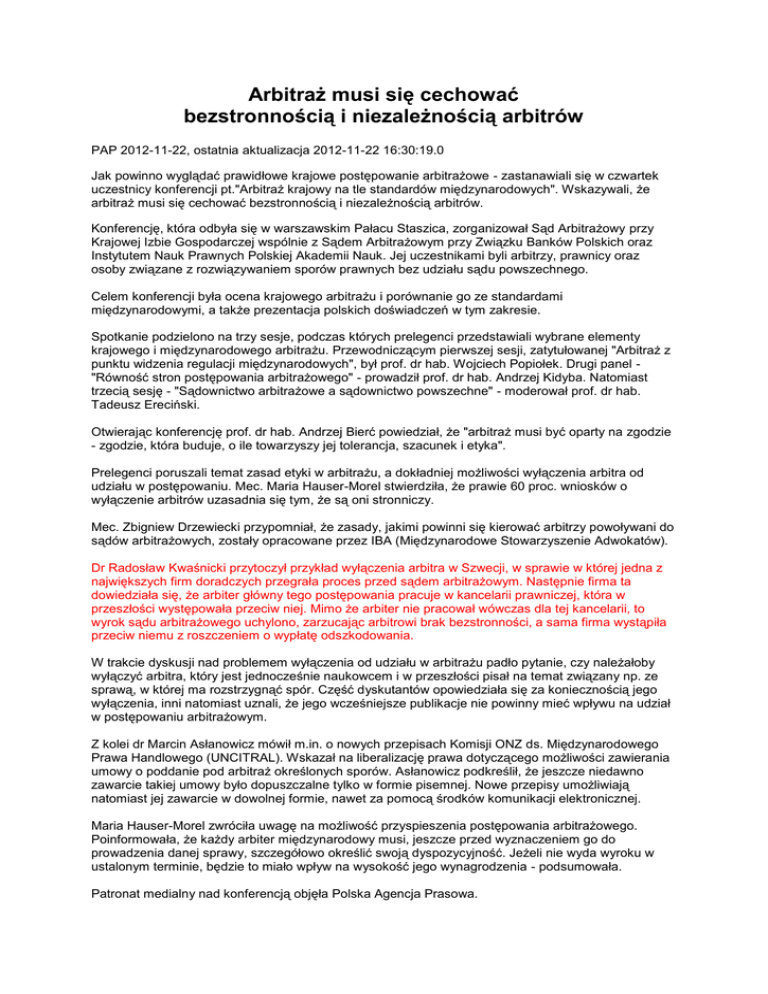 Arbitraż musi się cechować bezstronnością i niezależnością arbitrów PAP 2012-11-22, ostatnia aktualizacja 2012-11-22 16:30:19.0 Jak powinno wyglądać prawidłowe krajowe postępowanie arbitrażowe - zastanawiali się w czwartek uczestnicy konferencji pt."Arbitraż krajowy na tle standardów międzynarodowych". Wskazywali, że arbitraż musi się cechować bezstronnością i niezależnością arbitrów. Konferencję, która odbyła się w warszawskim Pałacu Staszica, zorganizował Sąd Arbitrażowy przy Krajowej Izbie Gospodarczej wspólnie z Sądem Arbitrażowym przy Związku Banków Polskich oraz Instytutem Nauk Prawnych Polskiej Akademii Nauk. Jej uczestnikami byli arbitrzy, prawnicy oraz osoby związane z rozwiązywaniem sporów prawnych bez udziału sądu powszechnego. Celem konferencji była ocena krajowego arbitrażu i porównanie go ze standardami międzynarodowymi, a także prezentacja polskich doświadczeń w tym zakresie. Spotkanie podzielono na trzy sesje, podczas których prelegenci przedstawiali wybrane elementy krajowego i międzynarodowego arbitrażu. Przewodniczącym pierwszej sesji, zatytułowanej "Arbitraż z punktu widzenia regulacji międzynarodowych", był prof. dr hab. Wojciech Popiołek. Drugi panel "Równość stron postępowania arbitrażowego" - prowadził prof. dr hab. Andrzej Kidyba. Natomiast trzecią sesję - "Sądownictwo arbitrażowe a sądownictwo powszechne" - moderował prof. dr hab. Tadeusz Ereciński. Otwierając konferencję prof. dr hab. Andrzej Bierć powiedział, że "arbitraż musi być oparty na zgodzie - zgodzie, która buduje, o ile towarzyszy jej tolerancja, szacunek i etyka". Prelegenci poruszali temat zasad etyki w arbitrażu, a dokładniej możliwości wyłączenia arbitra od udziału w postępowaniu. Mec. Maria Hauser-Morel stwierdziła, że prawie 60 proc. wniosków o wyłączenie arbitrów uzasadnia się tym, że są oni stronniczy. Mec. Zbigniew Drzewiecki przypomniał, że zasady, jakimi powinni się kierować arbitrzy powoływani do sądów arbitrażowych, zostały opracowane przez IBA (Międzynarodowe Stowarzyszenie Adwokatów). Dr Radosław Kwaśnicki przytoczył przykład wyłączenia arbitra w Szwecji, w sprawie w której jedna z największych firm doradczych przegrała proces przed sądem arbitrażowym. Następnie firma ta dowiedziała się, że arbiter główny tego postępowania pracuje w kancelarii prawniczej, która w przeszłości występowała przeciw niej. Mimo że arbiter nie pracował wówczas dla tej kancelarii, to wyrok sądu arbitrażowego uchylono, zarzucając arbitrowi brak bezstronności, a sama firma wystąpiła przeciw niemu z roszczeniem o wypłatę odszkodowania. W trakcie dyskusji nad problemem wyłączenia od udziału w arbitrażu padło pytanie, czy należałoby wyłączyć arbitra, który jest jednocześnie naukowcem i w przeszłości pisał na temat związany np. ze sprawą, w której ma rozstrzygnąć spór. Część dyskutantów opowiedziała się za koniecznością jego wyłączenia, inni natomiast uznali, że jego wcześniejsze publikacje nie powinny mieć wpływu na udział w postępowaniu arbitrażowym. Z kolei dr Marcin Asłanowicz mówił m.in. o nowych przepisach Komisji ONZ ds. Międzynarodowego Prawa Handlowego (UNCITRAL). Wskazał na liberalizację prawa dotyczącego możliwości zawierania umowy o poddanie pod arbitraż określonych sporów. Asłanowicz podkreślił, że jeszcze niedawno zawarcie takiej umowy było dopuszczalne tylko w formie pisemnej. Nowe przepisy umożliwiają natomiast jej zawarcie w dowolnej formie, nawet za pomocą środków komunikacji elektronicznej. Maria Hauser-Morel zwróciła uwagę na możliwość przyspieszenia postępowania arbitrażowego. Poinformowała, że każdy arbiter międzynarodowy musi, jeszcze przed wyznaczeniem go do prowadzenia danej sprawy, szczegółowo określić swoją dyspozycyjność. Jeżeli nie wyda wyroku w ustalonym terminie, będzie to miało wpływ na wysokość jego wynagrodzenia - podsumowała. Patronat medialny nad konferencją objęła Polska Agencja Prasowa.